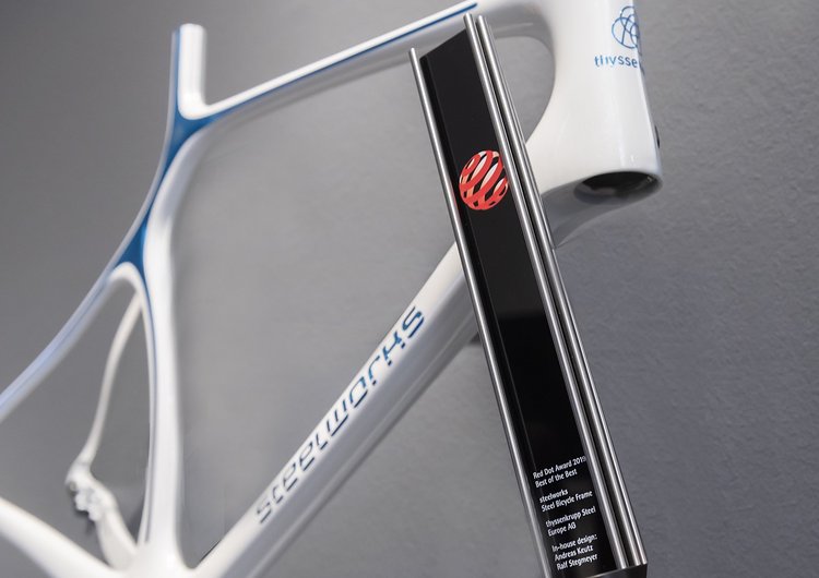 Ist das die Zukunft des Stahlrenners? Als Steelworks Rennrad kommt ein High-tech Stahlrahmen von Thyssenkrupp auf den Markt. Das Design bricht radikal mit der klassischen Stahlrohrtradition und wurde vor kurzem mit dem Red Dot Design Award ausgezeichnet. Hier die Infos zum innovativen Stahlrahmen.