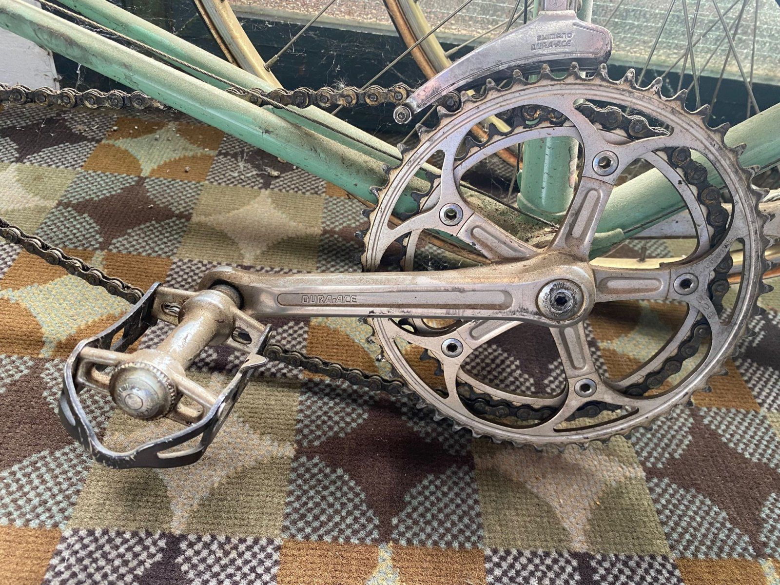 Bis auf eine fehlende Staubkappe der Pedale und Haken samt Riemen komplett und