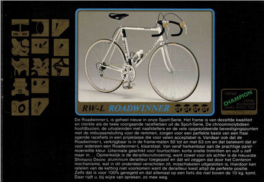 Hallo Miki, wie gesagt, Du findest es im 1981er Katalog als Modell Roadwinner L, daneben gab es noch das normale Roadwinner ohne "L". Hauptunterschied ist das Rohrmaterial : das L ist aus CrMo-Tange Stahl, das Roadwinner ohne "L" ist einfacher Mangan-Stahl.