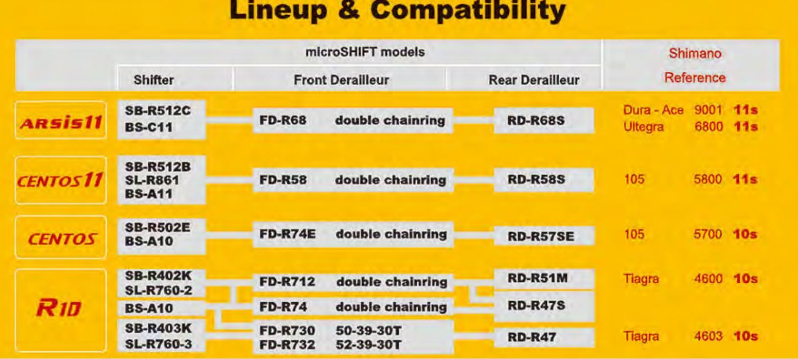 Die alten Microshift 10-Fach Schalthebel (Wäscheleine) bedienten sich einer abgewandelten Shimano Schaltlogik und sind mit allen Shimano 10-Fach Schaltwerken kompatibel mit Ausnahme der Tiagra 4700.