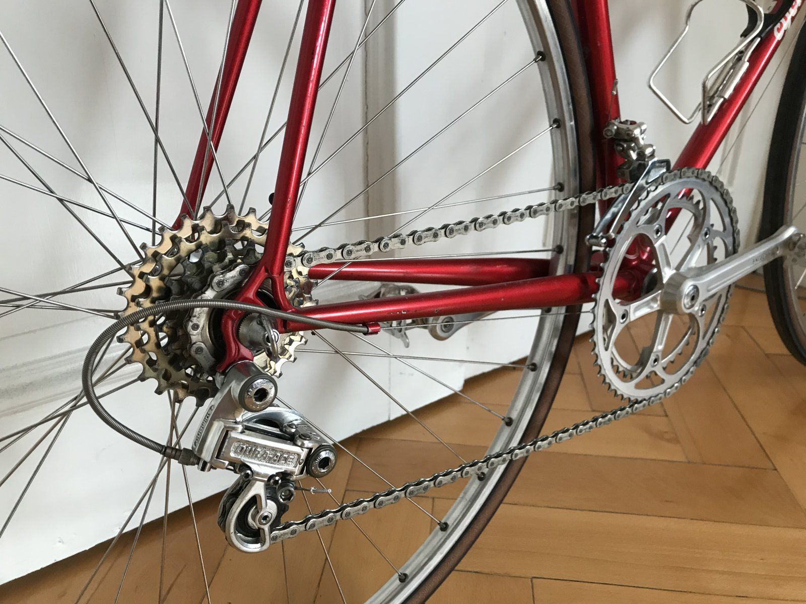 Bei der Kette hatte ich anfangs eine GT7 in weißer Verpackung gewählt, da ich die Version für time correct hielt. Jedoch war deren Schaltverhalten so "knochig", dass ich aus meinem Fundus eine GT7 in grauer Verpackung wählte, welche ganz offensichtlich jünger war. Deren Breite ist tatsächlich 1/10mm schmaler als jene der vorgenannten Kette, entscheidend für die Schaltperformance scheinen aber die abgeschrägten Kanten der Außenglieder zu sein, was die ältere Version so nicht besitzt.