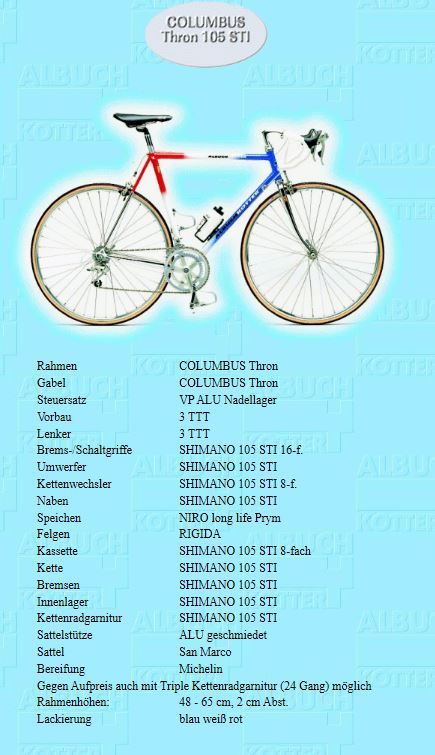 So heute habe ich mein Kotter zum örtlichen Zweirad-Mechaniker gebracht. Das Geschäft war mir von einem begeisterten RR-Kollegen empfohlen worden und ich hatte auch gleich einen sehr positiven Eindruck von dem Mechanikus. Er ist selber großer Rennrad-Fan......nun will ich nicht auf den Putz hauen, denn mein Kotter ist vermutlich nur ein Einstiegsmodell nach euren Diagnosen , aber der Meister hatte Spaß anne Backen, als er das bike sah und rief schon von weitem "Oh, ein Albuch Kotter - schön mal wieder was vernünftiges zu sehen !"