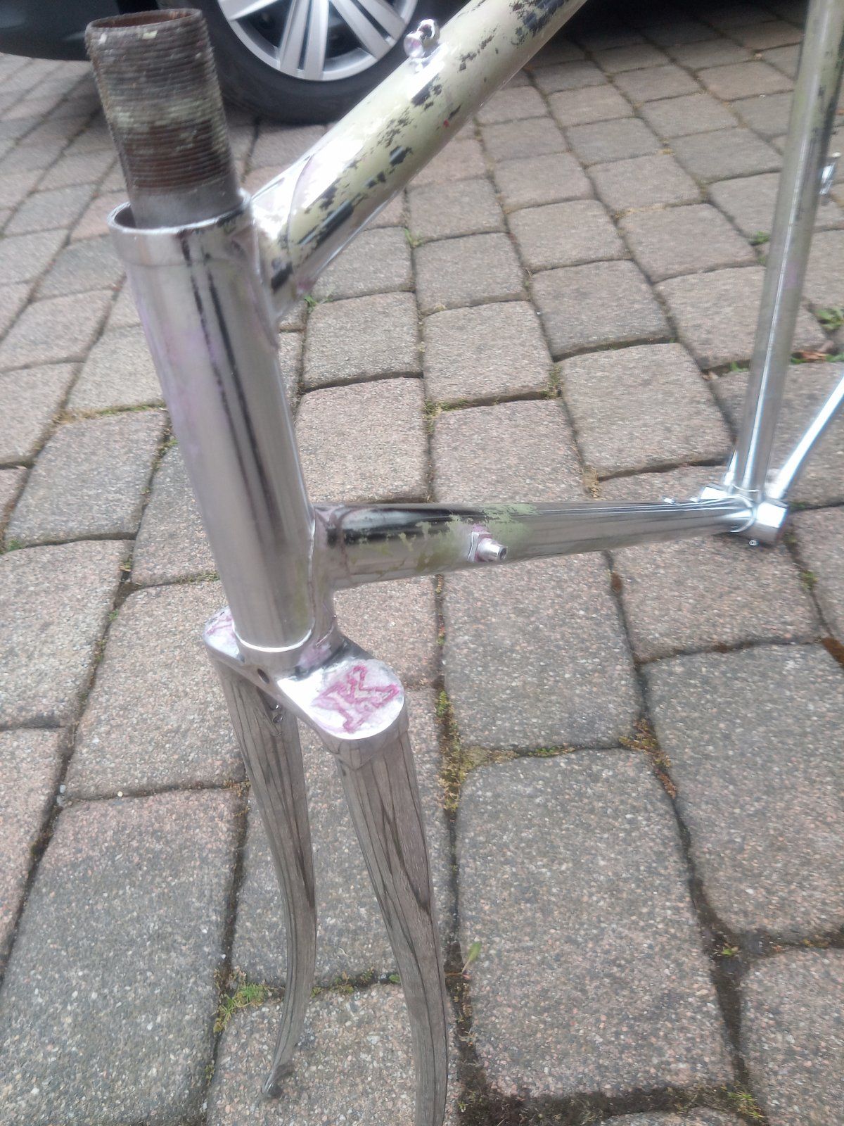 Nun habe ich blind einen Kottor`s Rahmen gekauft. Er war überlackiert und weist nach dem Abbeizen kein Rohrsatz Decal auf.