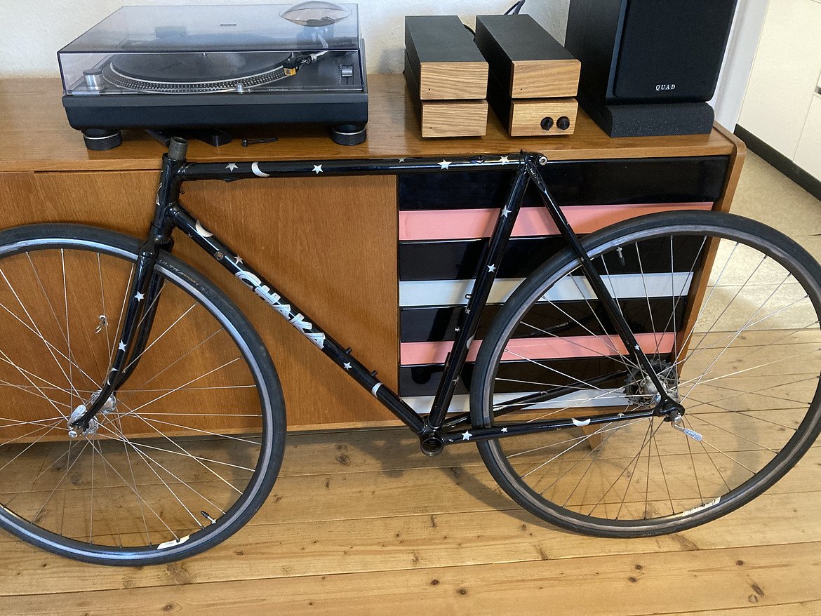 Umlackieren in Silber mit schwarzem Mond und SternenKennt man das? Eigentlich möchte man sich ein Alltagsrad mit vorhandenen Teilen zusammenbauen. Man sucht nur noch einen Rahmen. Zu langweilig sollte er nicht sein, aber auch nicht zu teuer für den Einsatzzweck: In die Arbeit fahren.