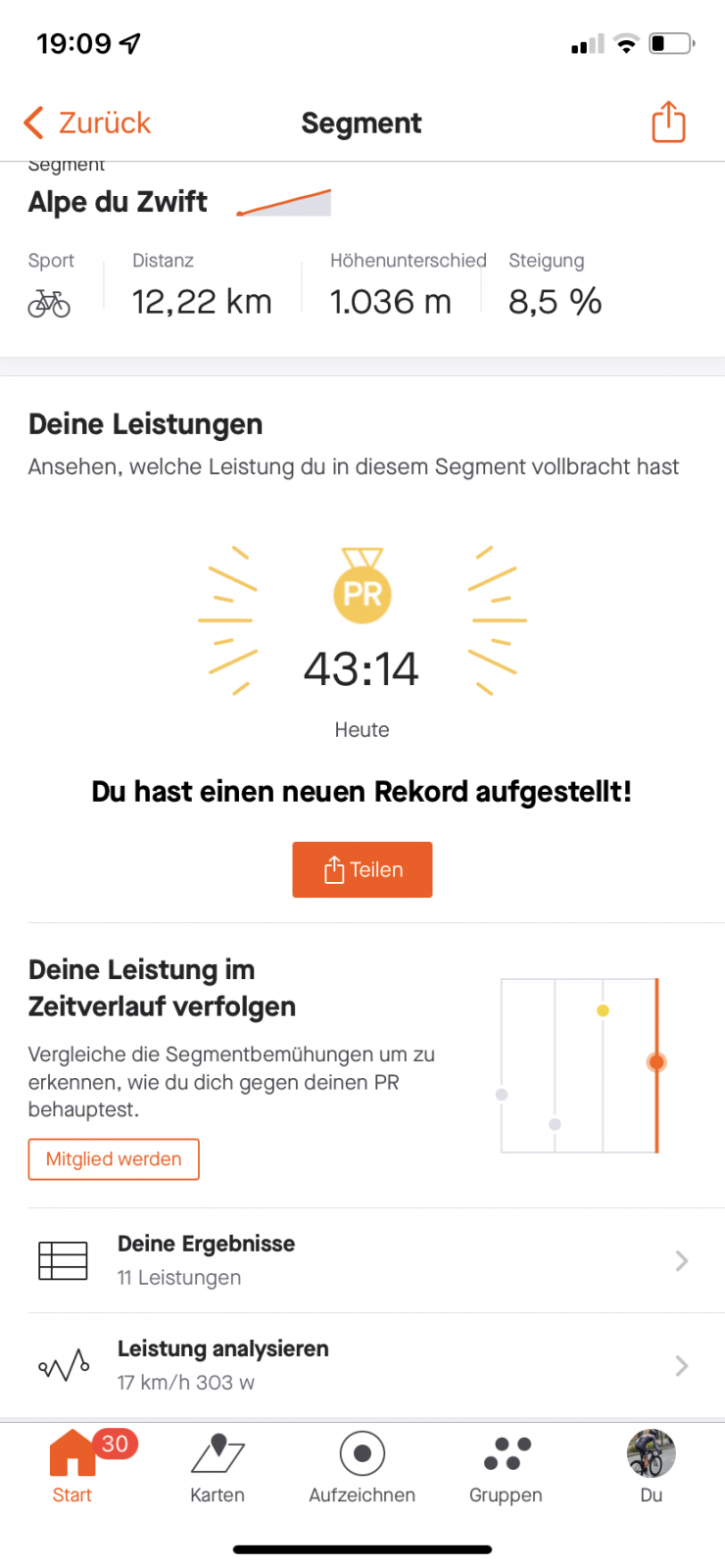 Ich nutze Zwift sehr XP-orientiert, daher meist Workouts die Alpe hoch, Glücksrad und in freier Fahrt runter rollen. Die Rekorde sind aber natürlich immer in freier Fahrt entstanden, Workouts haben dafür zuviele Erholphasen :D Aktuell daher keine Alpe sondern immer Tour of Watopia :D