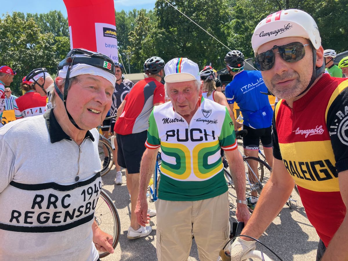 Legenden unter sich: links der ehemalige Radsport-Amateur Gottfried Mayer (81 Jahre) aus Regensburg, der mit 14 Jahren dem Radrennclub (RRC) 1949 Regensburg beitrat (ging später in den ESV 1927 über) und zahlreiche (Jugend-) Siege erzielte und siebenmal hintereinander bayerischer Bergmeister war.