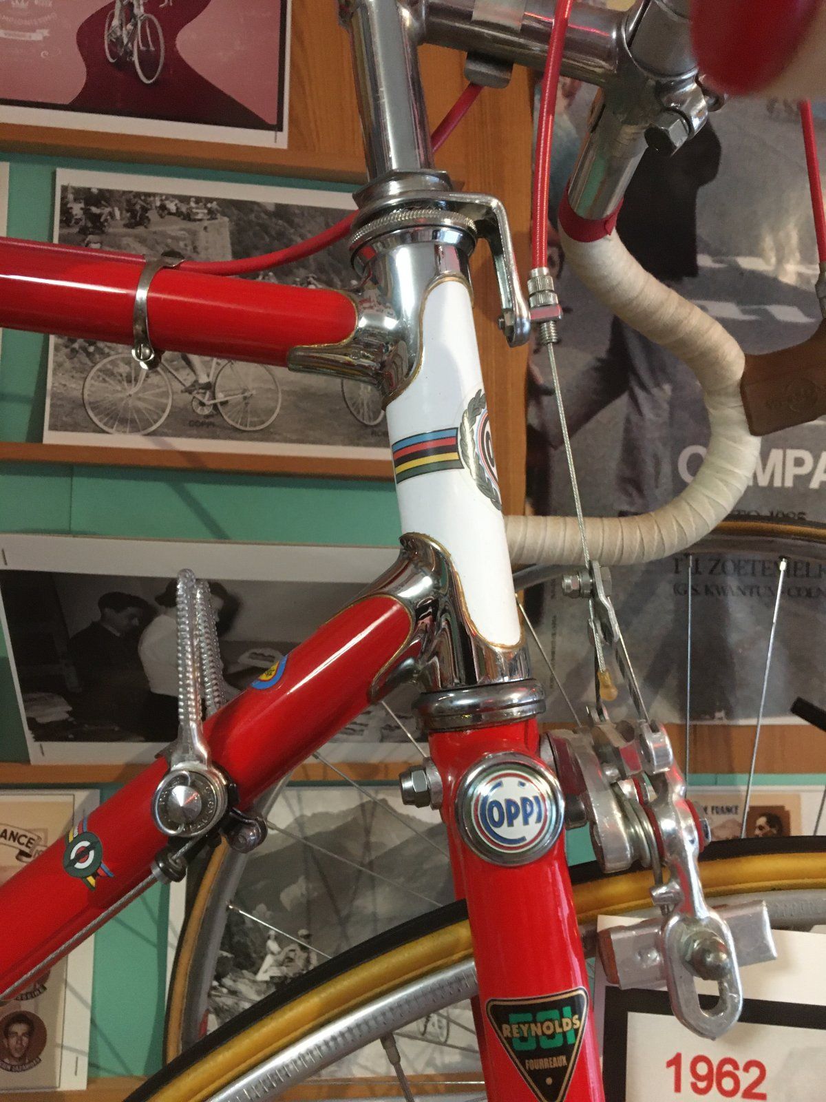 Coppi ist 1960 verstorben und ab 1962 - so der Sammler - wurden die ersten Rennräder in Italien unter dem Label Coppi gebaut . Er hat einige dieser Coppi Räder der ersten/frühen Prodektionsjahre in seiner Sammlung . Hier das älteste seiner Sammlung . Allein der belgische TITAN Vorbau wäre schon eine Sünde wert.