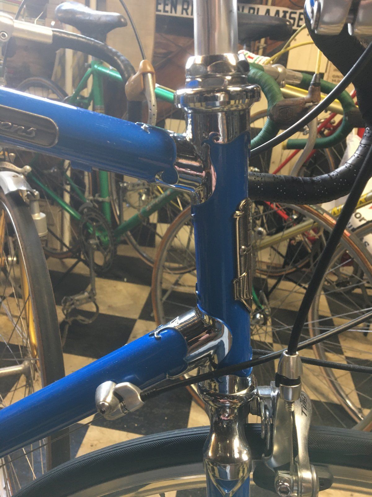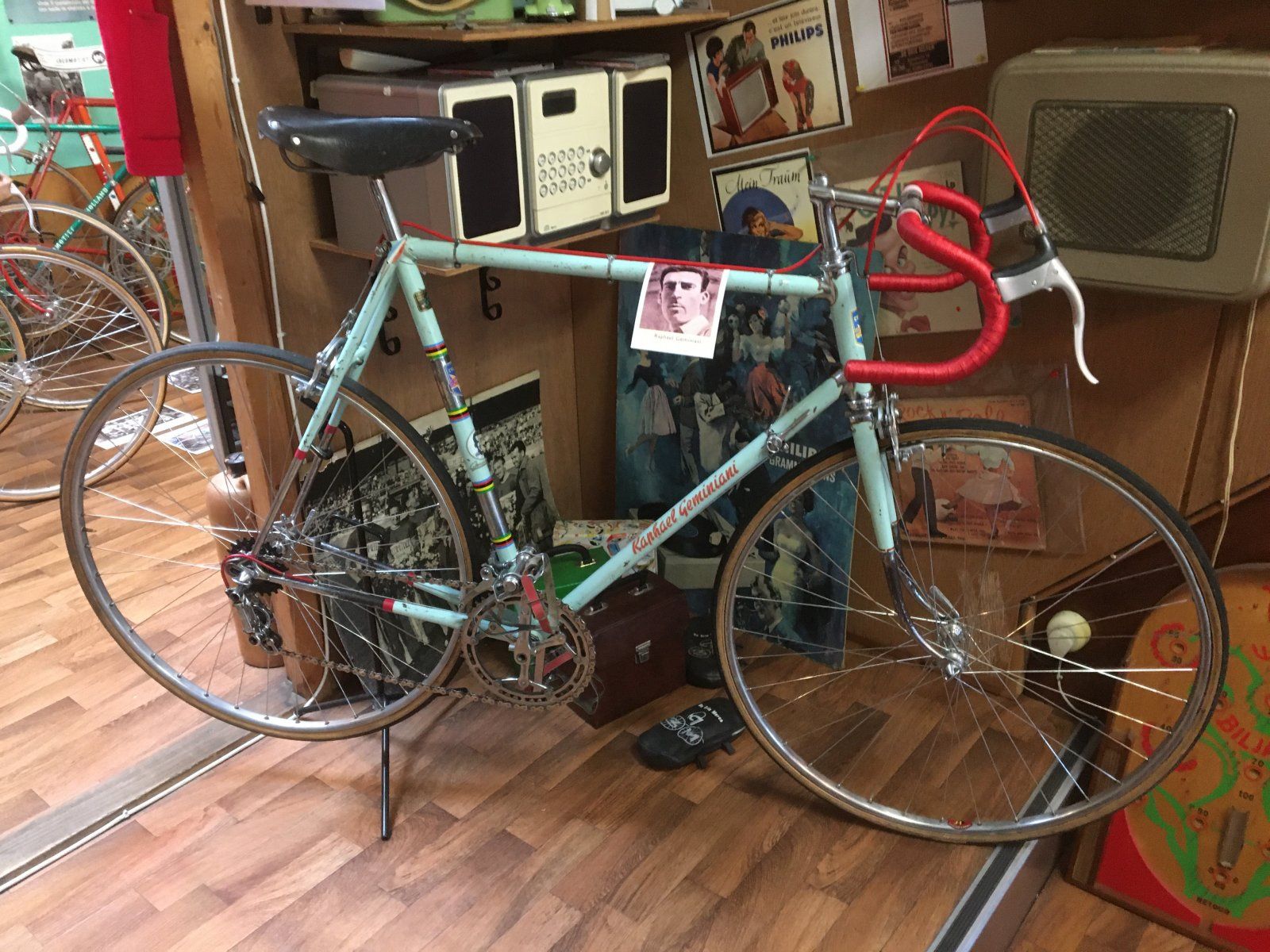 Dann stehen dort auch noch viele einzelne schöne italienische Rennräder , die wohl lokalen und sehr seltenen Anspruch haben . Hier eines der schönsten , das ich entdeckt habe. Ein Raphael Geminiani . Ob es der Name des Rennfahrers oder des Löters ist , kann ich nicht sagen . Ein Celeste der anderen Art .