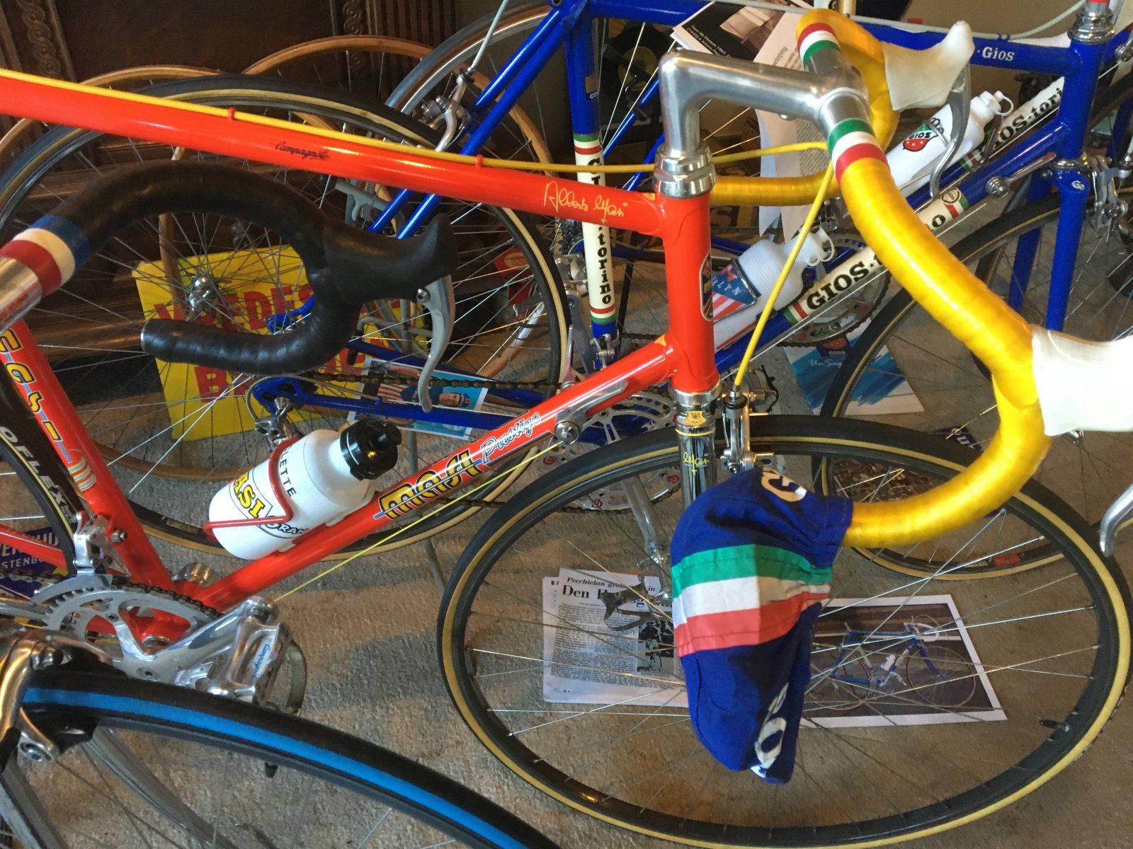 Also kein Mangel an den Gios und Masi und und und und . Dazu viele zeitgenössische Trikots , Kappen , Bidons und vieles mehr .
