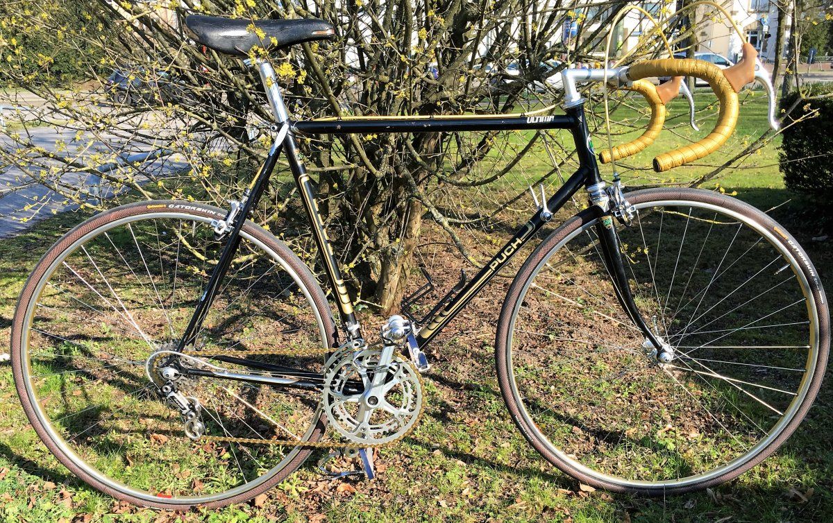 Das Deda Lenkerband scheint ja hier allgemein zu gefallen. Vielleicht bin ich ja der einzige, dem das vorkommt wie Carbonfelgen am Bauer Weltmeister? Ich wollte es nur mal erwähnt haben. Sonst ein sehr elegantes Rad (auch mit den Reifen und der Kette), mit schwarzem Lenkerband fänd ich es halt wesentlich schöner.Das Puch Ultima auf der Jungfernfahrt- nur noch wenige Korrekturen und es fertig für die Velo Veritas.