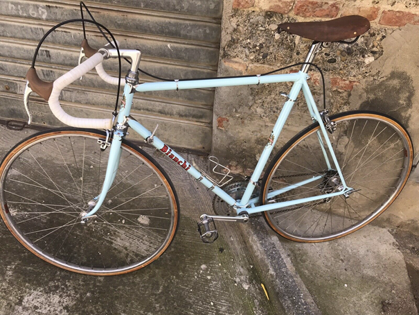 Ihr Bianchi 999410 wird im Register der Bianchi-Rennabteilung im Jahr 1967 gemeldet und für den Parmenser Rennfahrer Gualazzini gebaut, der im Salvarani Team fuhr. Die genaue Messung von der Mitte des Tretlagers bis zum Ende des im Register angegebenen Sattelknotens ist cm. 58,5. Der Fahrer lebt noch, so dass er das Fahrrad immer erkennen kann, auch wenn es jetzt falsch montiert ist.