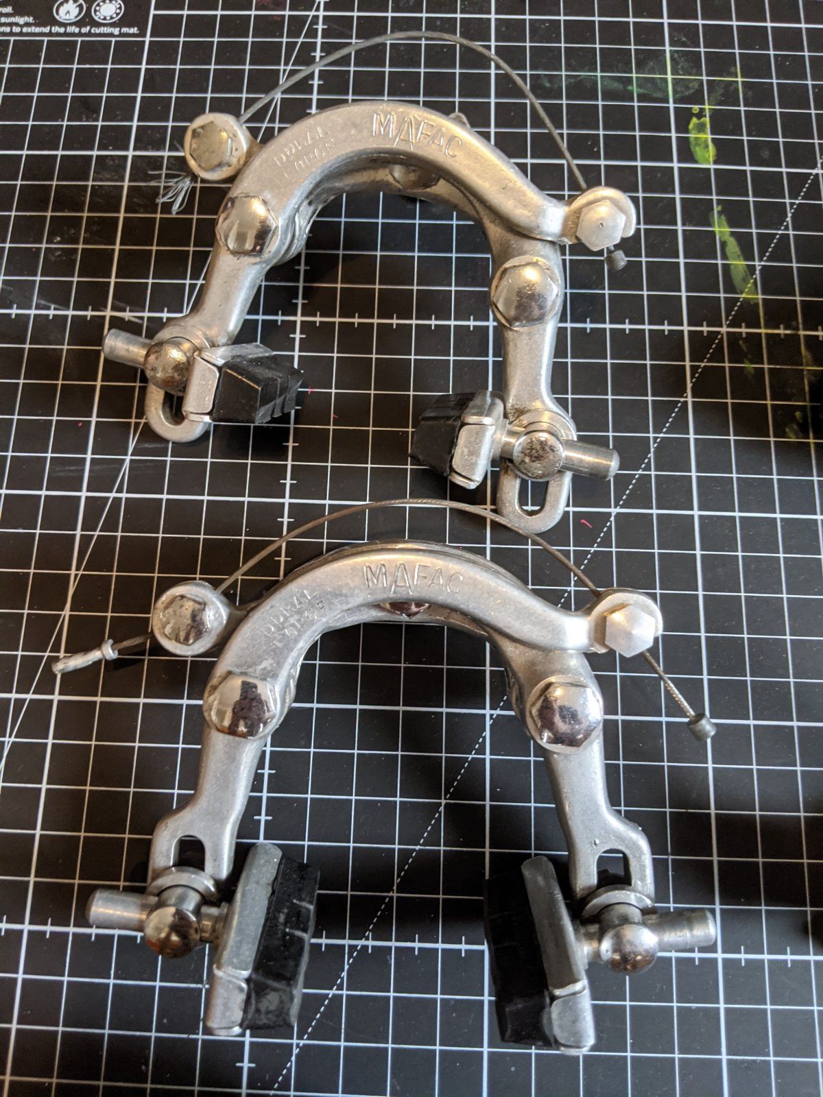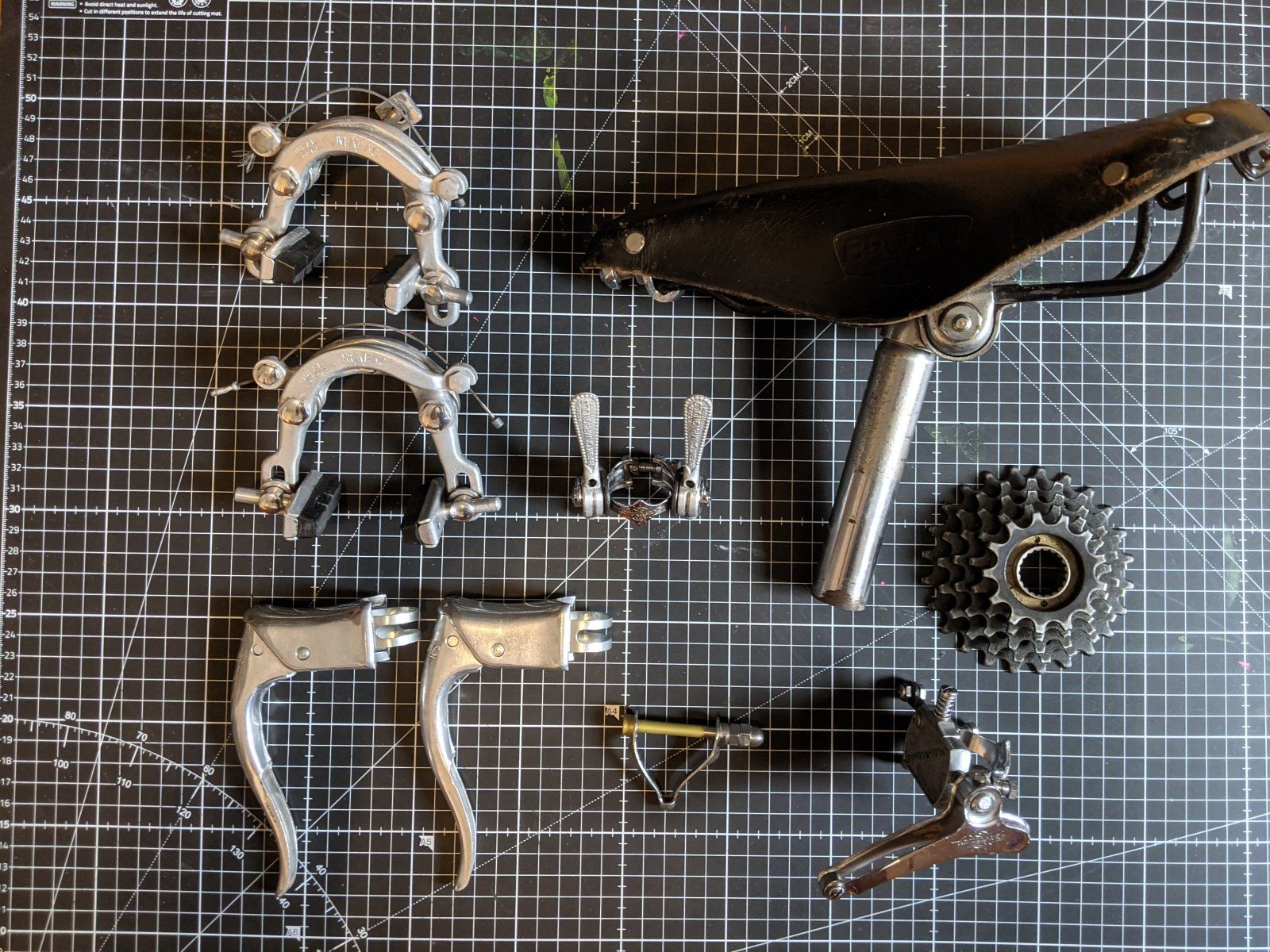 Jetzt mal eine erste Bestandsaufnahme nach erster Reinigung gemacht.Die abgebildeten Teile scheinen alle noch original zu sein und sollen wieder montiert werden. Die Bremshebel habe ich noch gehabt und sollten bestens zu den Mafac Bremsen passen.