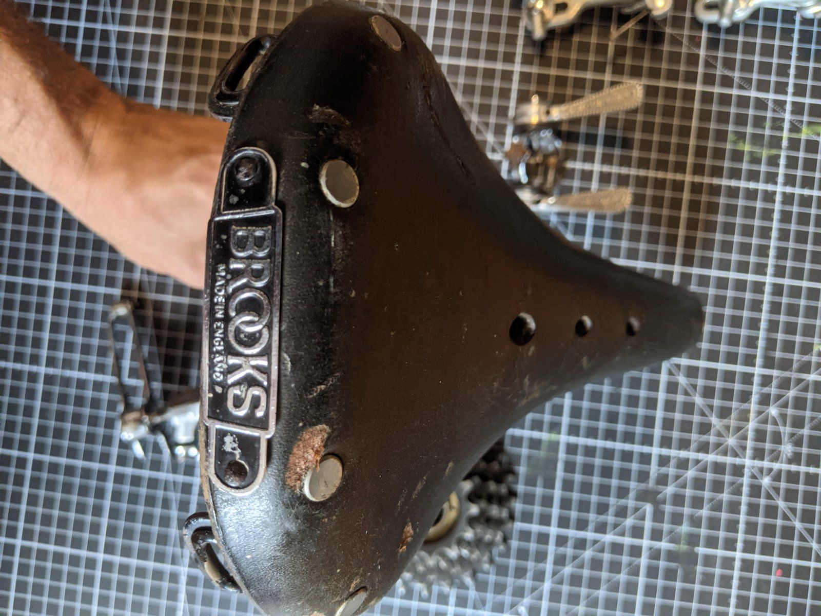 grosses Brooks Logo könnte ein frühes Modell sein. Bei manchen Jahrgängen ist auf der Unterseite des Sattelgestells quasi auf der Höhe der Rückseite zum Brooks Schild eine Jahreszahl eingeschlagen.