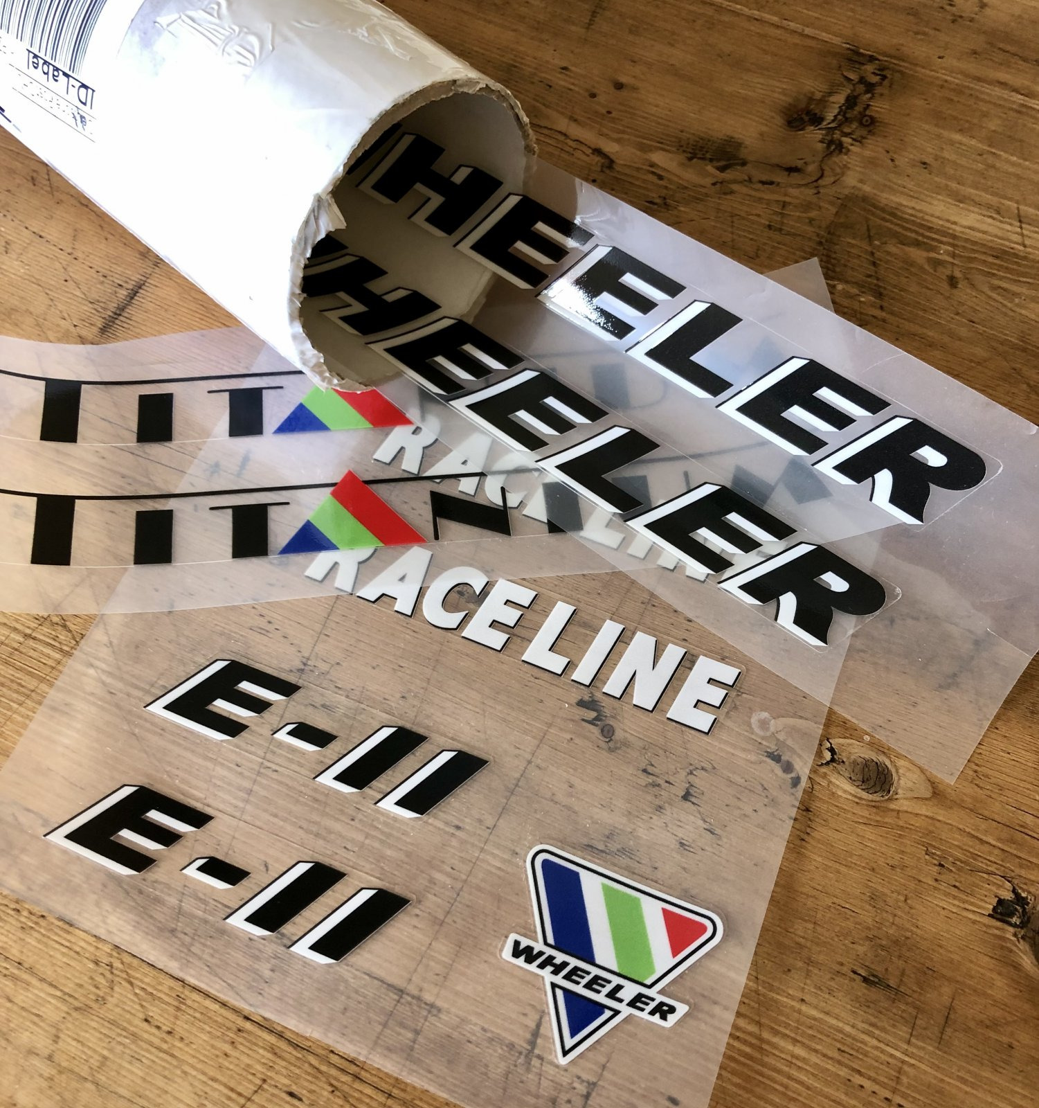 Ist beim Nachwuchs-Rad eventuell eine mit YW beginnende Rahmennummer unter dem Tretlagergehäuse oder eine Rahmengröße innen im linken Ausfallende eingeschlagen? Bei meinem leider vollständig entlabelten Exemplar gehe ich gerade den Weg "rückwärts" von einer modernen zur originalen Ausstattung (hier ist ein Link zum 94er-Katalog: https://www.retrobike.co.uk/archive/1994-wheeler-catalogue-german.878/).Heute kam Post aus Slowenien. Ein Foristi aus dem MTB Forum hat das Talent Decals nach Fotos, oder Katalogscans auszuarbeiten und bei einer benachbarten Druckerei drucken zu können. Da mein Wheeler Titan so ganz ohne Decals doch etwas arg nackt dastand, war der Junge quasi meine Rettung. Und was soll ich sagen: Tolle Arbeit, hat er geleistet.