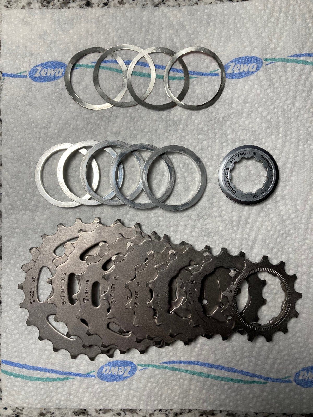 Finde ich spannend welche Lösungen zur Anwendung kamen. Die Ringe sind akkurat aus dem Blech ausgeschnitten. Da hat sich Jemand richtig Mühe gemacht die Ritzelabstände der Shimano-Kassette für die Ergo-Schaltwege zu vergrößern.