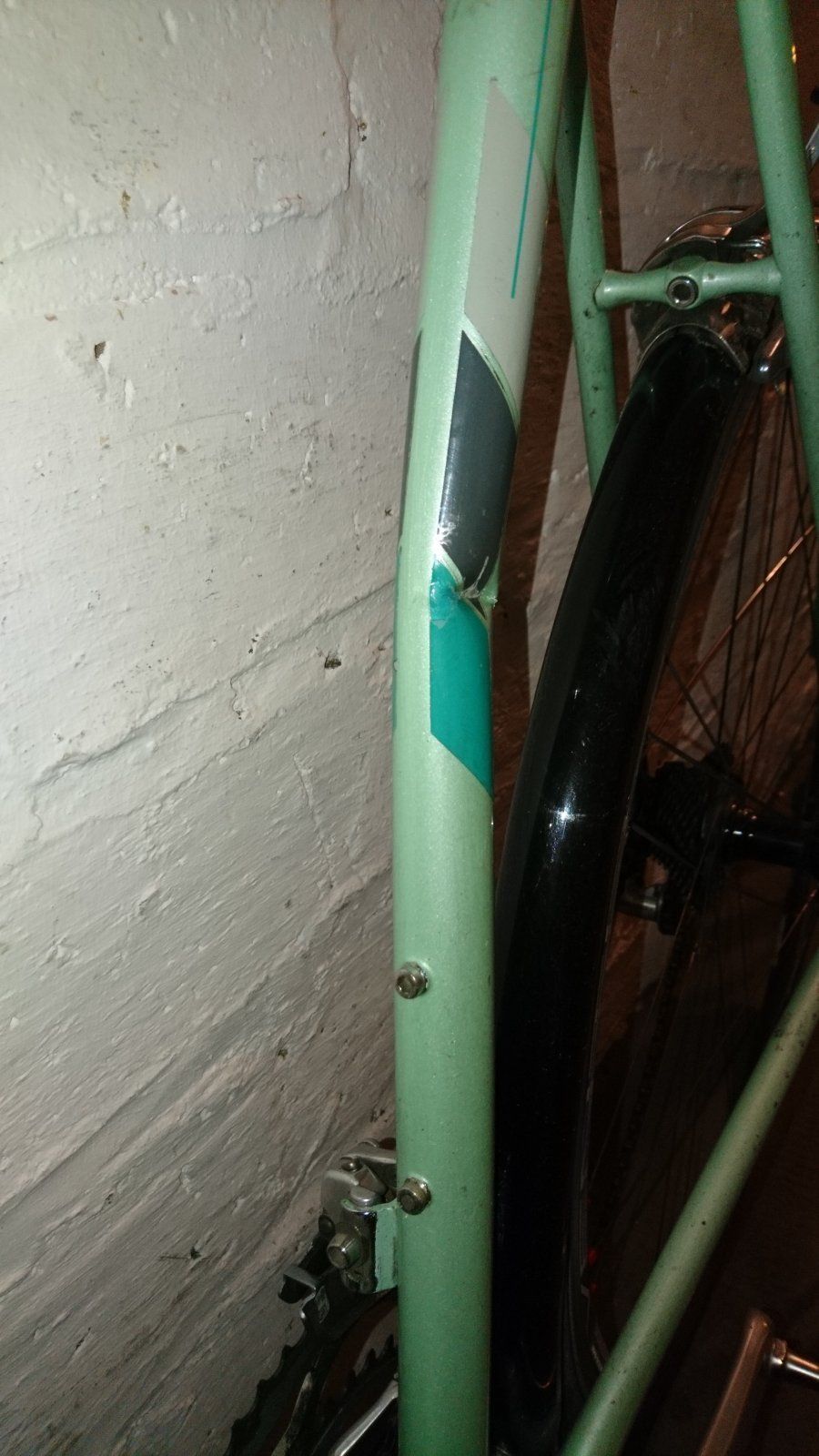 Inzwischen geht es mir schon wieder sooo gut, dass ich drüber nachdenke, mir ein neues Rad aufzubauen, was ich dann in ein paar Monaten auch wieder benutzen kann. Das Rad wird dann wieder den täglichen Weg zur Arbeit und sonstige alltägliche Verrichtungen, aber auch Trainingsrunden absolvieren müssen, und zwar immer dann, wenn es nass ist oder werden könnte. Daher sind Licht und Schutzbleche gesetzt. Auch der Aufbau mit Campa-11fach ist gesetzt. Ich habe noch zwei "Ersatzrahmen" immer Keller, ein Rekord 920, was dem hier extrem nahe kommt. Fotos hab ich leider keine, aber es ist eins der wenigen aus Formula one Rohren, die meisten sind nur aus Formula two. Es hat die gleiche Farbe, die gleiche Geo, wiegt fast aufs Gramm genau das Gleiche ( bis auf die Gabel, die ist deutlich schwerer). Vorteil: Es hat die etwas älteren Decals mit den Flügeln und die Gipiemme Ausfaller, in die ich die Schutzbleche gleich einschrauben könnte. Das wäre also ein Aufbau unter ausschließlichem Austausch der defekten Teile und das neue Rad würde quasi wie das alte aussehen. Ach ja, der Anlötumwerfer müsste eine Schelle bekommen.