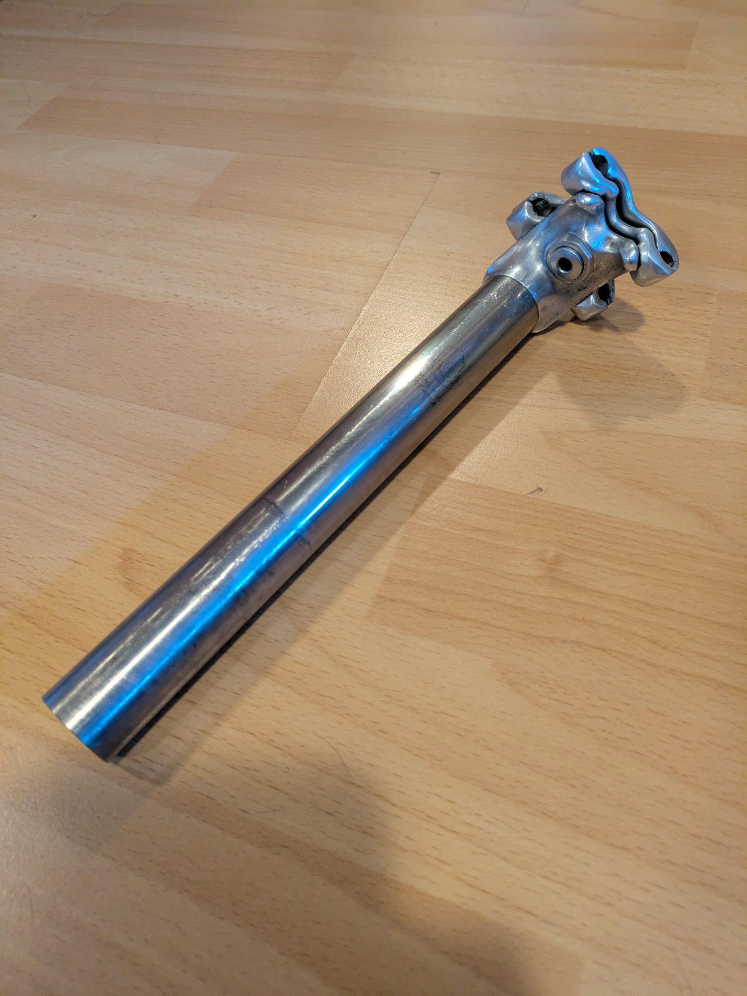 Ermutigt hierdurch bin ich an die gleiche Stütze auch mit etwas Schleifvlies 7447 - die Kratzer sind jetzt zwar viel besser, aber die Oberfläche ist deutlich matter geworden. Im Vergleich mit einer Stütze im Originalzustand ist das ziemlich deutlich: