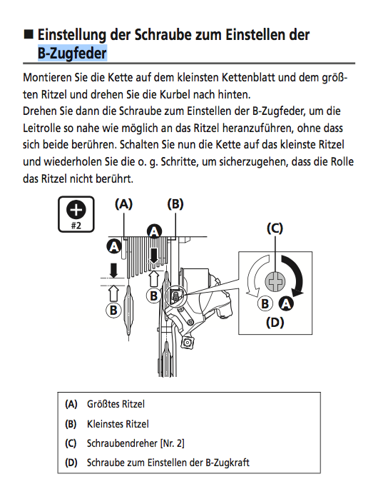was macht den diese Schraube (B-Zugfeder) eigentlich? Ich habe das Shimano Manual gelesen. Es sollte der Abstand zur Umlenkrolle sein, oder? Aber ich seh bei meinem Ultegra 6800 keinen Unterschied. Ich kann in beide Richtungen drehen wie ich will.