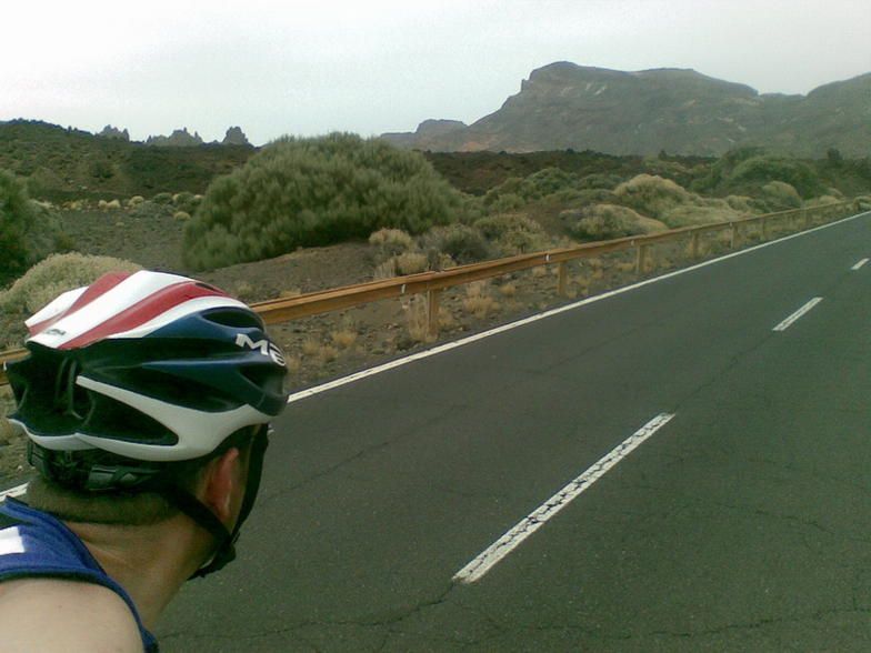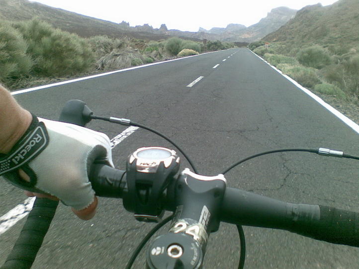 Teleféricostation am Teide. Jetzt machen sich die dünne Luft, der Bauch und vor allem das nackenmuskulaturbedingte Trainingspensum von unglaublichen 90 Kilometern in den letzten fünf Wochen zusehend mehr bemerkbar. (Achso, das kleine Kettenblatt habe ich schon vorher genutzt). Die letzten Höhenmeter über den Parkplatz, vorbei an übergewichtigen und krebsroten (Wieso hat denen noch keiner gesagt, dass es Sonnenschutzmittel gibt?) Briten, Jack Wolfskin bekleideten Deutschen und applaudierenden Spaniern zur Seilbahnstation auf 2350 Hm. Hier hört der Asphalt auf. Frei nach dem „der Berg ist da zu Ende wo der Asphalt aufhört“ noch ein Photo machen lassen und wieder zurück.
