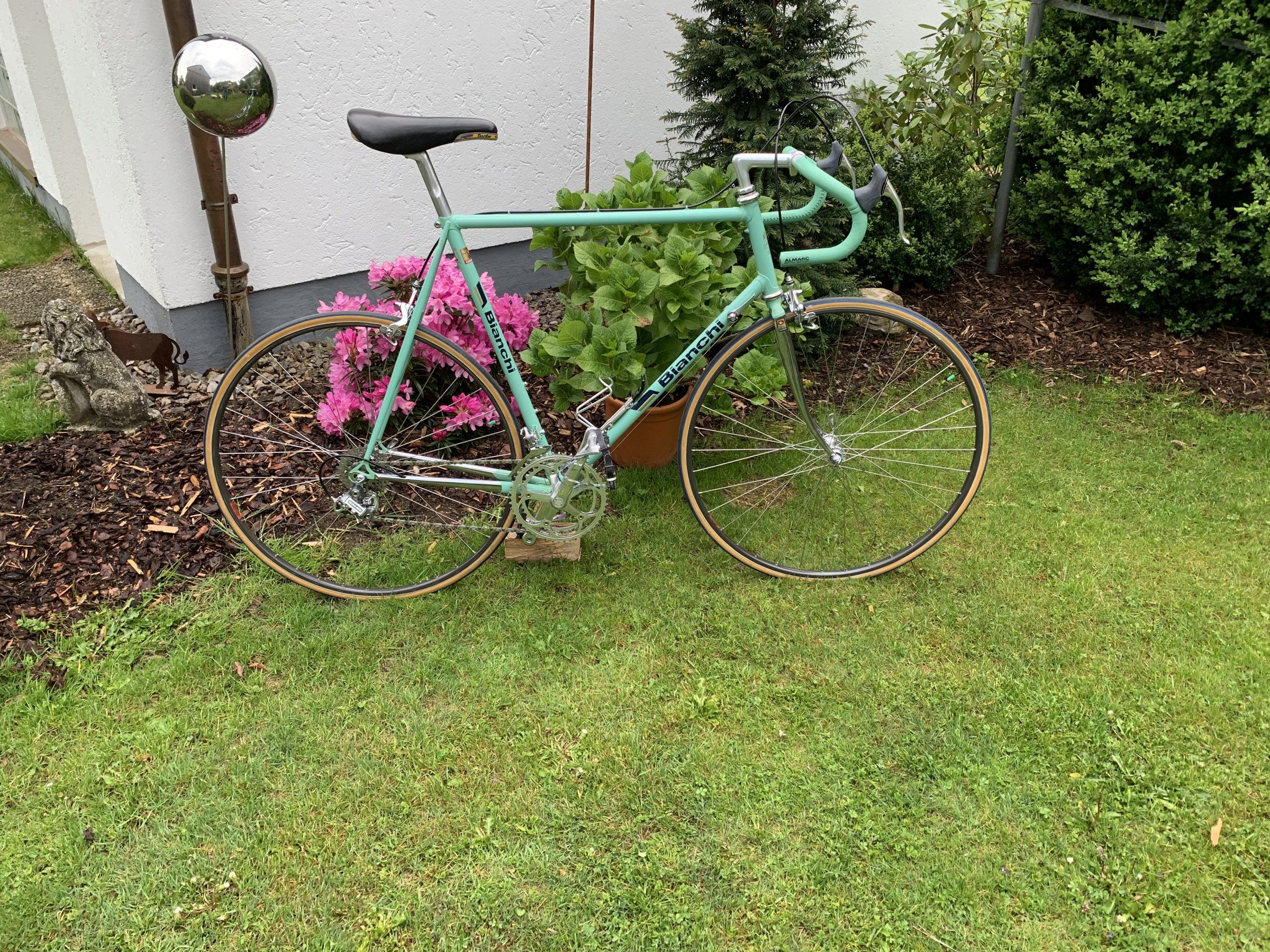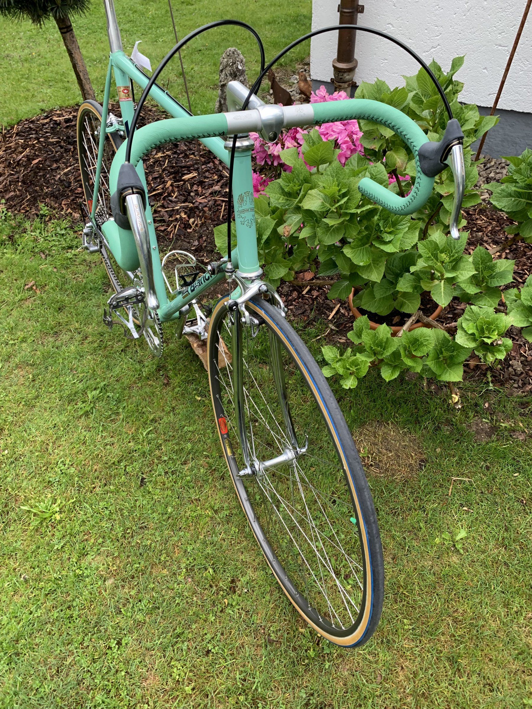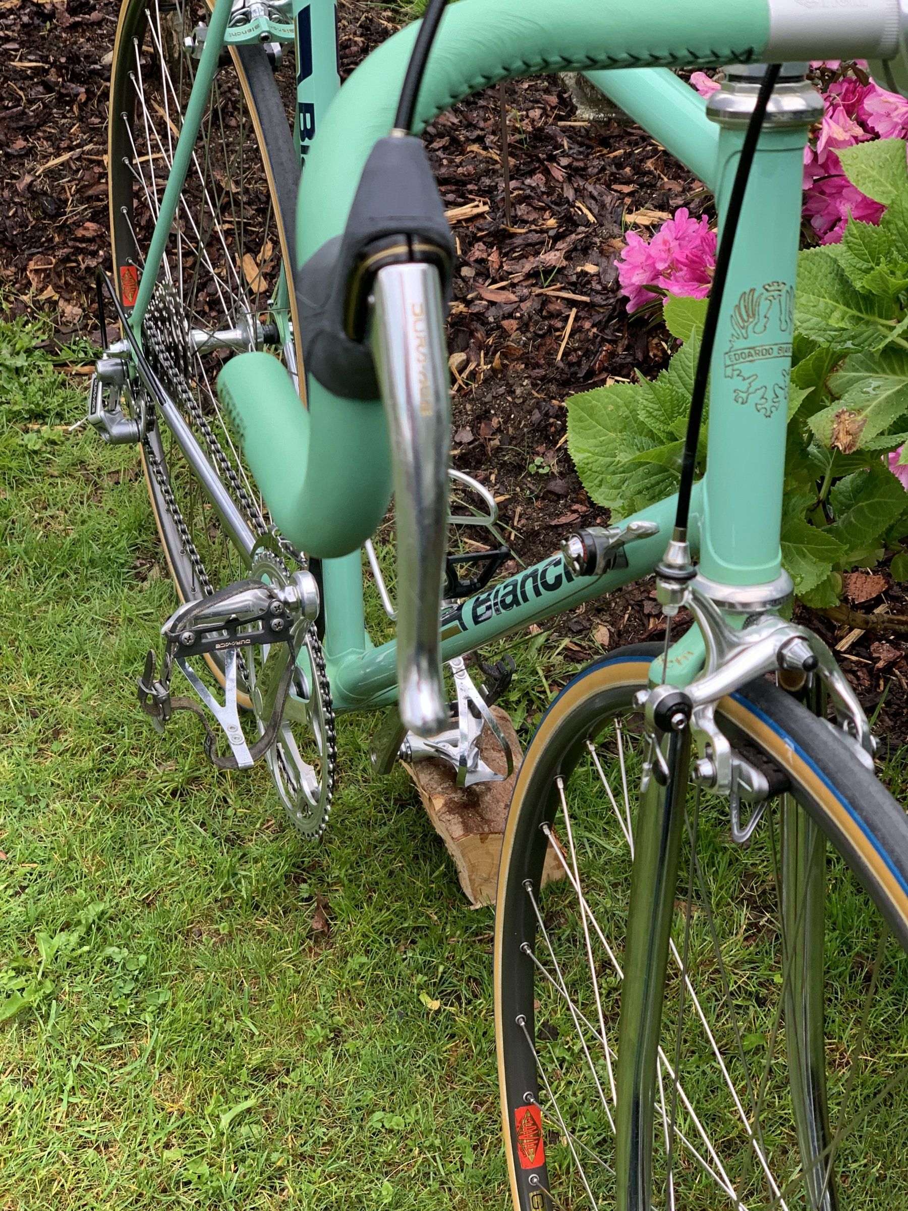 Natürlich gehört da eine C-Record 1. Baureihe dran aber die habe ich ja am Centenario und die Teile sind mir einfach zu teuer. Der ursprüngliche Besitzer hatte es schon mit DuraAce aufgebaut.