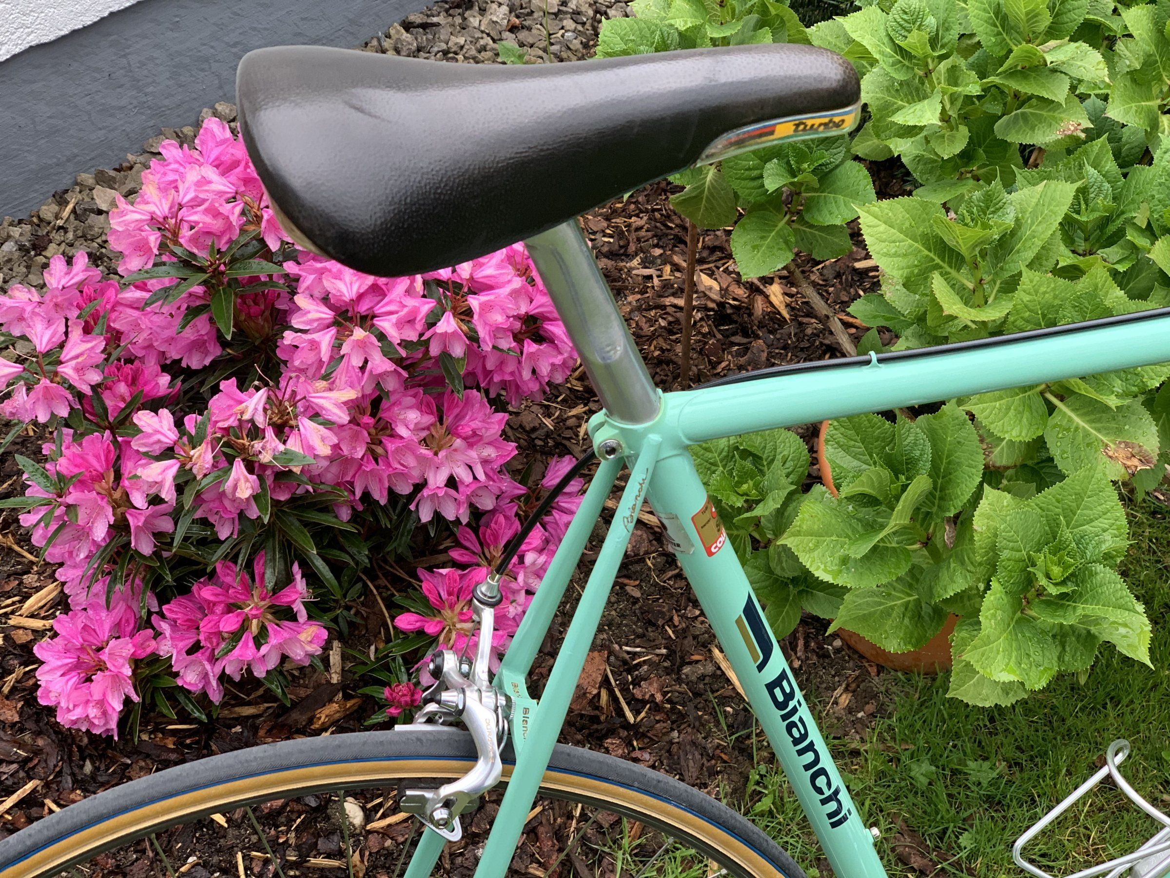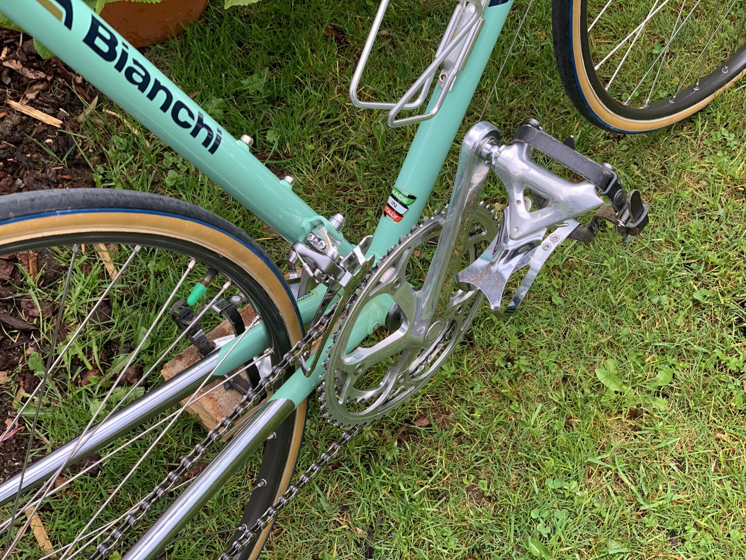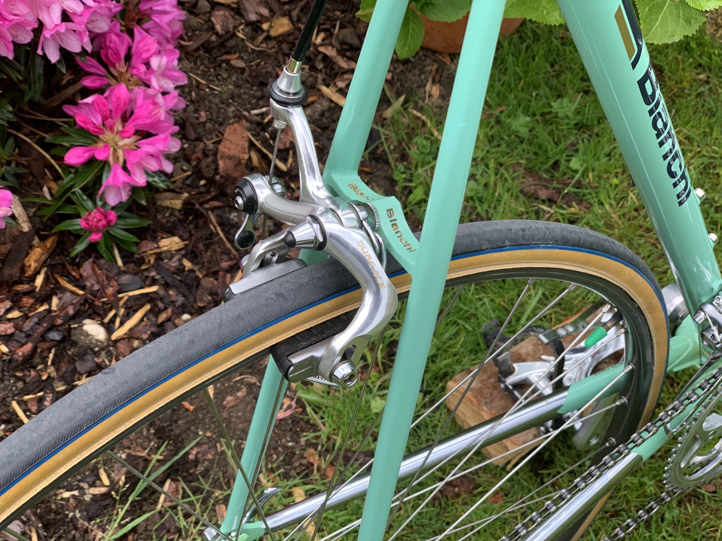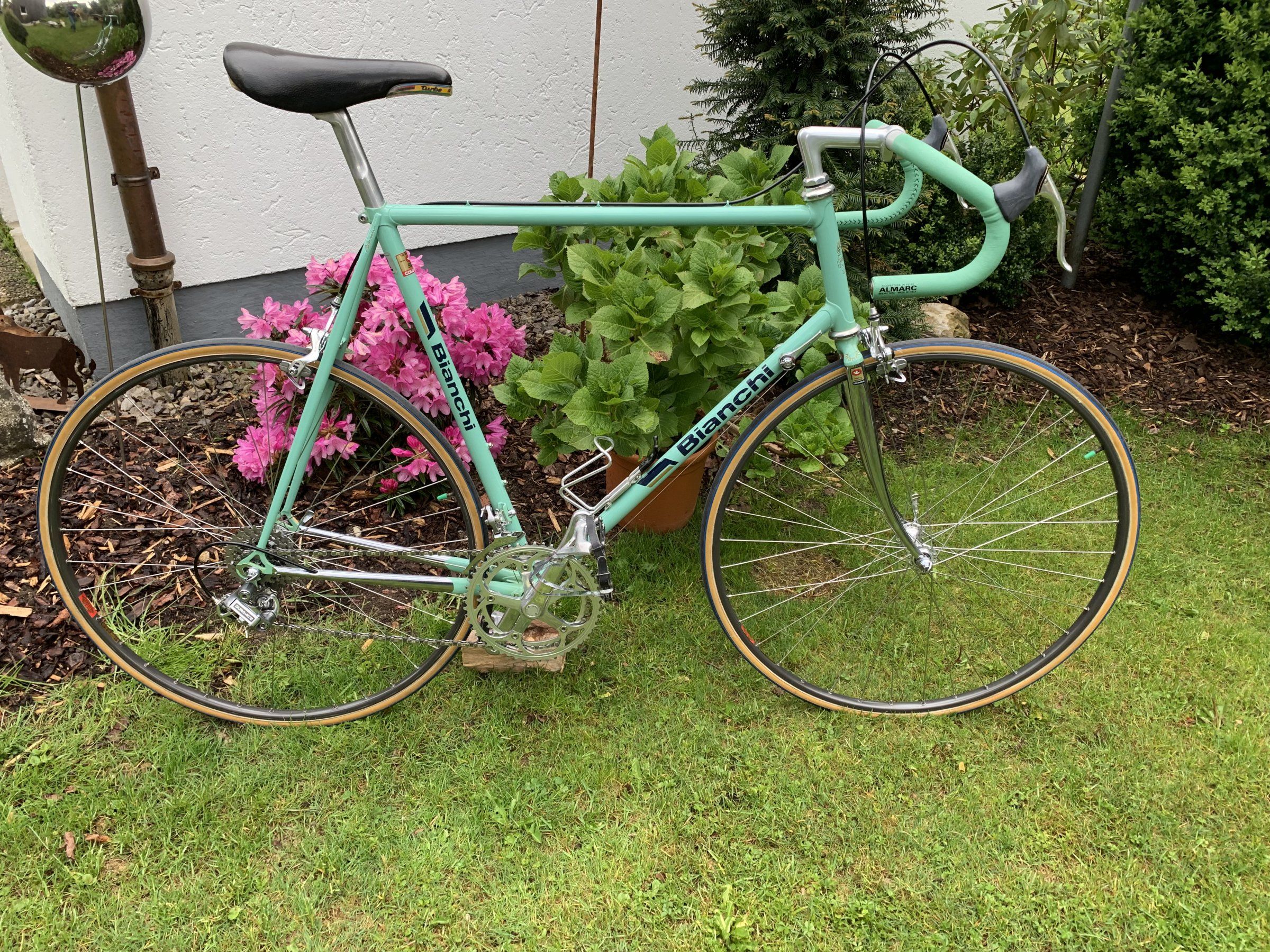 Natürlich gehört da eine C-Record 1. Baureihe dran aber die habe ich ja am Centenario und die Teile sind mir einfach zu teuer. Der ursprüngliche Besitzer hatte es schon mit DuraAce aufgebaut.