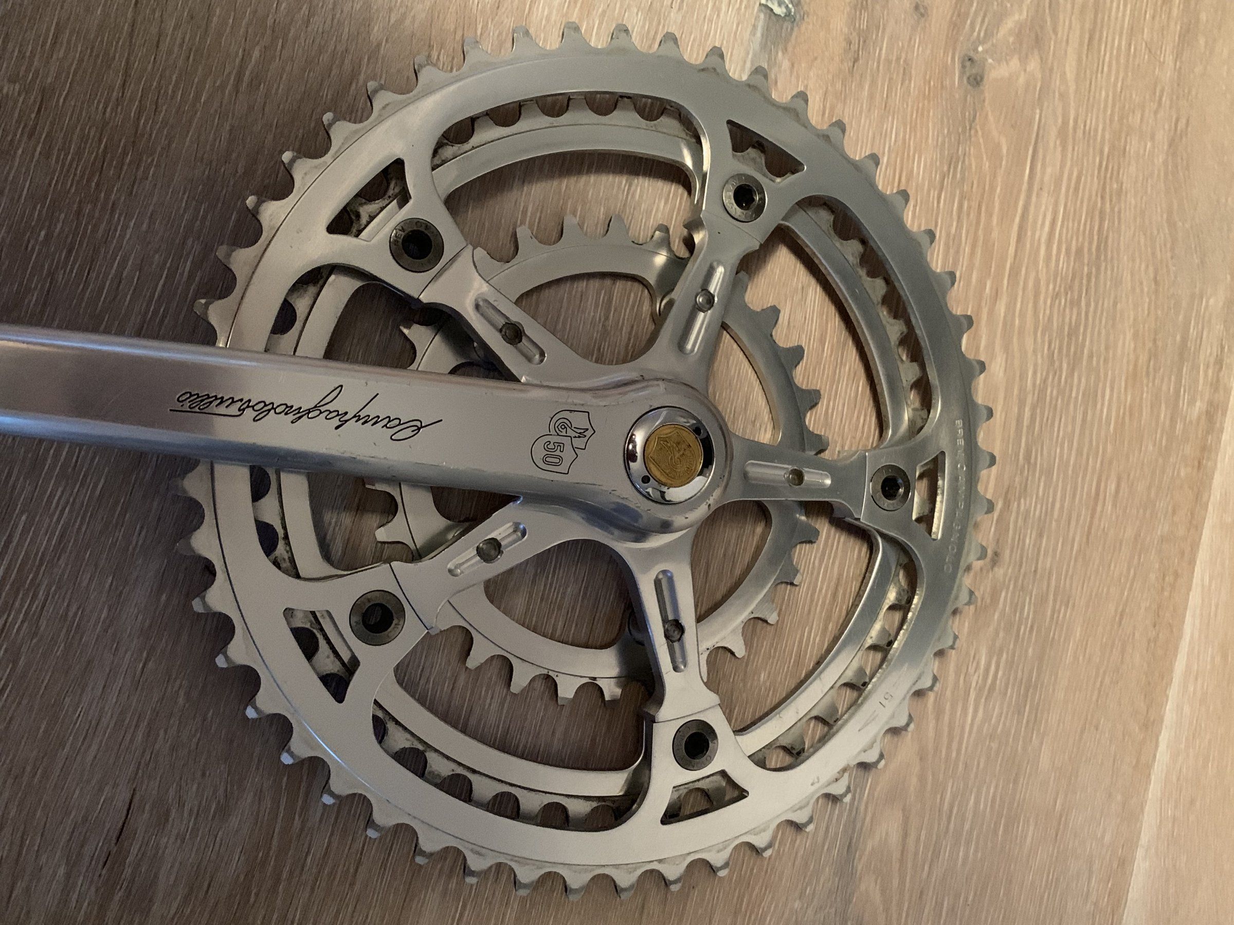 Brüggelmann bot das bis zum Erscheinen der 3 fach NR Kurbel von Campa an. Diese erkennt man daran, dass wie oben die Bohrungen in der Vertiefung liegen. Bei den Originalen von Campa ist die Vertiefung kürzer und die Bohrung an einem Stück mit voller Materialhöhe.