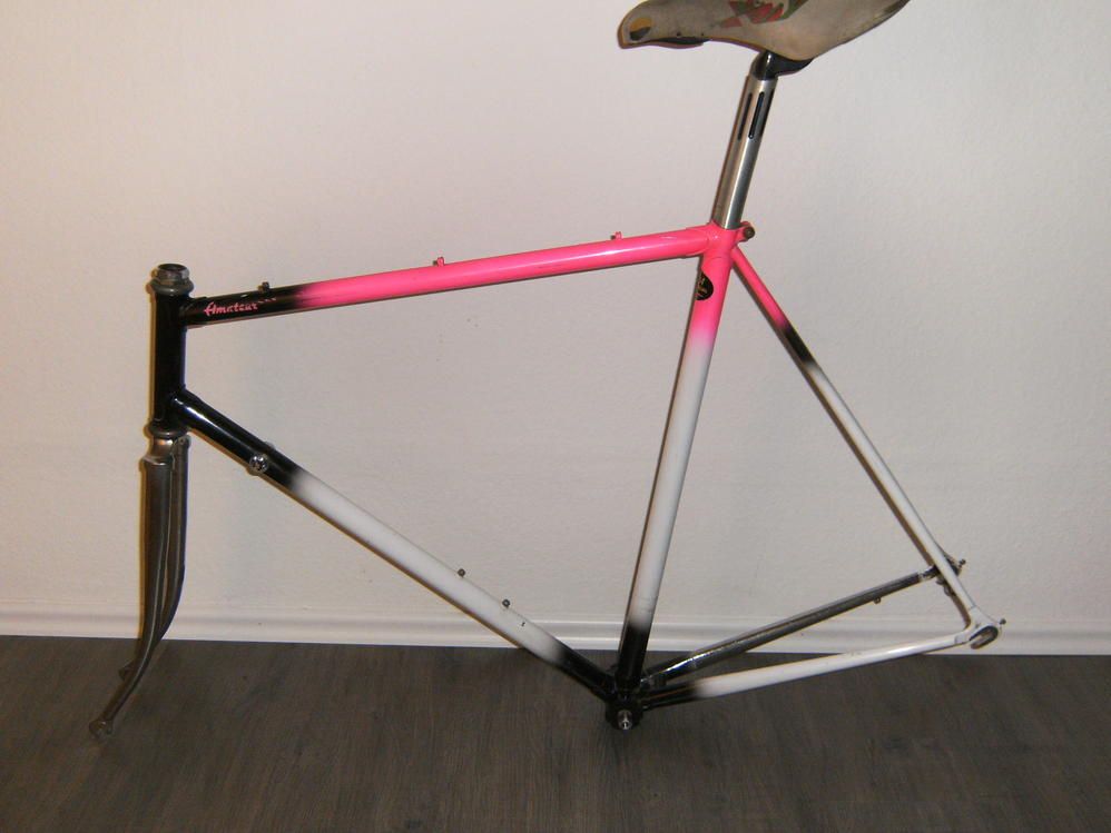 Einfacher Rohrsatz, Aufkleber nicht vorhanden. Tretlager ITA. Ideal als Winterrad (da mit Ösen) und wurde von mir auch 2 Winter gefahren. Incl. Sattelstütze (DAex) 26,4 mm aber OHNE Vorbau! Gebrauchsspuren natürlich vorhanden, aber keine groben Lackabplatzer o. ä., weitere Bilder im Album "Verkauf"