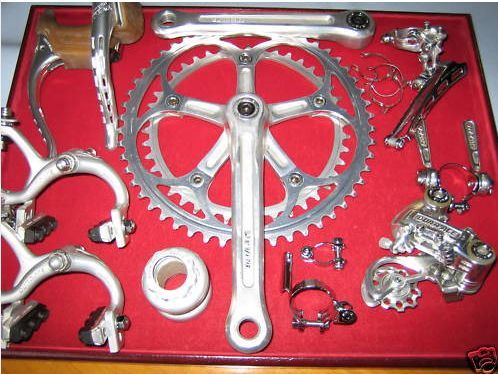 komplette Shimano Dura-Ace 6-fach Schaltgruppe (Zustand neuwertig!): Schaltwerk, Umwerfer, Rahmenschalter, Bremsen, Bremsgriffe, Naben, Steuersatz, Kurbel, Pedale.