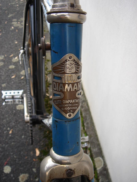 Trenne mich von einer kleinen Perle aus meiner Oldtimersammlung: Altes Diamant, Modell 100. Rahmennummer 710799, demnach von 1928. Lenker nicht original aber zeitgemäß, Lyotard-Pedal sind jünger. Bis auf die Pedale sind alle Metallteile noch vernickelt und nicht verchromt. Keine Gangschaltung, dafür originale Rücktrittnabe von Torpedo. Also weitgehend originaler Zusstand, selbst der Sattel hat eine Diamant-Prägung.