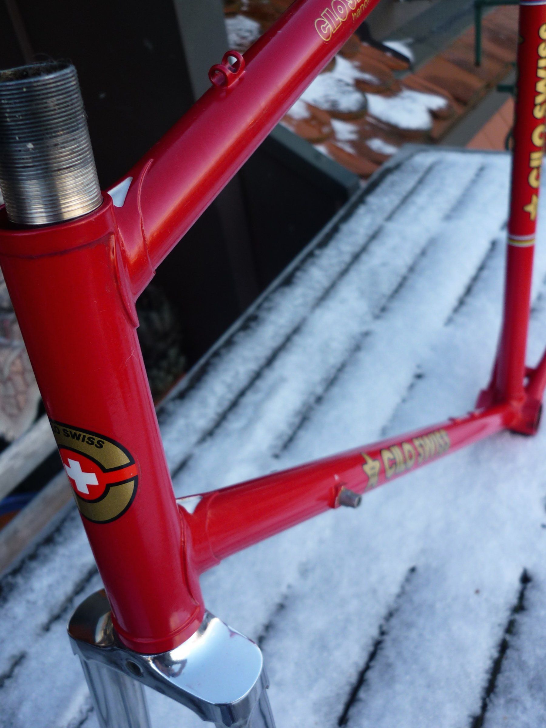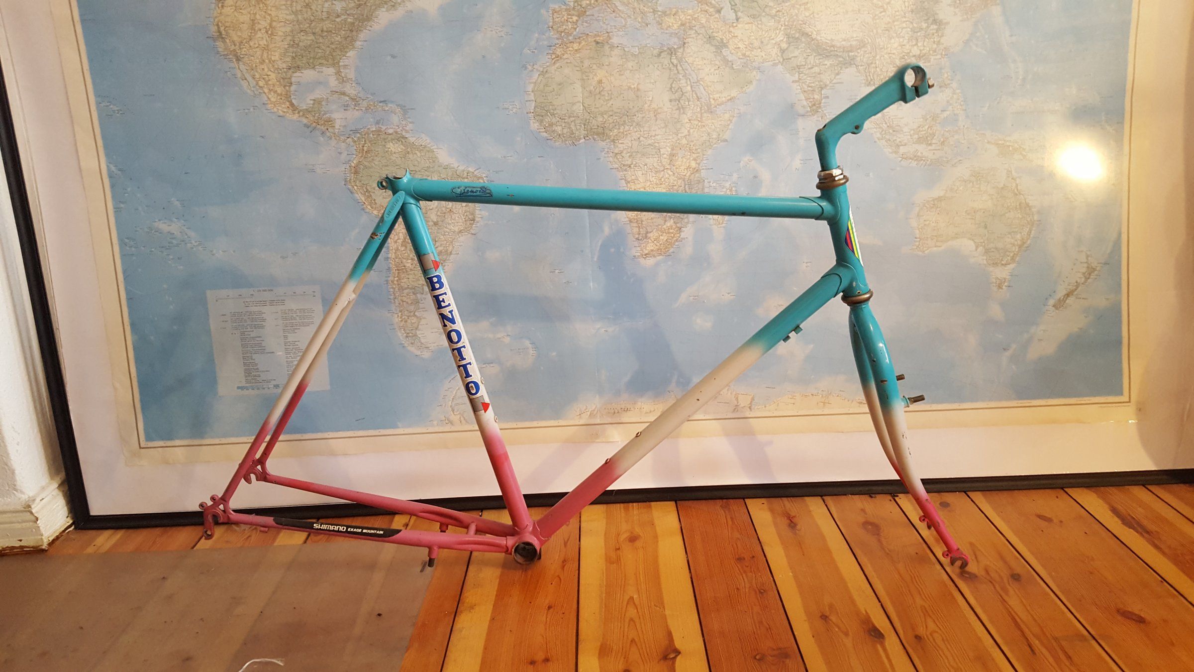 Mal fuer nen ganzen Tag oder ne Mehrtagestour geeignet. Ich verkaufe nur, weil ich mit der Farbe, die wirklich sensationell in der Sonne glänzt, nicht so recht warm werde. Die Decals sind keine, sondern komplett lackiert, wirklich hochwertig. Leider am Oberrohr mal entlanggeschrubbt, sonst kaum Lackschaeden. Chrom ist top, der Rahmen ohne Rost.