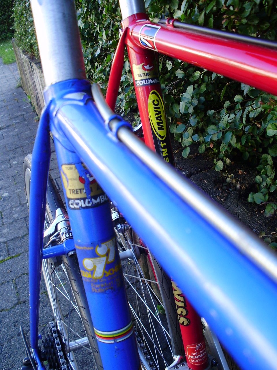 Noch nicht zu spät, weil noch zu haben: CILO-Swiss-RR-Rahmen -handmade- schöne Basis zum Aufbau eines Klassikers, Rohrsatz Columbus Aelle, gemufft mit weiß ausgemalten Muffen, jeweils in rot oder blau mit Tange Chrom-Gabel, Rahmenhöhe 60cm, jeweils mit Steuersatz, Innenlager, Sattelstütze + Sattelklemmbolzen - alles "gut im Fett", Schaltaugen o.k., keine Dellen, Risse nur nutzungstypische Kratzer, keine Stürze bekannt, Spur stimmt !Hihi, 2 Stunden zu spät!![]()
