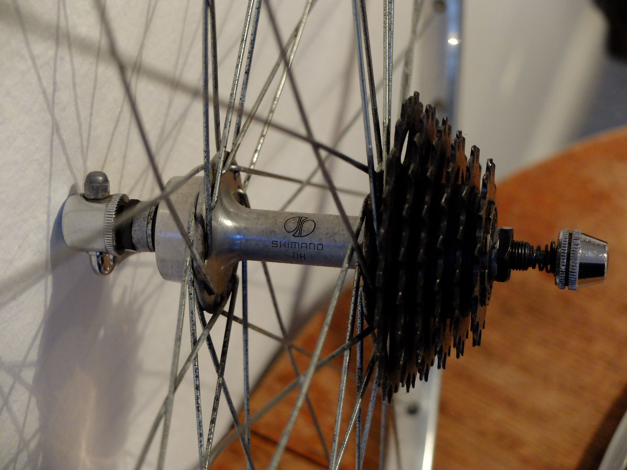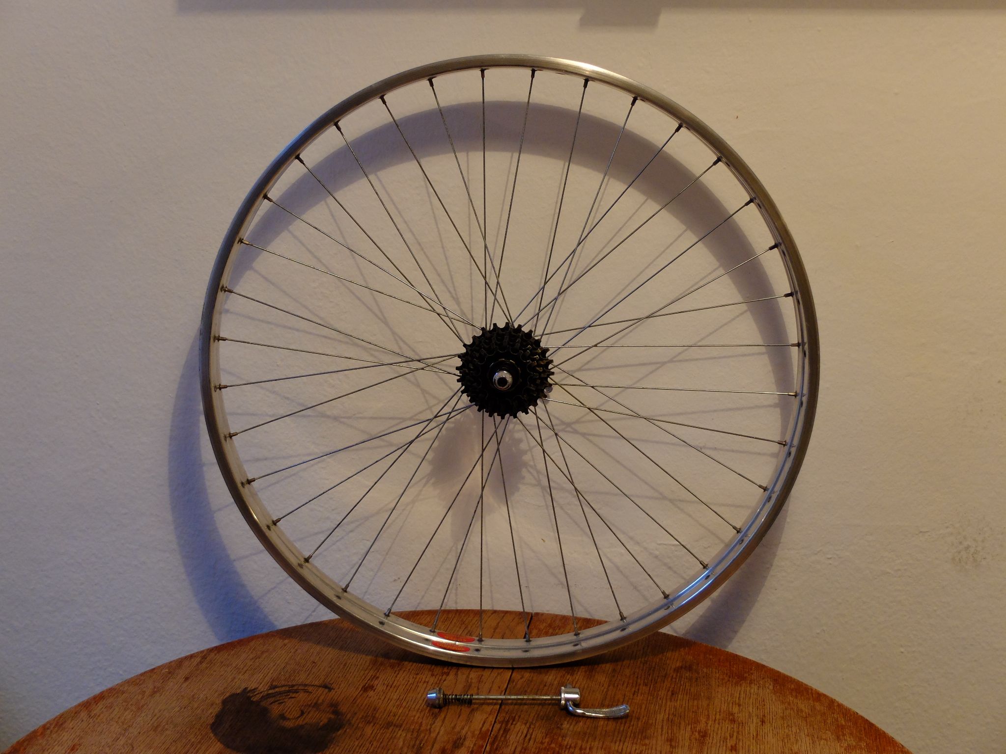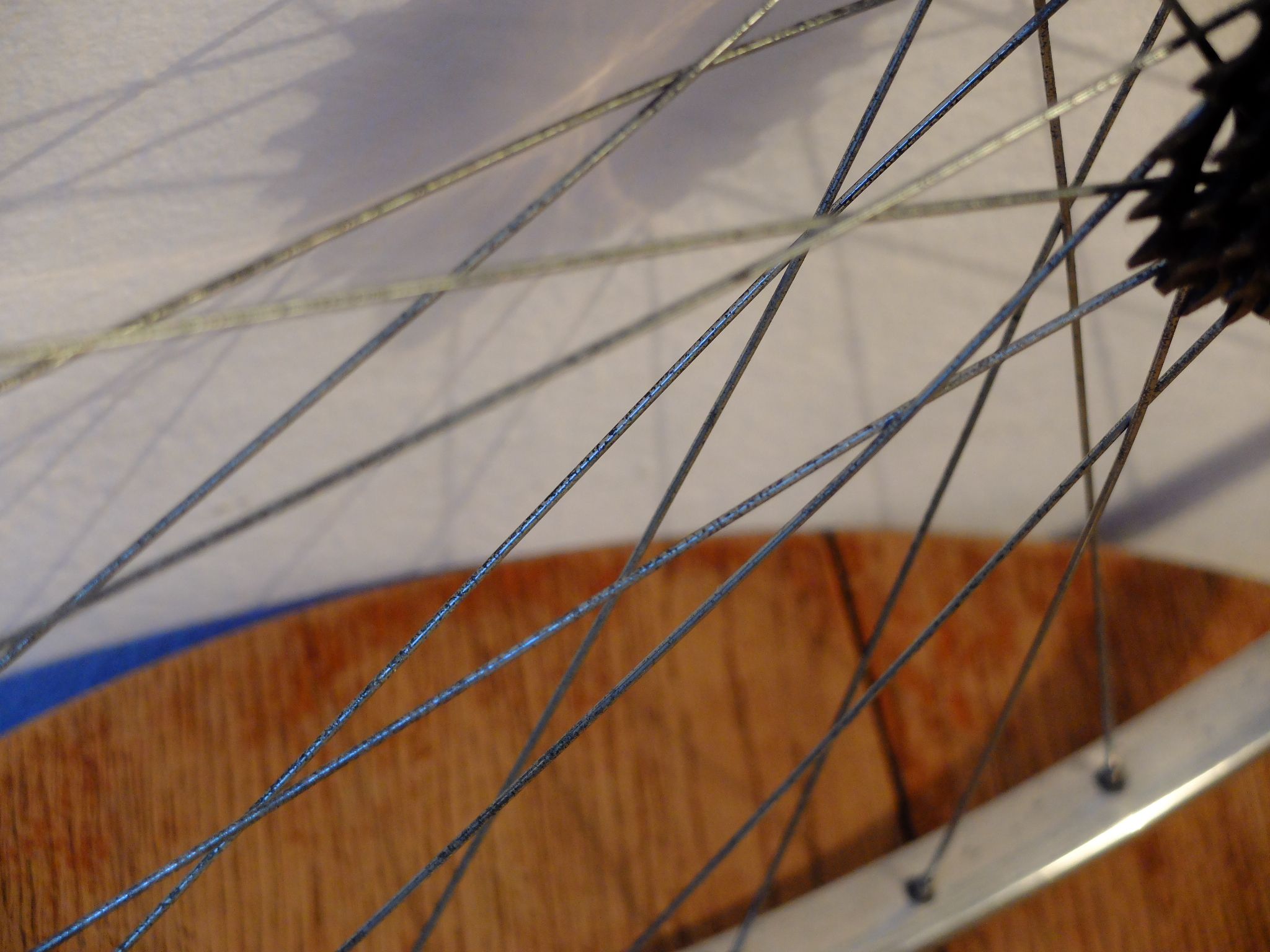 Eine Felge ist lose, an einer anderen hängt noch eine Shimano UG-Nabe in 126 und eine 6-fach UG-Kassette mm dran. Die andere Nabe und die Speichen waren komplett hinüber. Felgen sind aber noch auffallend schön, mit ein bisschen polieren könnten sie wieder richtig schick aussehen. Mit meinen Hausmitteln (Küchentisch, PVC-Boden) würde ich sagen, dass die ausgespeichte Felge rund und nicht verzogen ist.