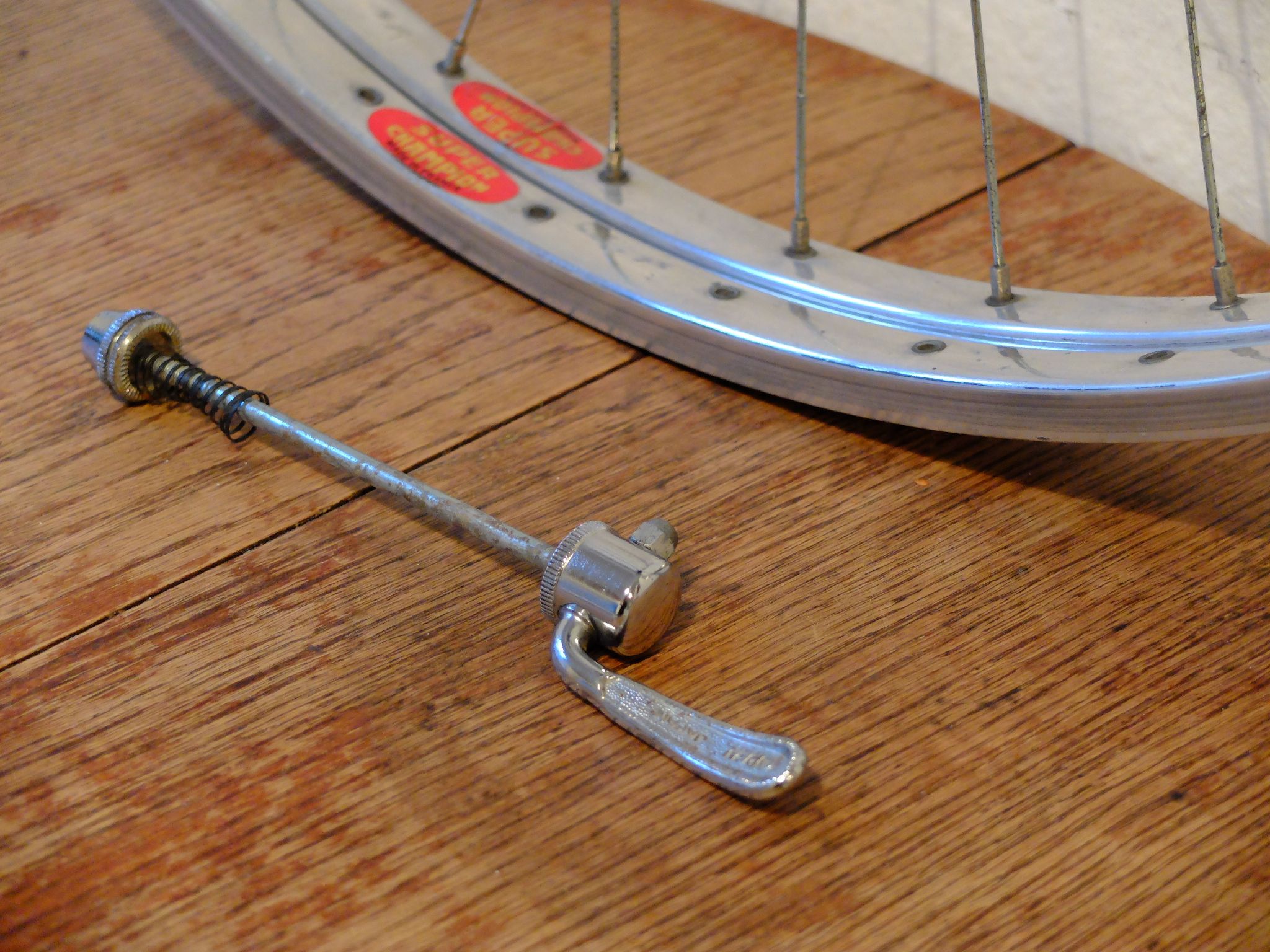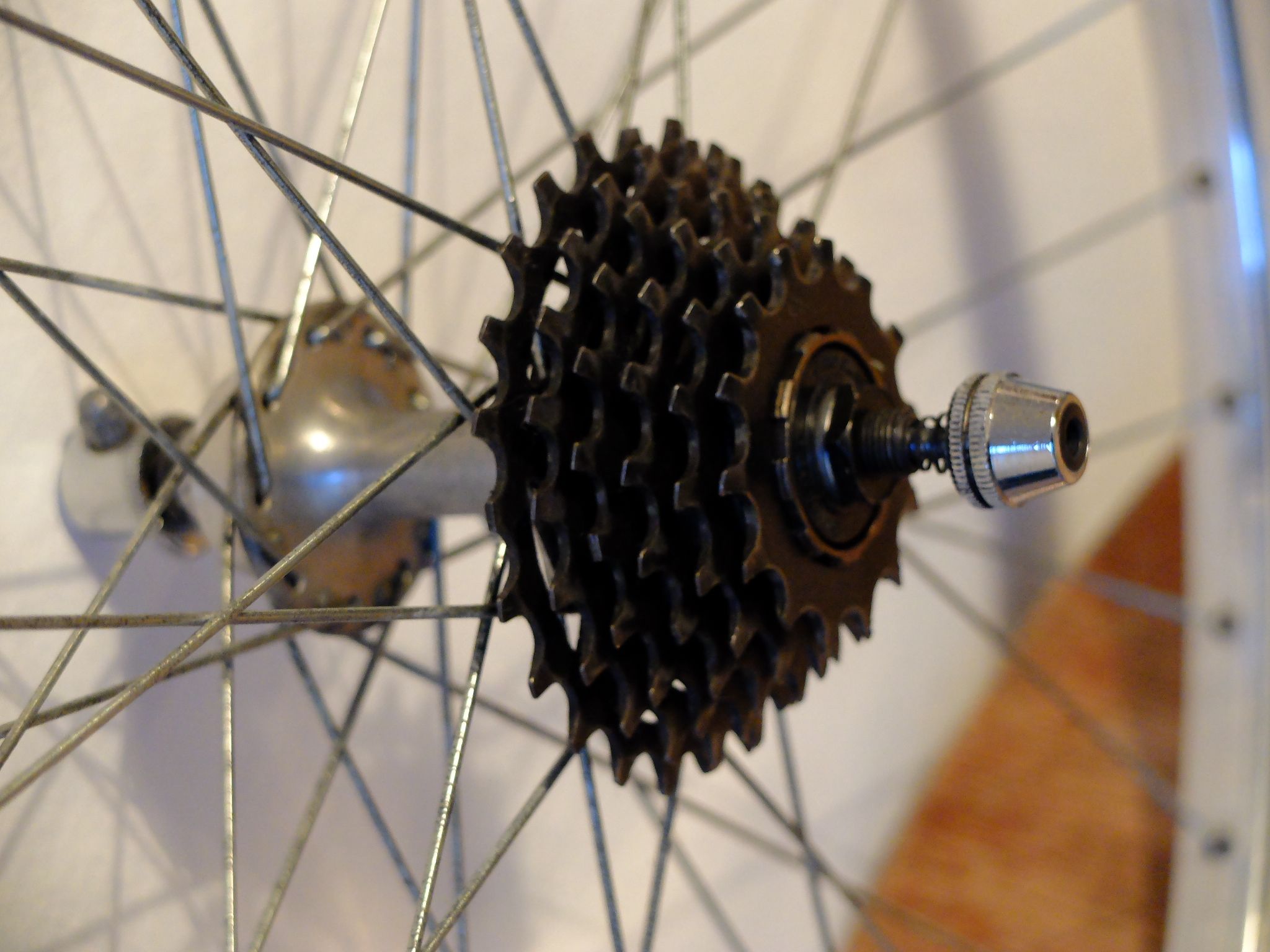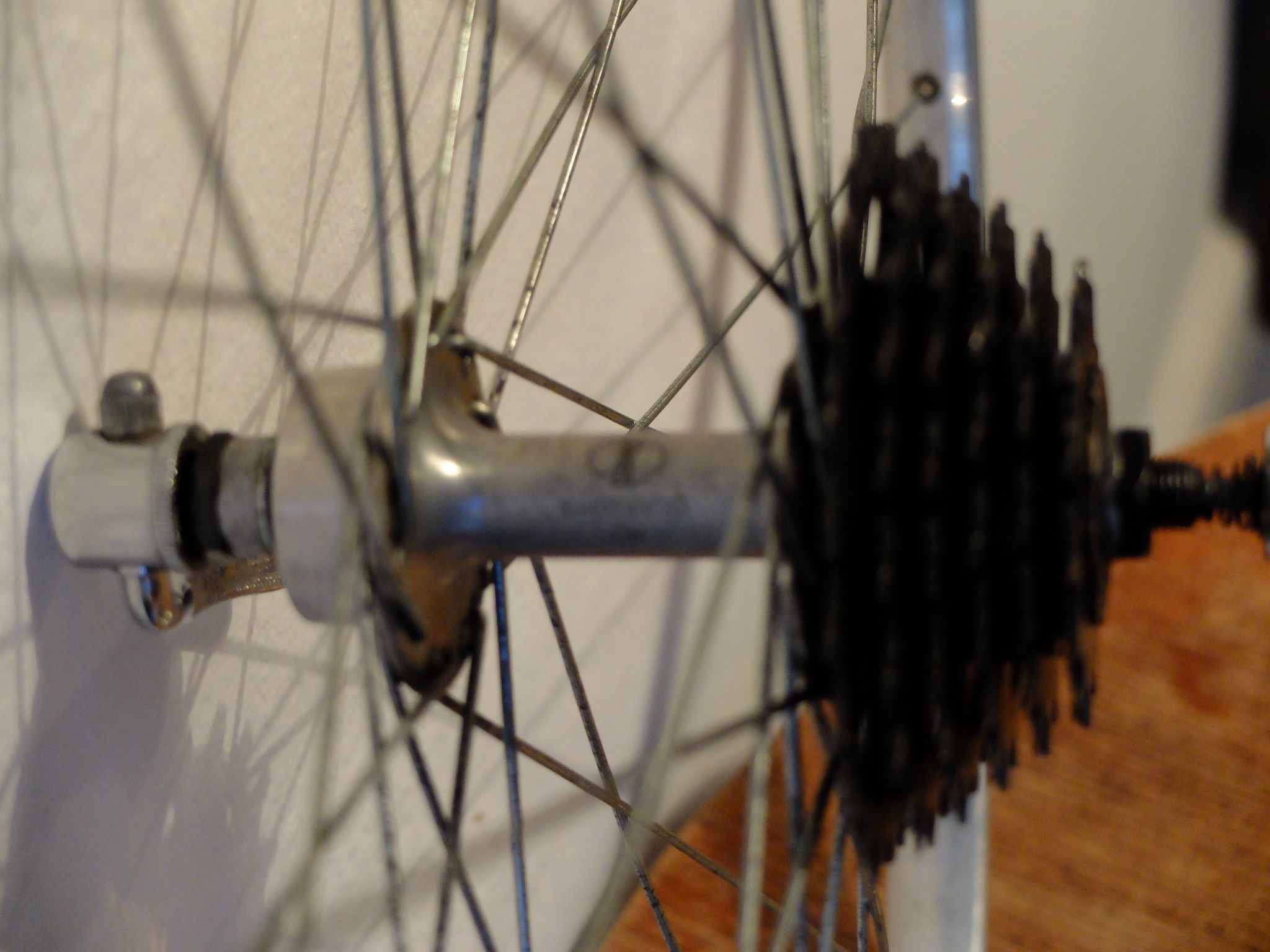 Eine Felge ist lose, an einer anderen hängt noch eine Shimano UG-Nabe in 126 und eine 6-fach UG-Kassette mm dran. Die andere Nabe und die Speichen waren komplett hinüber. Felgen sind aber noch auffallend schön, mit ein bisschen polieren könnten sie wieder richtig schick aussehen. Mit meinen Hausmitteln (Küchentisch, PVC-Boden) würde ich sagen, dass die ausgespeichte Felge rund und nicht verzogen ist.