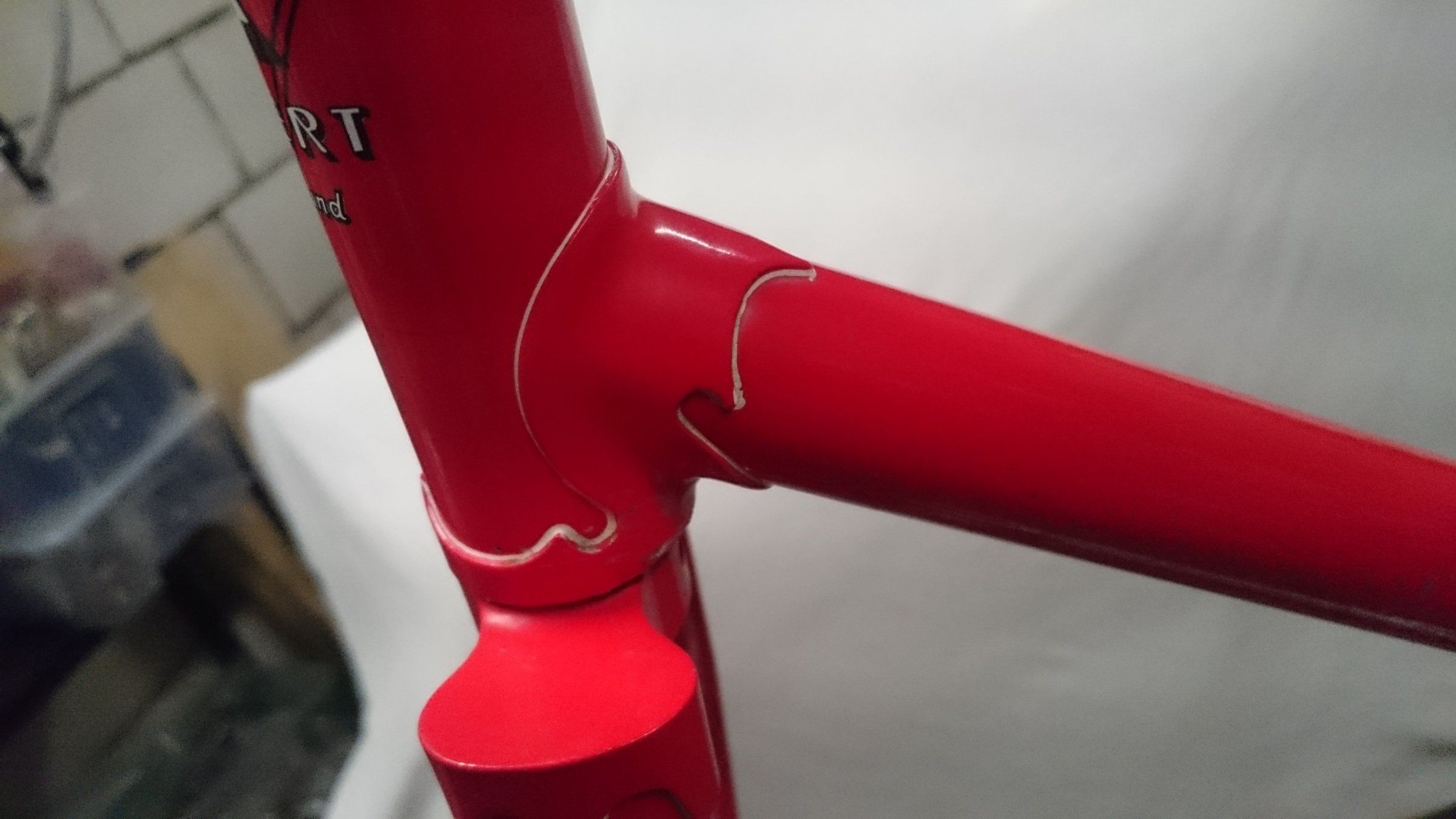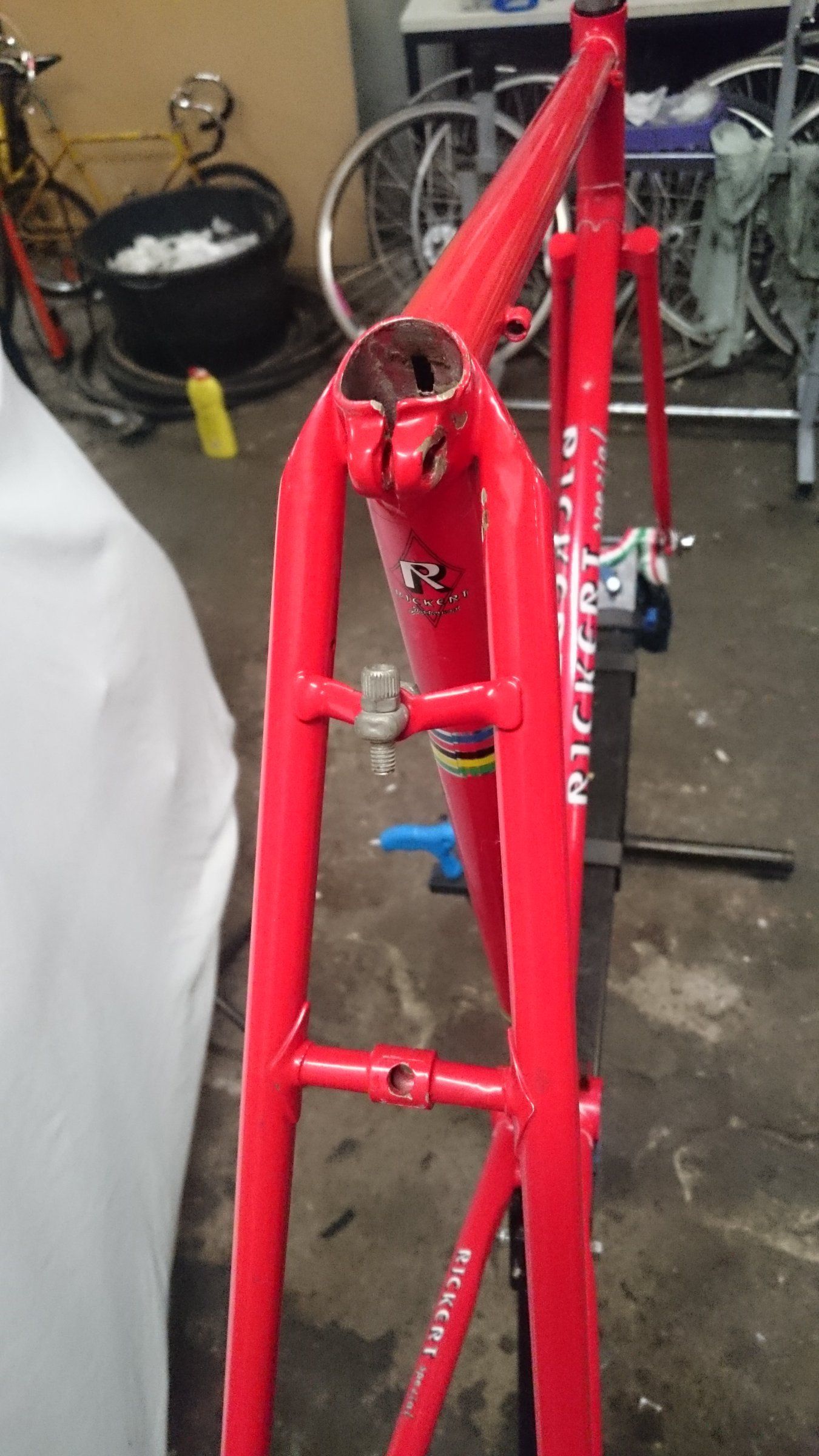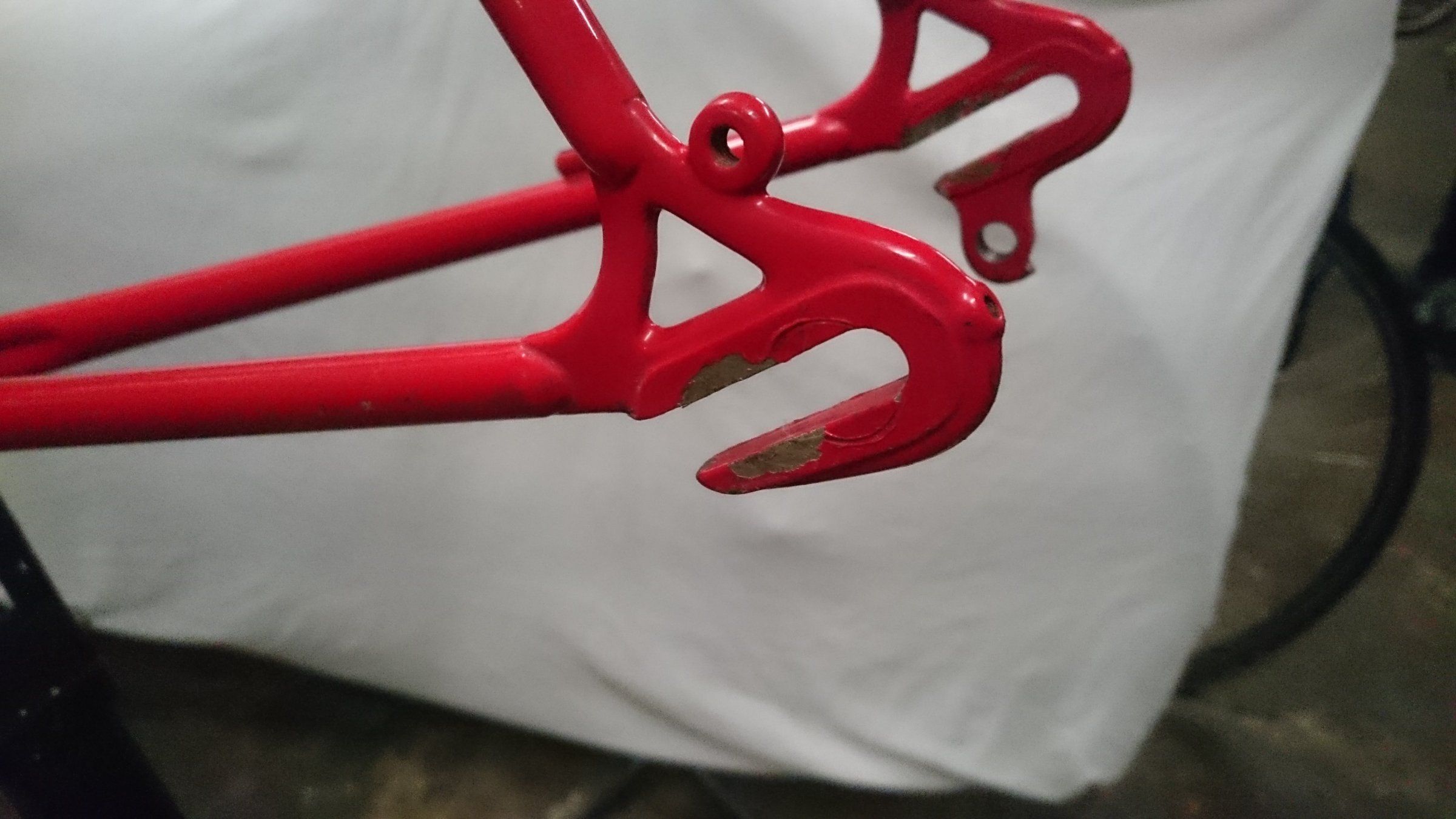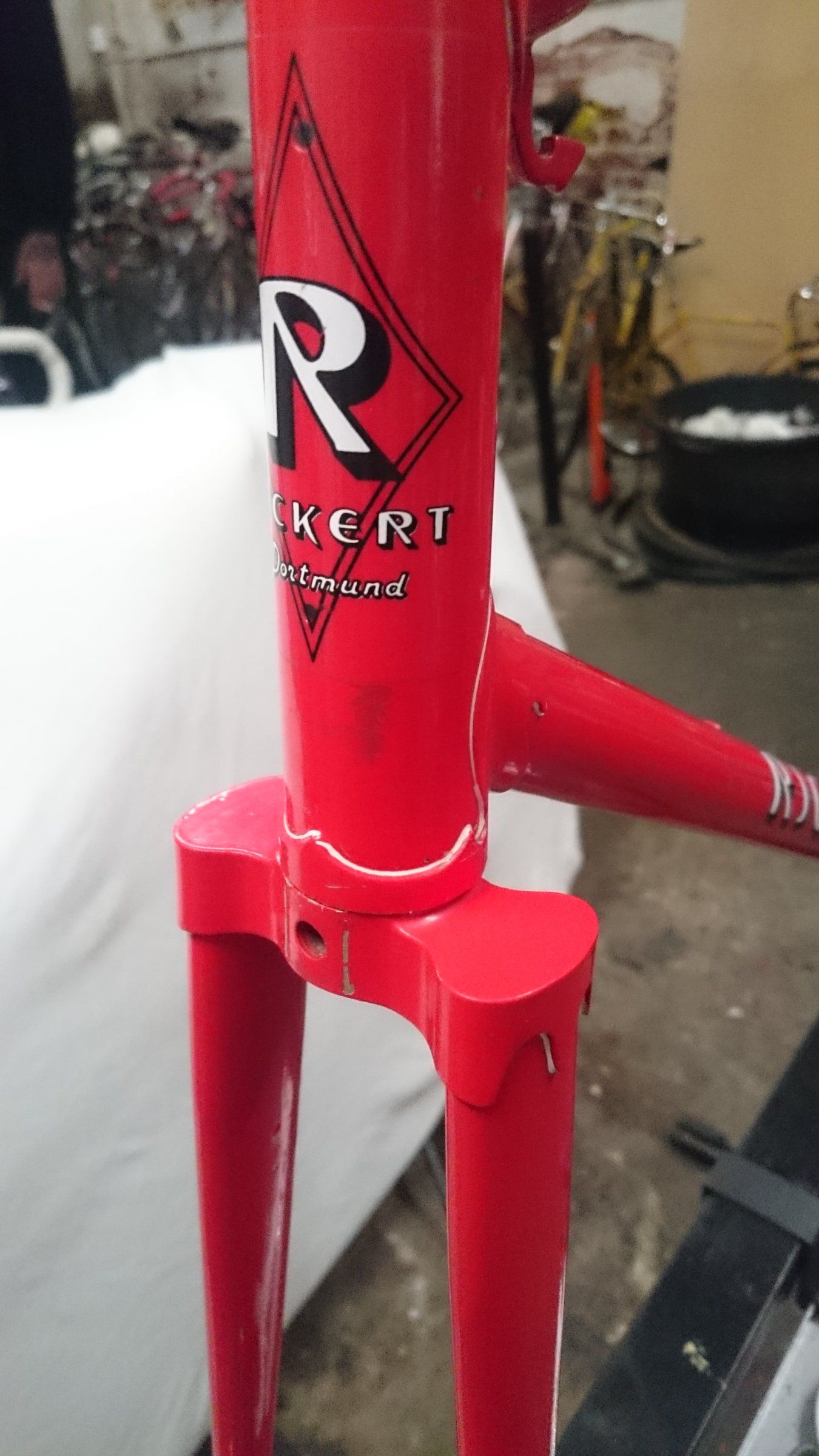 Als ich den Rahmen vor Jahren bekam, wies er bereits diverse Schrammen und die großflächige Lackabschürfung am Unterrohr auf. Da er aber trotz allem sehr schön dastand, wollte ich ihn mir eigentlich aufbauen. Dann passierte mir ein dummes Malheur. Der Rahmen fiel vom Schrank, auf dem ich ihn aufbewahrt hatte, und behielt davon die Delle zurück, die man auf dem letzten Foto sieht. Sie ist meiner Ansicht nach für das Fahrverhalten unerheblich. Trotzdem kann ich das gute Stück seither nicht ansehen, ohne mich über mich selbst zu ärgern. Es in den Keller zu verbannen, hat leider auch nur vorübergehend gefruchtet, da ich diesen jetzt teilweise räumen muss. Vielleicht bereitet der Rahmen einem anderen User im jetzigen Zustand ja doch noch Freude. Gestaucht oder gerissen ist daran nichts. Weitere Dellen sind auch nicht vorhanden. Die Lager bleiben drin, wobei der Steuersatz gewartet und das Innenlager gewechselt werden müsste.