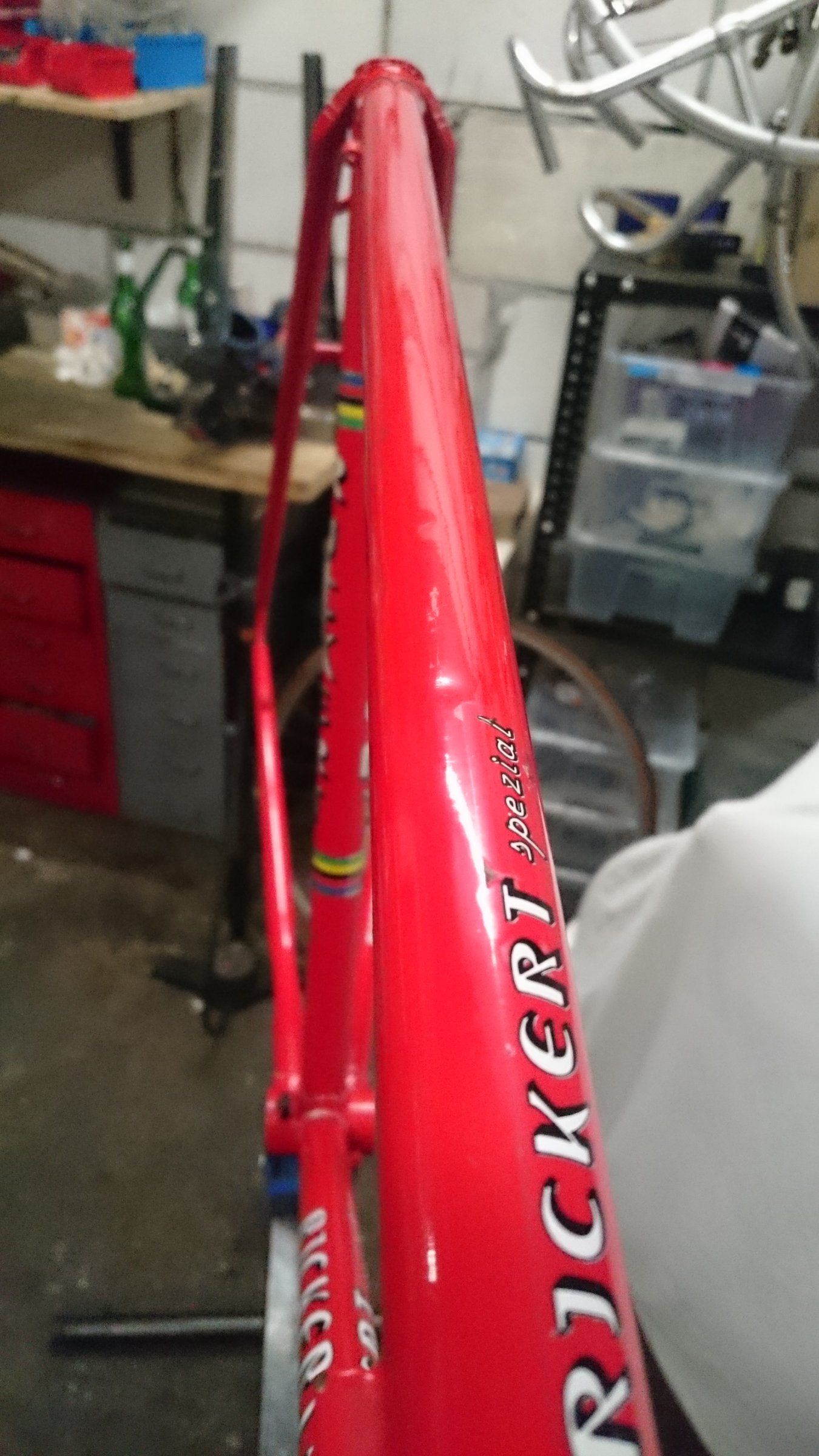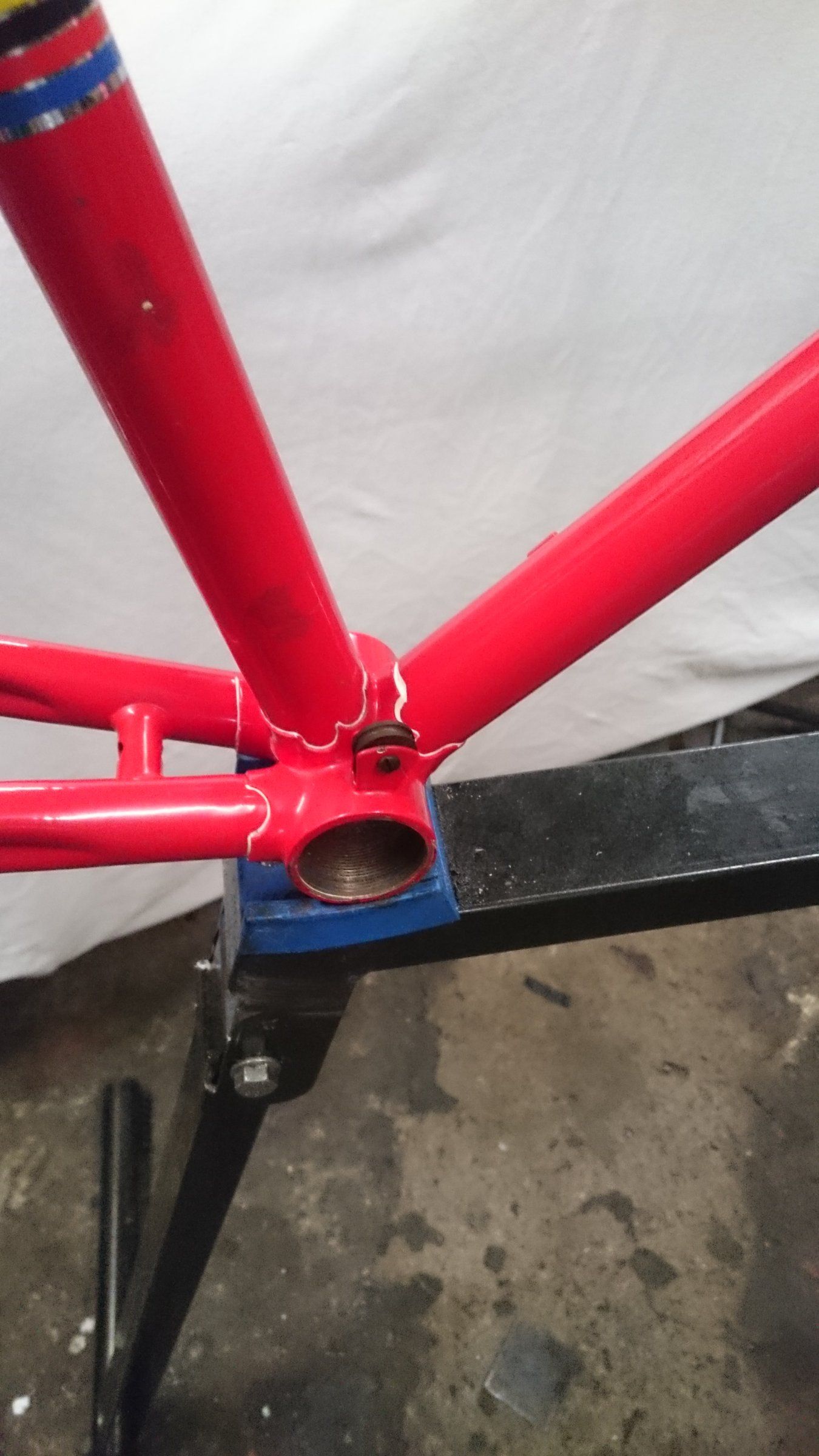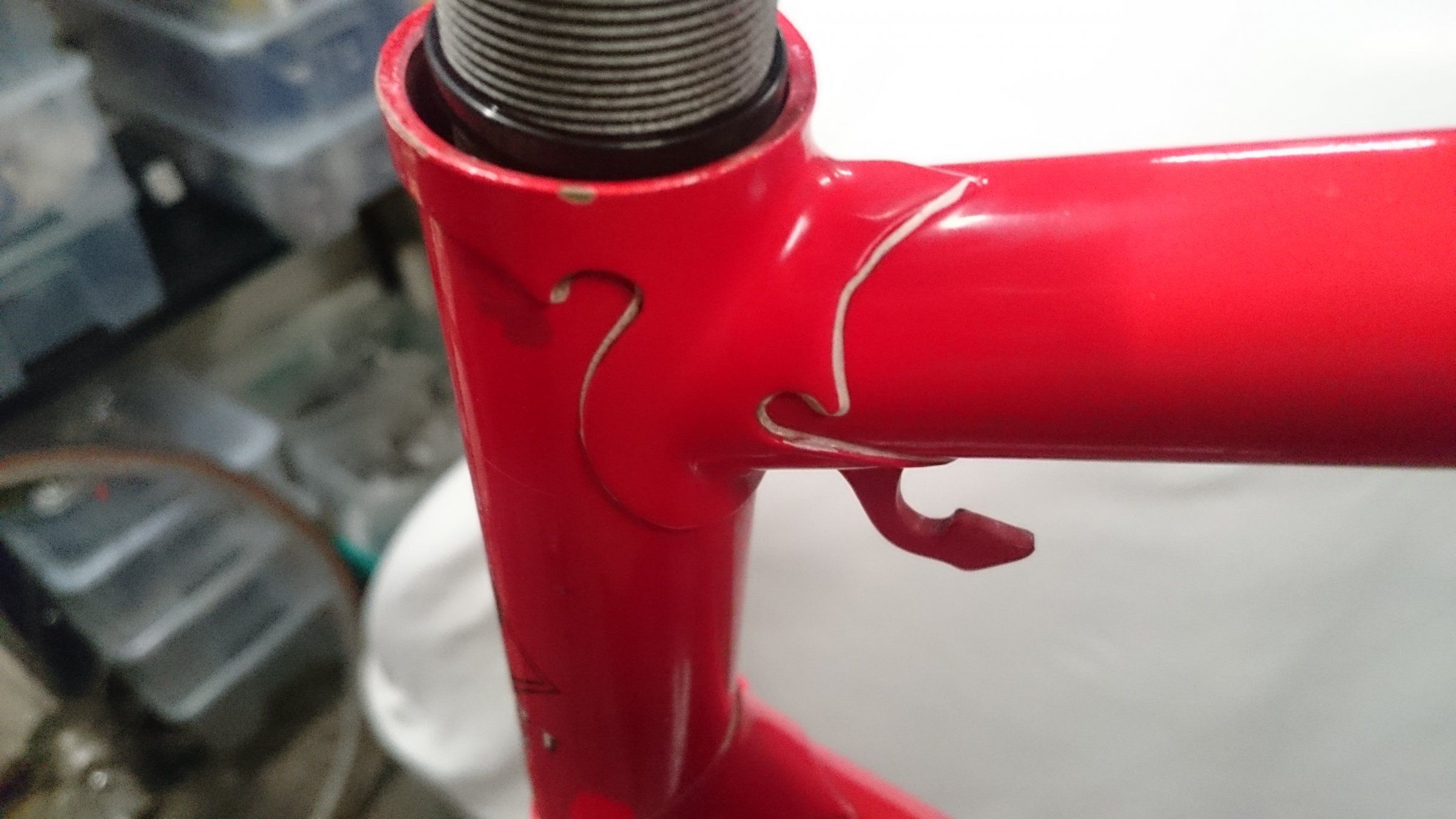 Als ich den Rahmen vor Jahren bekam, wies er bereits diverse Schrammen und die großflächige Lackabschürfung am Unterrohr auf. Da er aber trotz allem sehr schön dastand, wollte ich ihn mir eigentlich aufbauen. Dann passierte mir ein dummes Malheur. Der Rahmen fiel vom Schrank, auf dem ich ihn aufbewahrt hatte, und behielt davon die Delle zurück, die man auf dem letzten Foto sieht. Sie ist meiner Ansicht nach für das Fahrverhalten unerheblich. Trotzdem kann ich das gute Stück seither nicht ansehen, ohne mich über mich selbst zu ärgern. Es in den Keller zu verbannen, hat leider auch nur vorübergehend gefruchtet, da ich diesen jetzt teilweise räumen muss. Vielleicht bereitet der Rahmen einem anderen User im jetzigen Zustand ja doch noch Freude. Gestaucht oder gerissen ist daran nichts. Weitere Dellen sind auch nicht vorhanden. Die Lager bleiben drin, wobei der Steuersatz gewartet und das Innenlager gewechselt werden müsste.