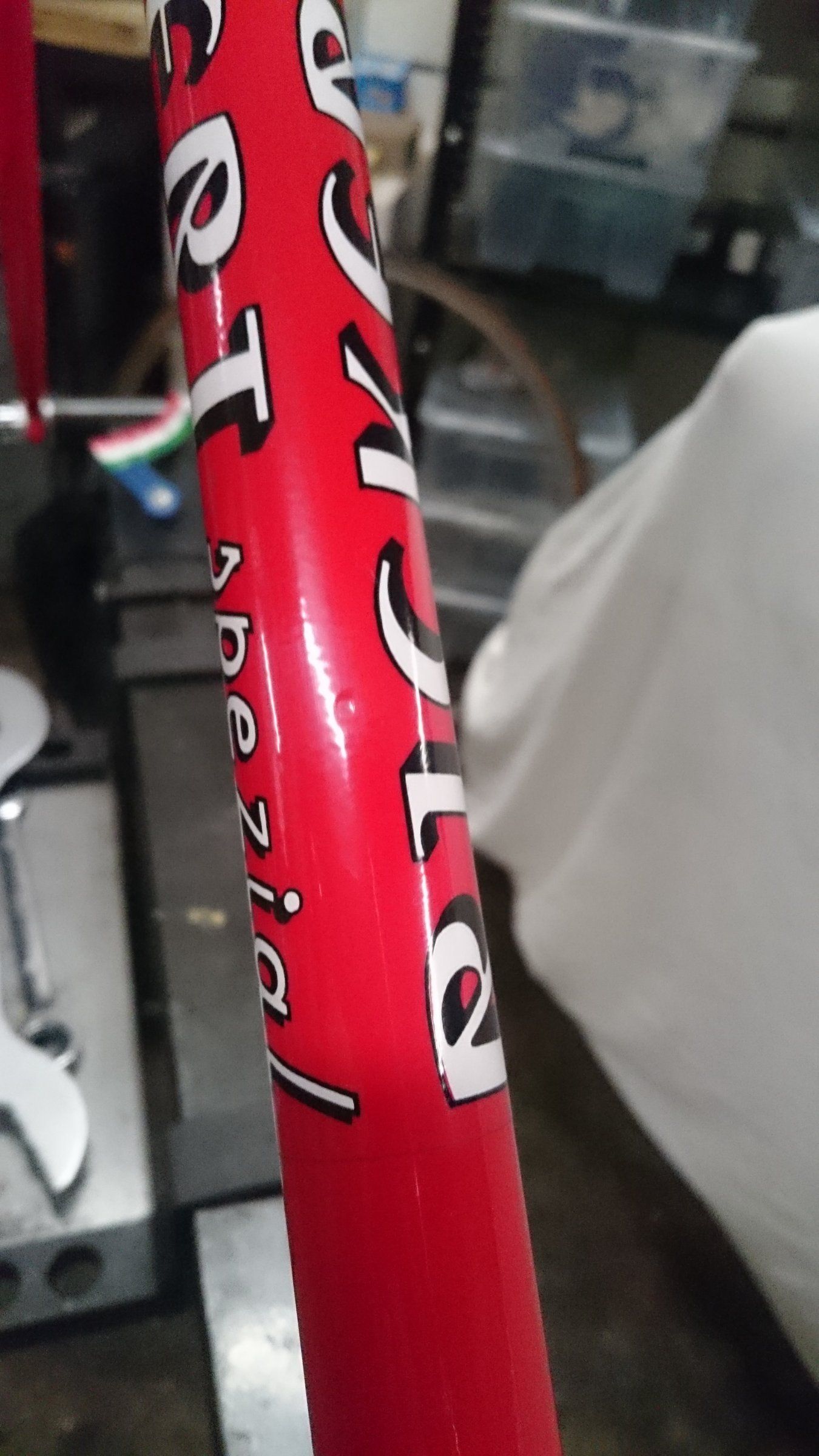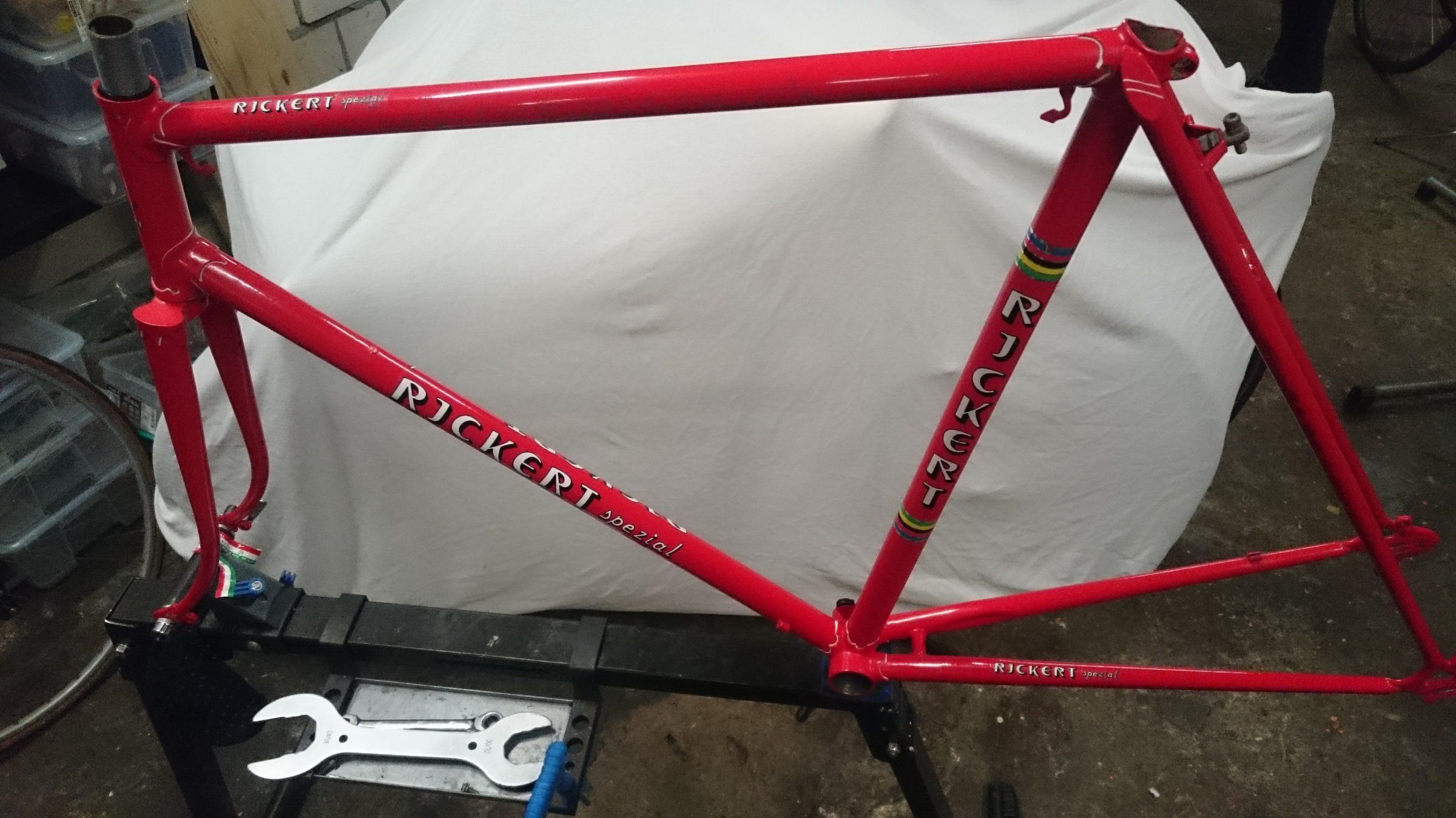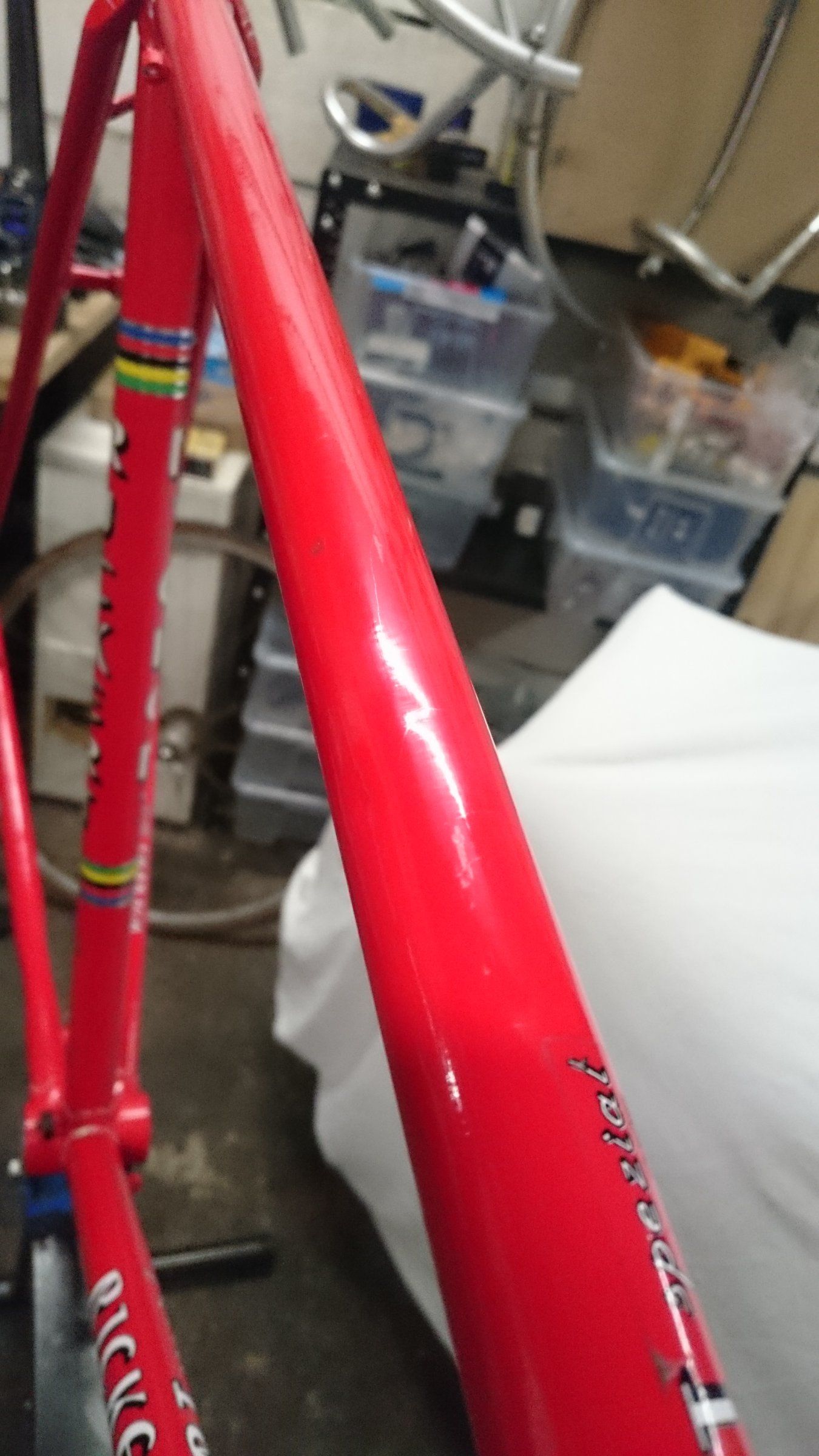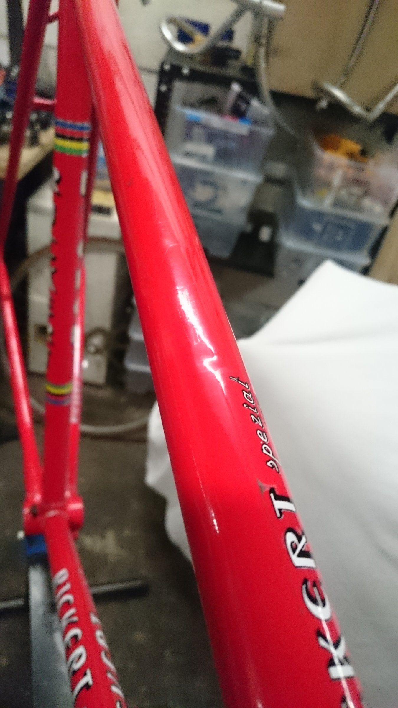 Als ich den Rahmen vor Jahren bekam, wies er bereits diverse Schrammen und die großflächige Lackabschürfung am Unterrohr auf. Da er aber trotz allem sehr schön dastand, wollte ich ihn mir eigentlich aufbauen. Dann passierte mir ein dummes Malheur. Der Rahmen fiel vom Schrank, auf dem ich ihn aufbewahrt hatte, und behielt davon die Delle zurück, die man auf dem letzten Foto sieht. Sie ist meiner Ansicht nach für das Fahrverhalten unerheblich. Trotzdem kann ich das gute Stück seither nicht ansehen, ohne mich über mich selbst zu ärgern. Es in den Keller zu verbannen, hat leider auch nur vorübergehend gefruchtet, da ich diesen jetzt teilweise räumen muss. Vielleicht bereitet der Rahmen einem anderen User im jetzigen Zustand ja doch noch Freude. Gestaucht oder gerissen ist daran nichts. Weitere Dellen sind auch nicht vorhanden. Die Lager bleiben drin, wobei der Steuersatz gewartet und das Innenlager gewechselt werden müsste.