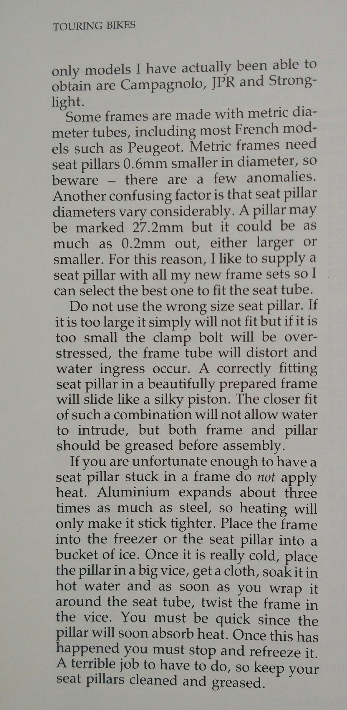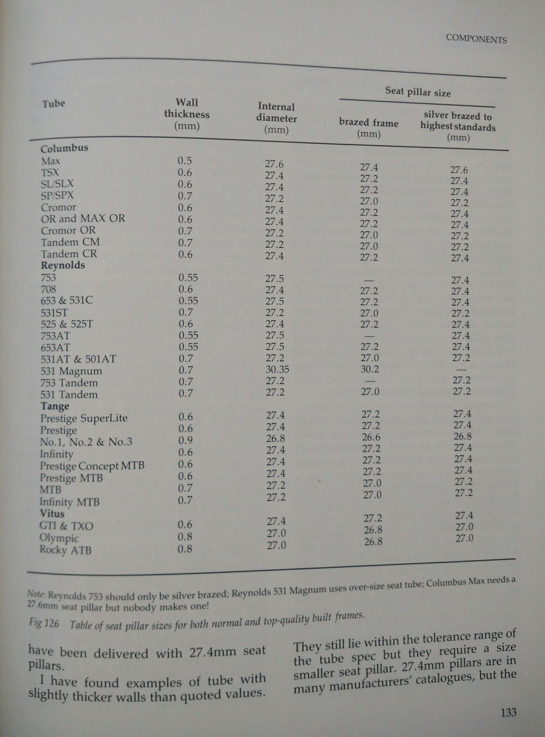 Just as a Reynolds 21/24 gauge single-butted seat tube in 28.6 mm can take either a 27.2 or 27.4 seat post (depending on how much it warped during brazing and how much it was reamed), in metric 28.0 seat tubes of the same gauge, the seatpost will be either 26.6. or 26.8. The 26.6 seatpost in metric frames, or 27.2 in English, will be a bit on the loose side, but it's practical. Trying to make the English frame fit 27.4, or the French frame fit 26.8, requires uncommon heat control in brazing and/or more reaming than is typically done on production frames. Using the slightly undersized post is practical, but it makes the seat lug ears bend in a bit more than on, say 27.2 on Columbus SL with its 0.6 mm wall at the top of the seat tube. Reynolds 24 gauge is often called 0.5 mm, but it's really 0.56 – as you can see, slightly closer to 0.6 than to 0.5. If the Reynolds seat tube was really 0.5, you'd never be able to use 27.2 (or 26.6 on metric frames) – you'd have to use 27.4 or 26.8 respectively. Unless the lug area was more warped than normal, from heat of brazing or later damage.