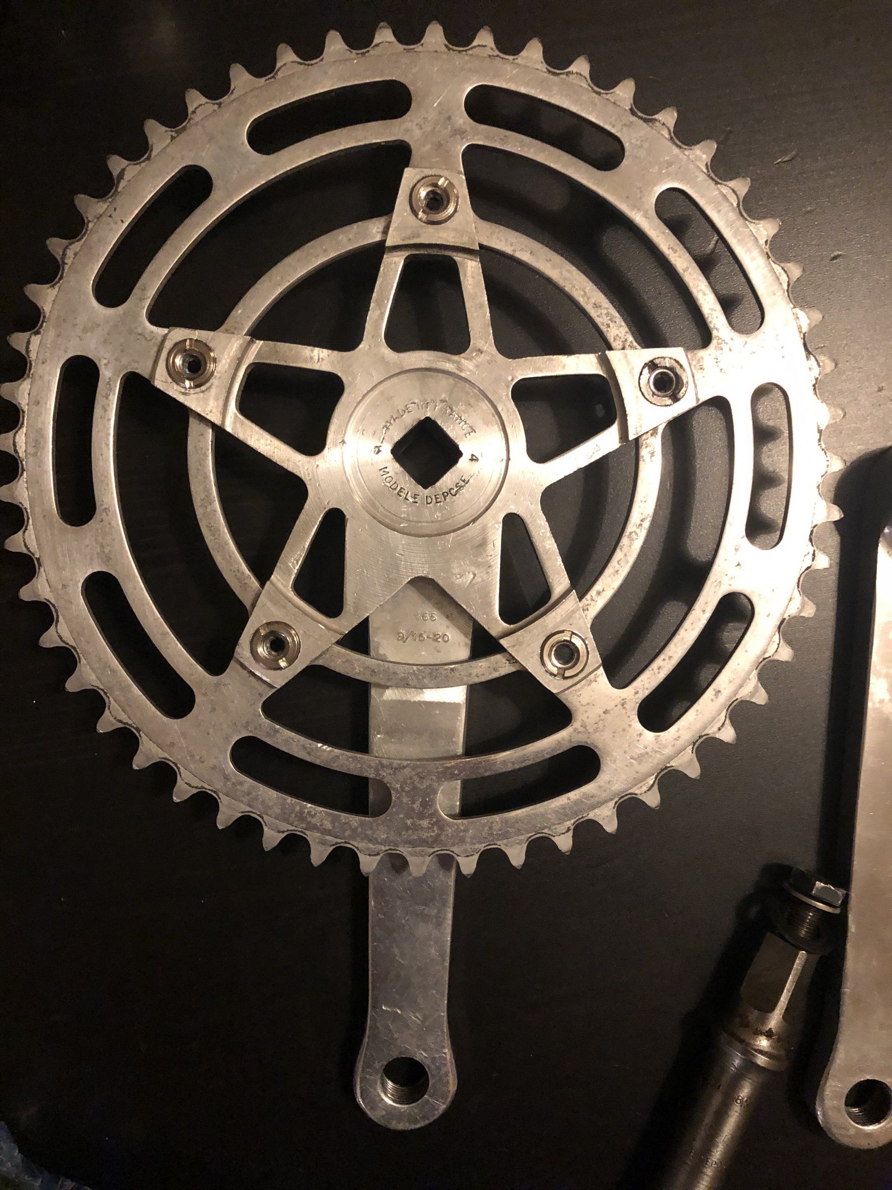Stronglight 93D Pista Kurbel,165mm, 52 Zähne. Dickes Kettenblatt (Kein Strassenblatt) + 113mm Stronglight Innenlager (kein pitting) + Kette. Ich habe fast 1,5 Jahre das dicke Bahnblatt gesucht.