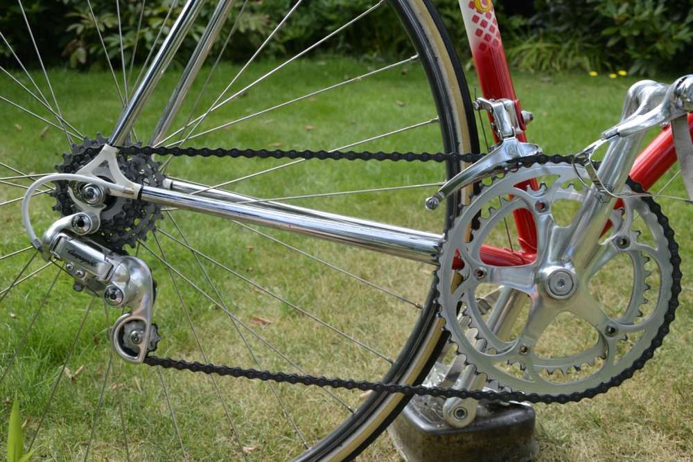 - 1978/79er Peugeot PS10 aus Reynolds 531, Zustand ist OK. Eine kleine Macke vor dem P, das Stronglight Innenlager 35x1 gibt es dazu, die linke Lagerschale "könnte" festsitzen, hab nicht das passende Werkzeug hier