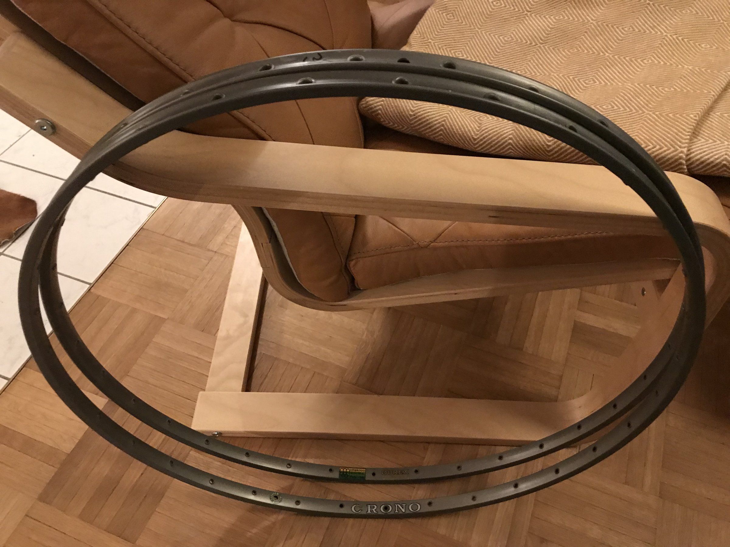 Neuwertige, auch quasi NOS Ambrosio Montreal Crono Schlauchreifenfelgen. 28“, 32 Loch, Farbe: grau. Da waren die d‘Alessandro Reifen mit dem Klebeband montiert, also keine Klebespuren vorhanden. Die Felgen habe ich NOS gekauft und dann mit den Pelissier Naben eingespeicht. Gefahren bin ich damit aber nie. Sie liegen plan auf und die Bremsflanken sind natürlich jungfräulich.