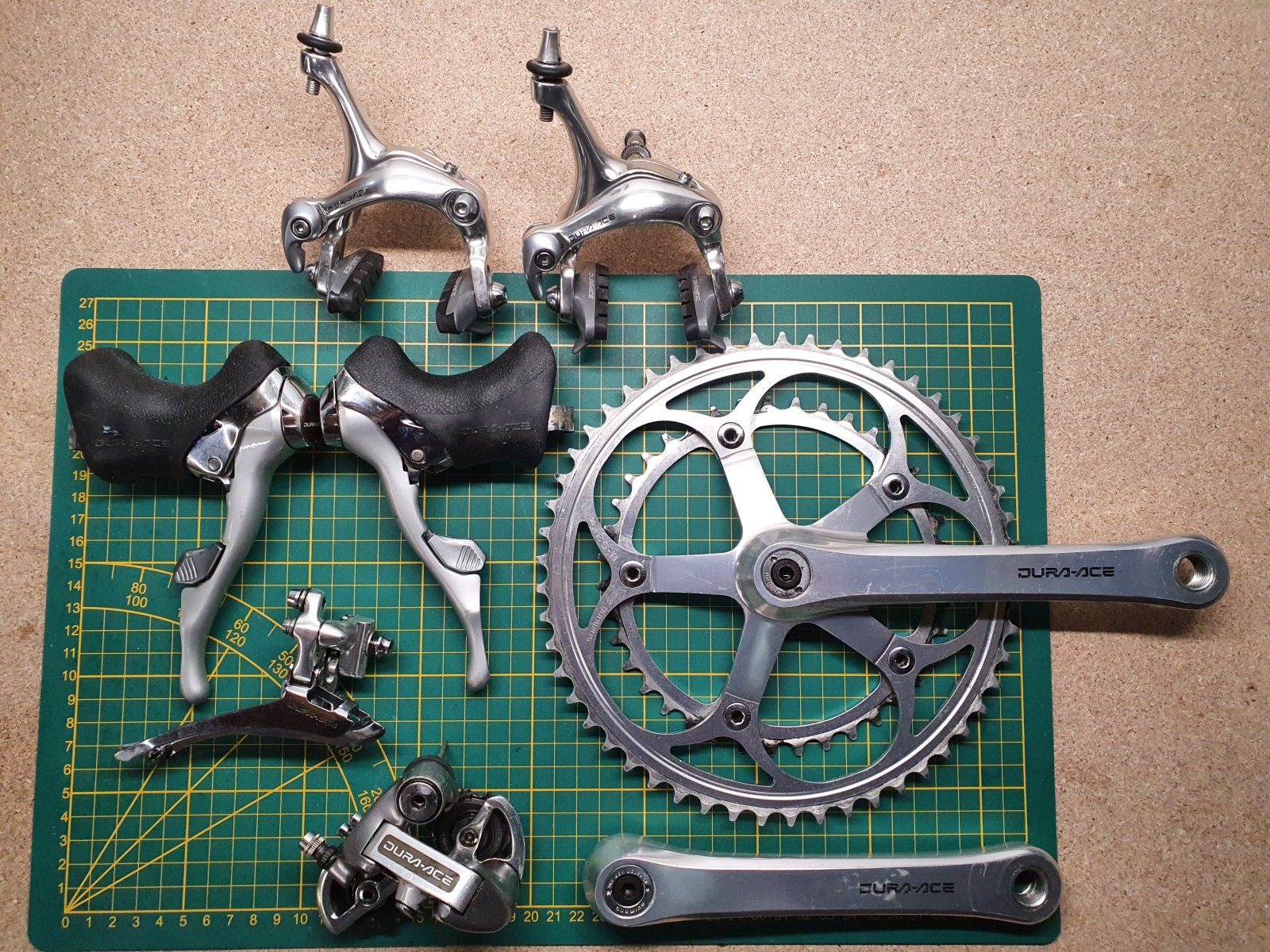 Würde mich von dieser 74er Dura Ace Grupoe trennen. Technisch alles top, bis auf den typischen (aber wohl stabilen) Riss im unteren Schaltröllchen. Alle Gewinde und Aufnahmen top. Technisch nicht Museumsniveau aber definitiv gut.