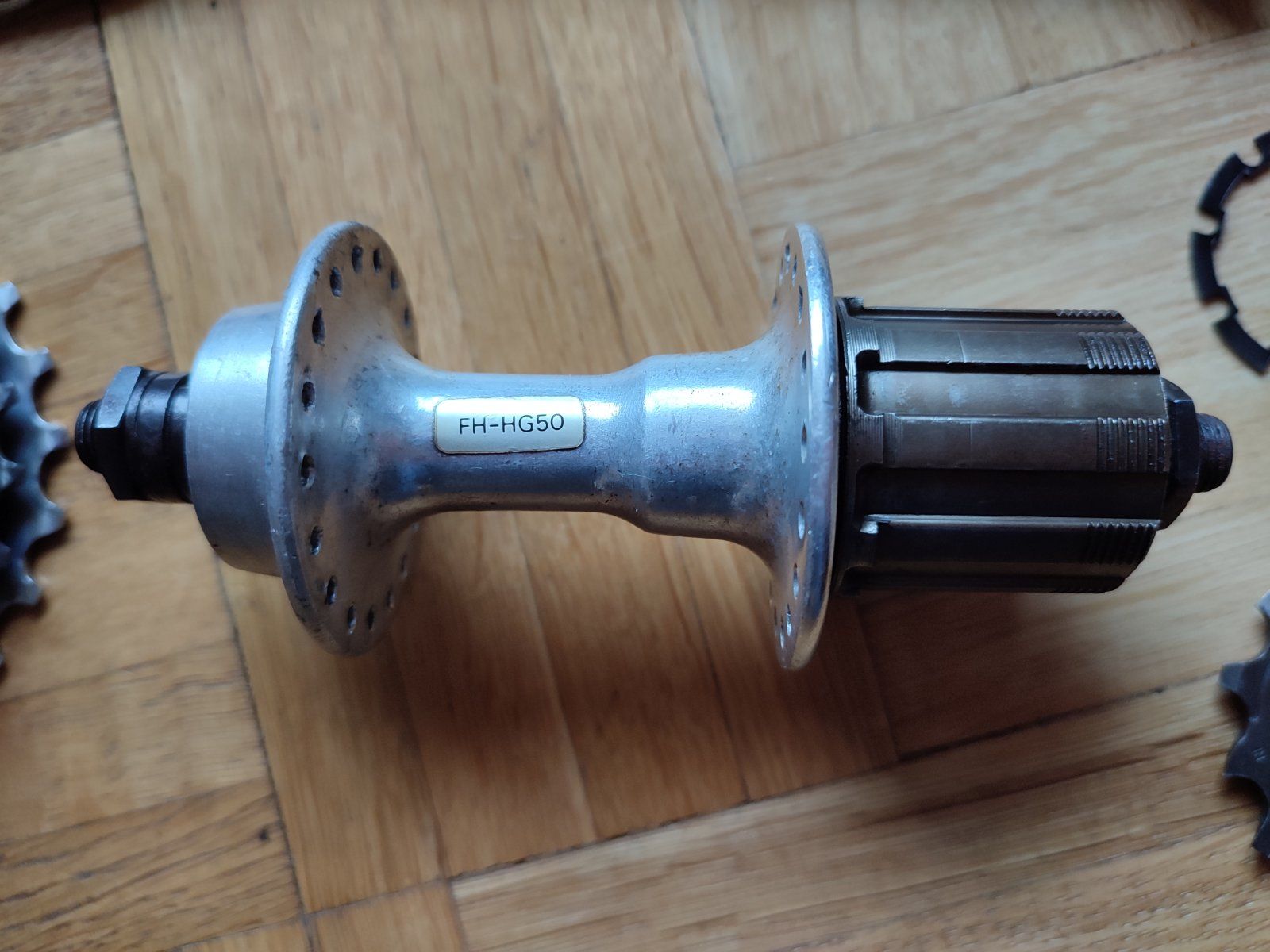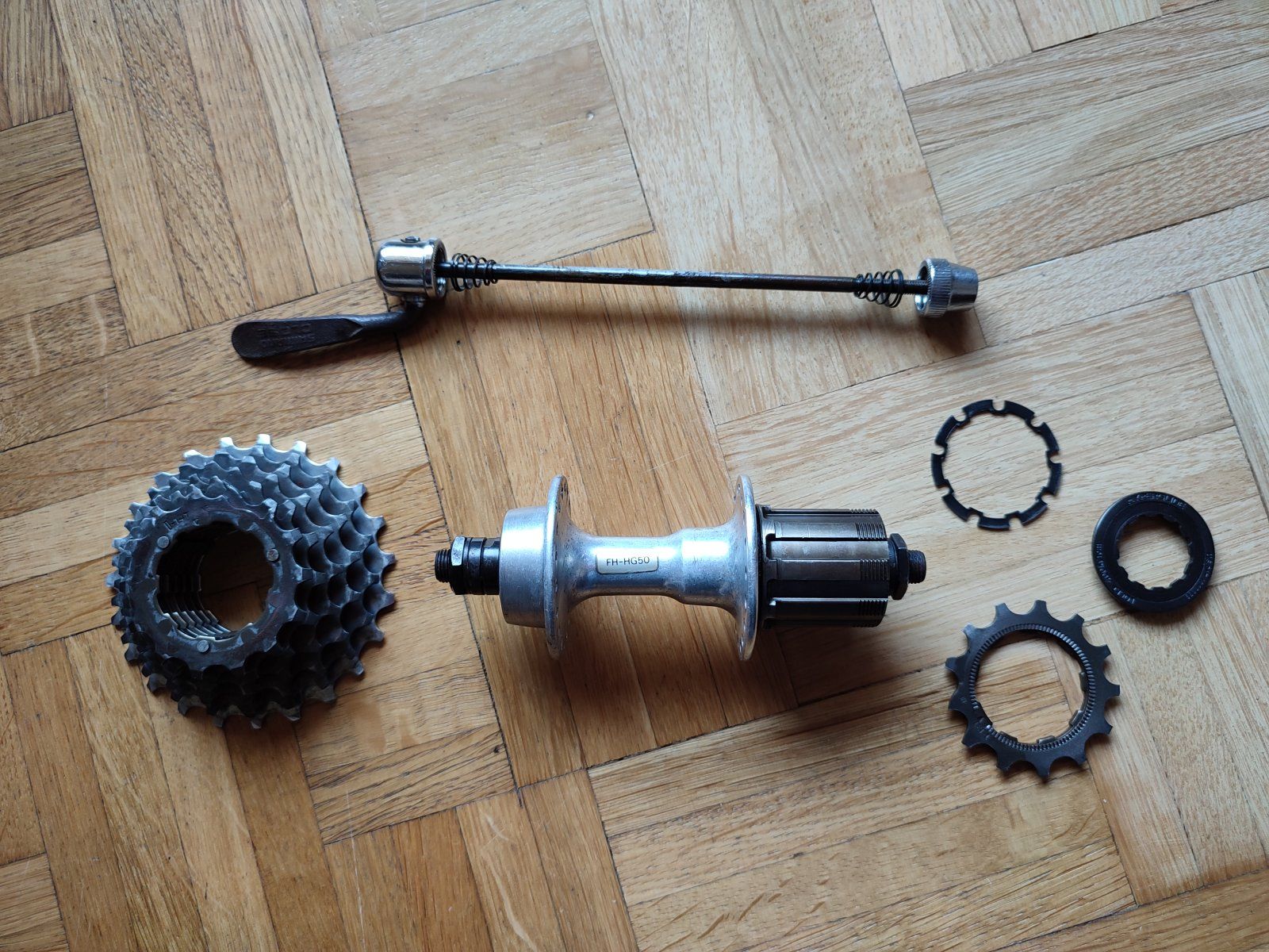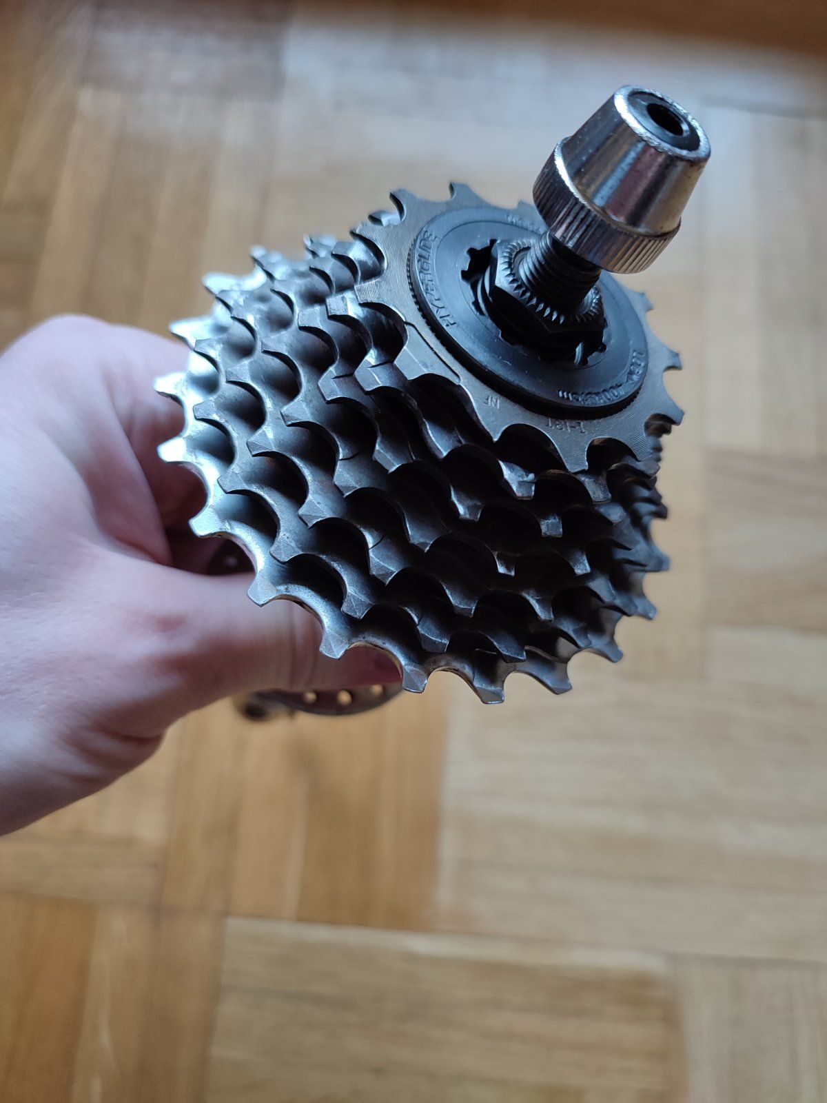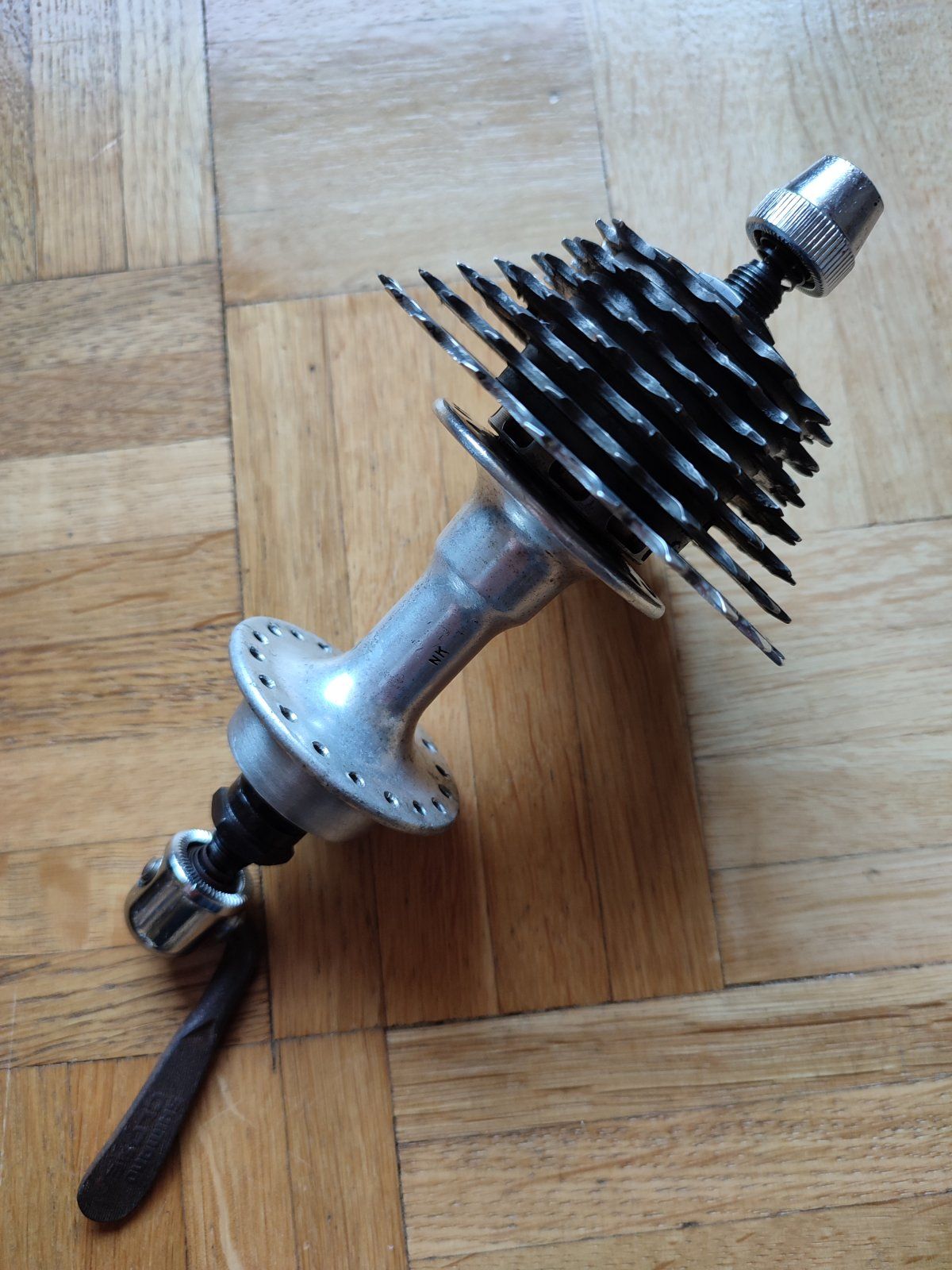 Für weitere 5 Euro haue ich gerne noch drei Schnellspanner (Suntour, Pelissier, Ofmega) zum Aufarbeiten und ne Sakae Sattelstütze mit 26,8mm dazu...Shimano FH-HG50 HR Nabe und 7fach Kassette Hyperglide, Schnellspanner mit Patina gibts dazu. Nabe dreht einwandfrei, aber sollte mal neues Fett rein. 13-23 Zähne.
