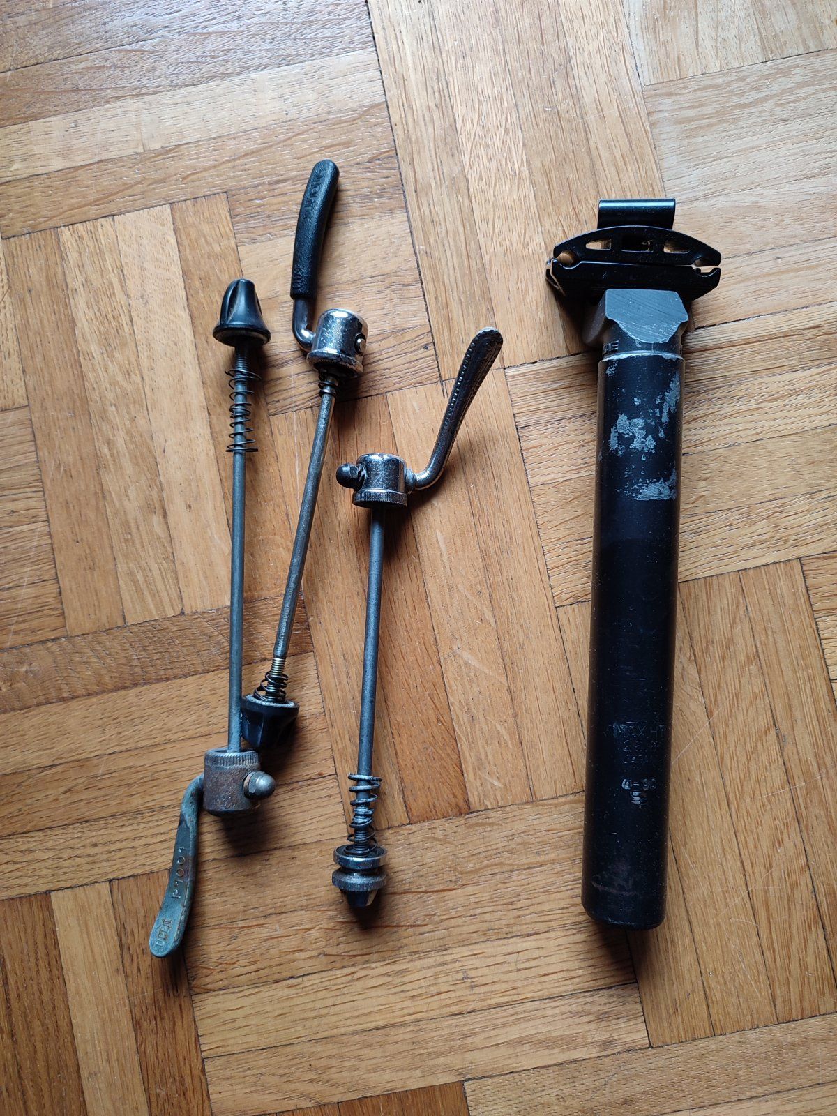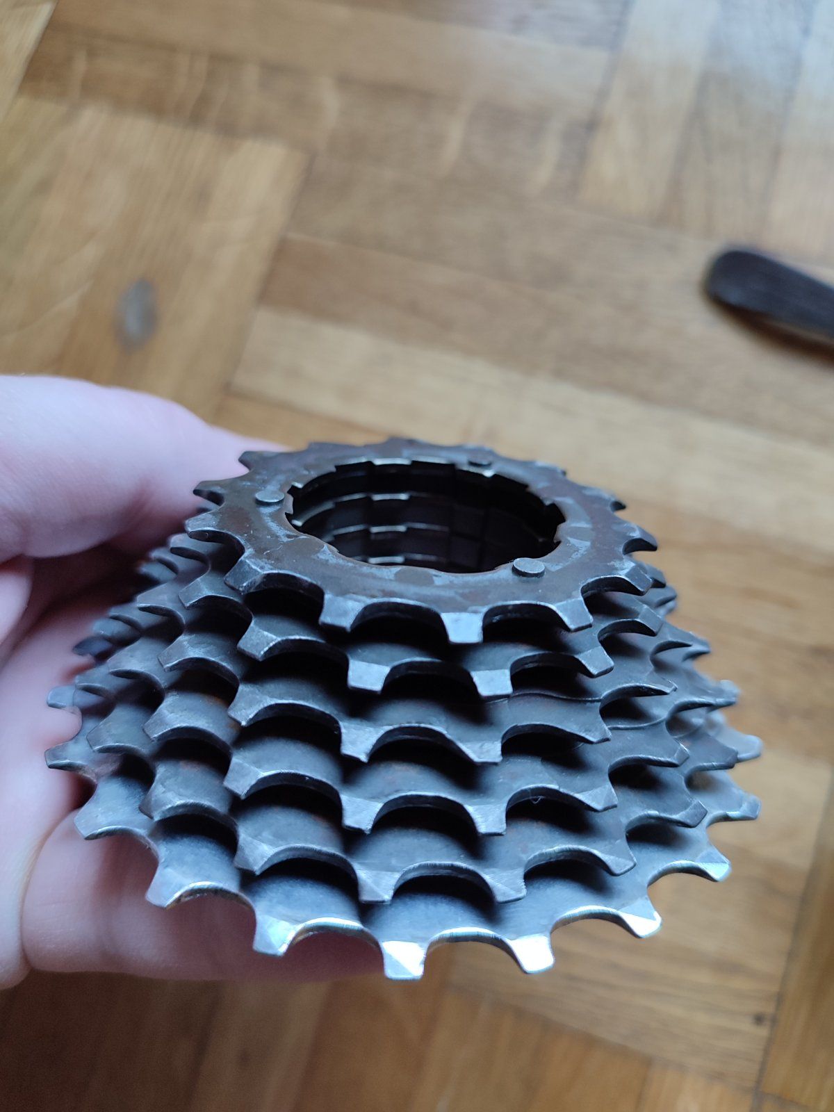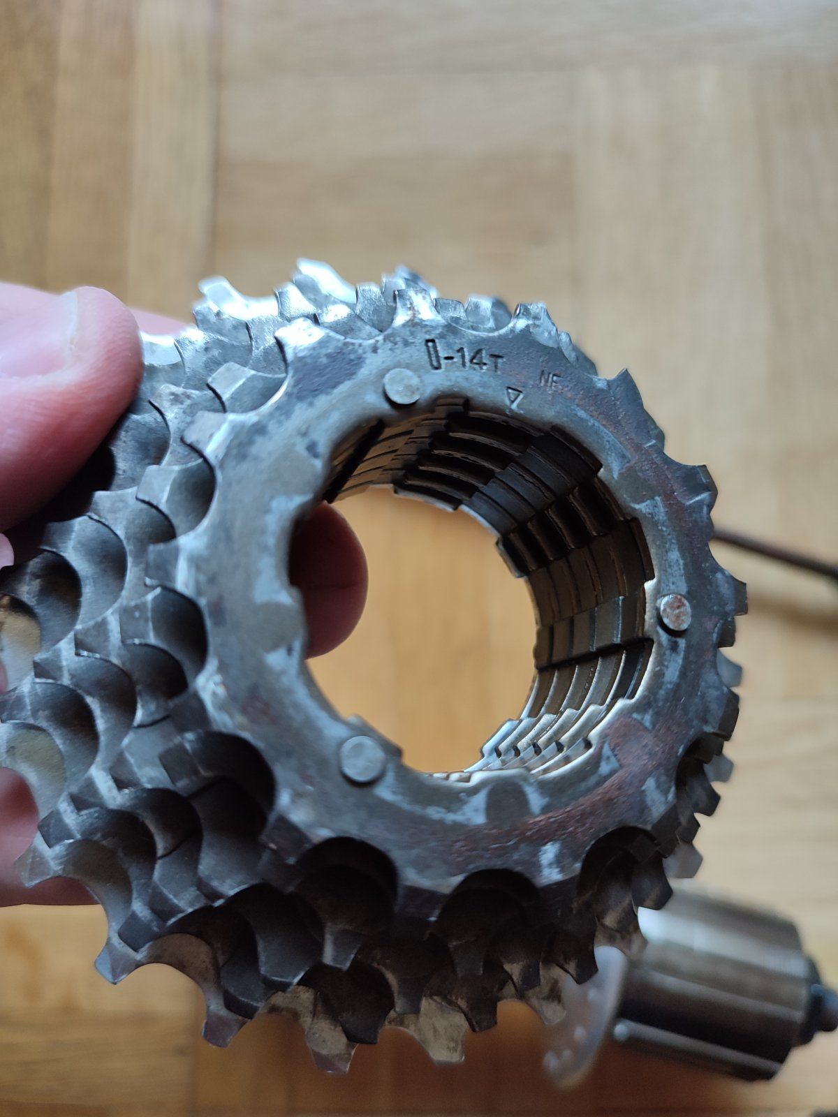 Für weitere 5 Euro haue ich gerne noch drei Schnellspanner (Suntour, Pelissier, Ofmega) zum Aufarbeiten und ne Sakae Sattelstütze mit 26,8mm dazu...Shimano FH-HG50 HR Nabe und 7fach Kassette Hyperglide, Schnellspanner mit Patina gibts dazu. Nabe dreht einwandfrei, aber sollte mal neues Fett rein. 13-23 Zähne.