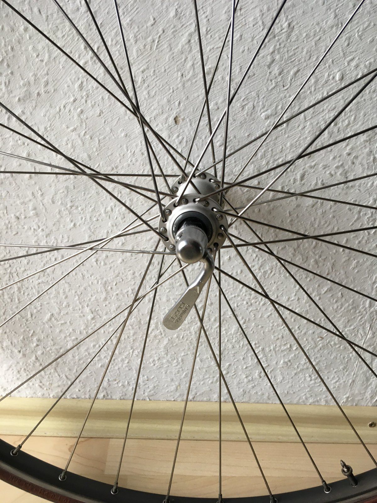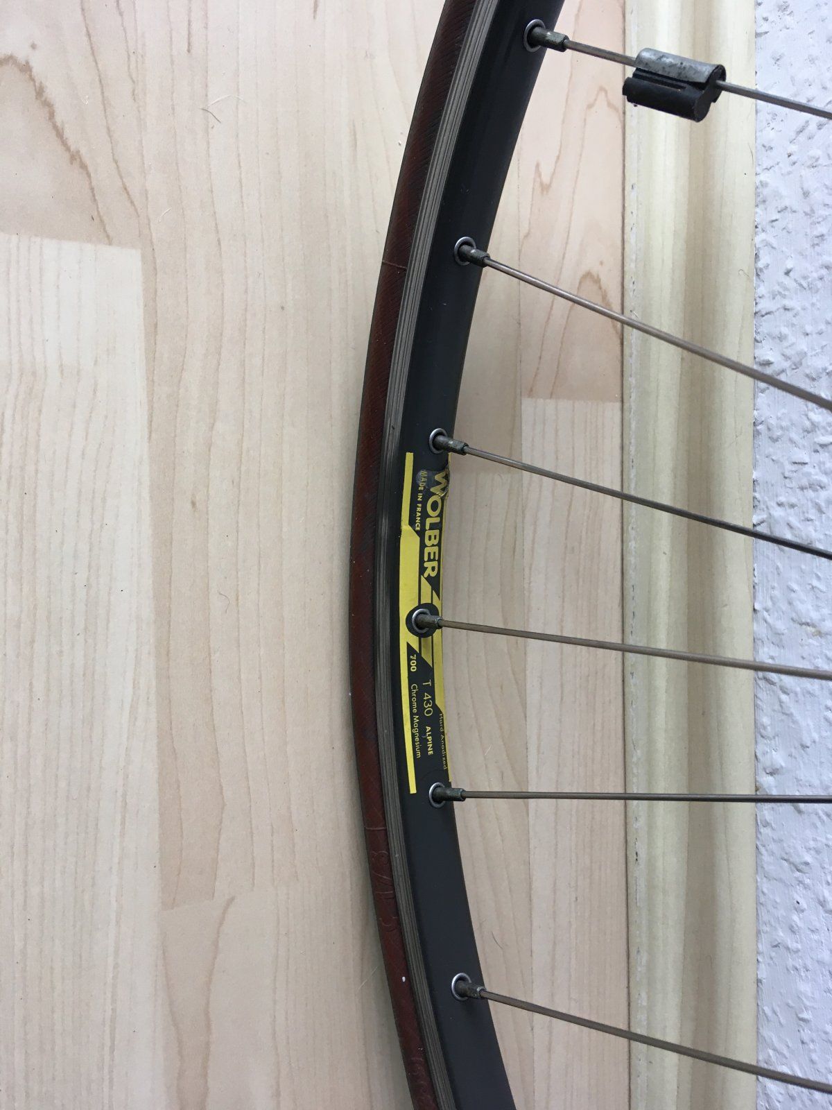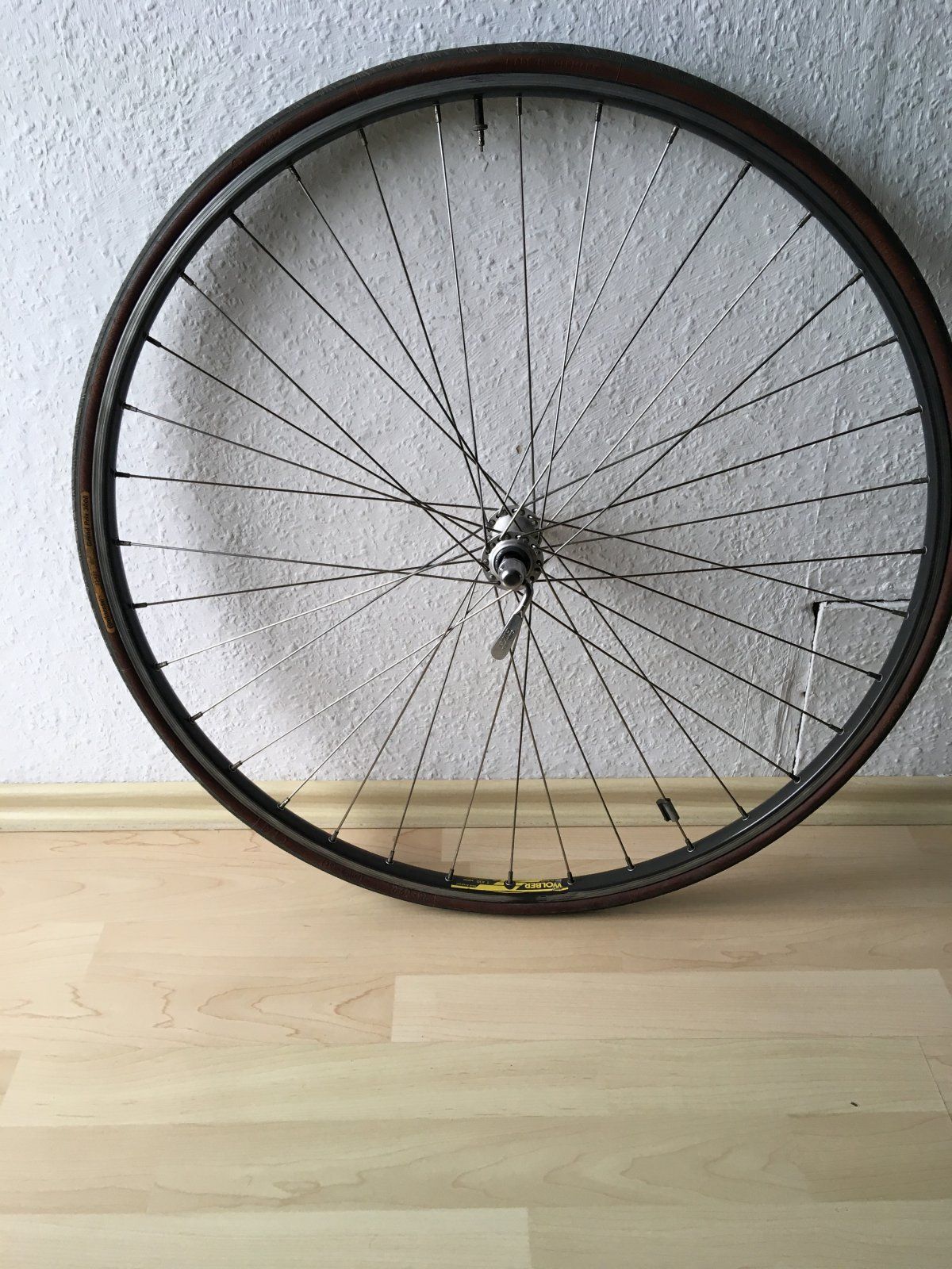Vorderrad Drahtreifenfelge Wolber T 430 Alpine / Nabe Shimano 105 HB-1055 icegrey 36h originaler Schnellspanner, grob gereinigt nicht gewartet, keine nennenswerten Schläge, schöner Zustand bis auf zwei krumme Speichen, weg