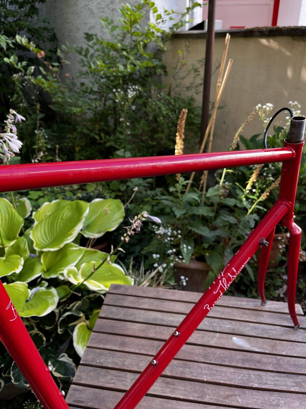 Verkaufe einen Bernd Herkelmann Rahmen - OR 57cm m-m / SR 58cm m-o. BSA Tretlager, 27,0mm Sattelstützen Maß, Campagnolo Ausfallenden, Cinelli Tretlager Muffe, Innenverlegte Züge.