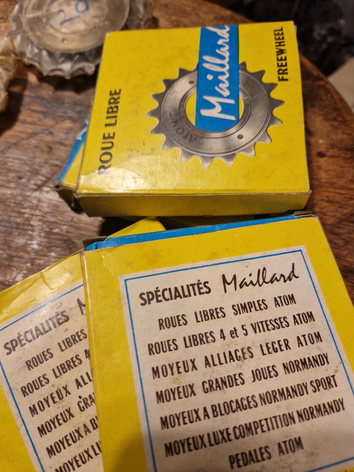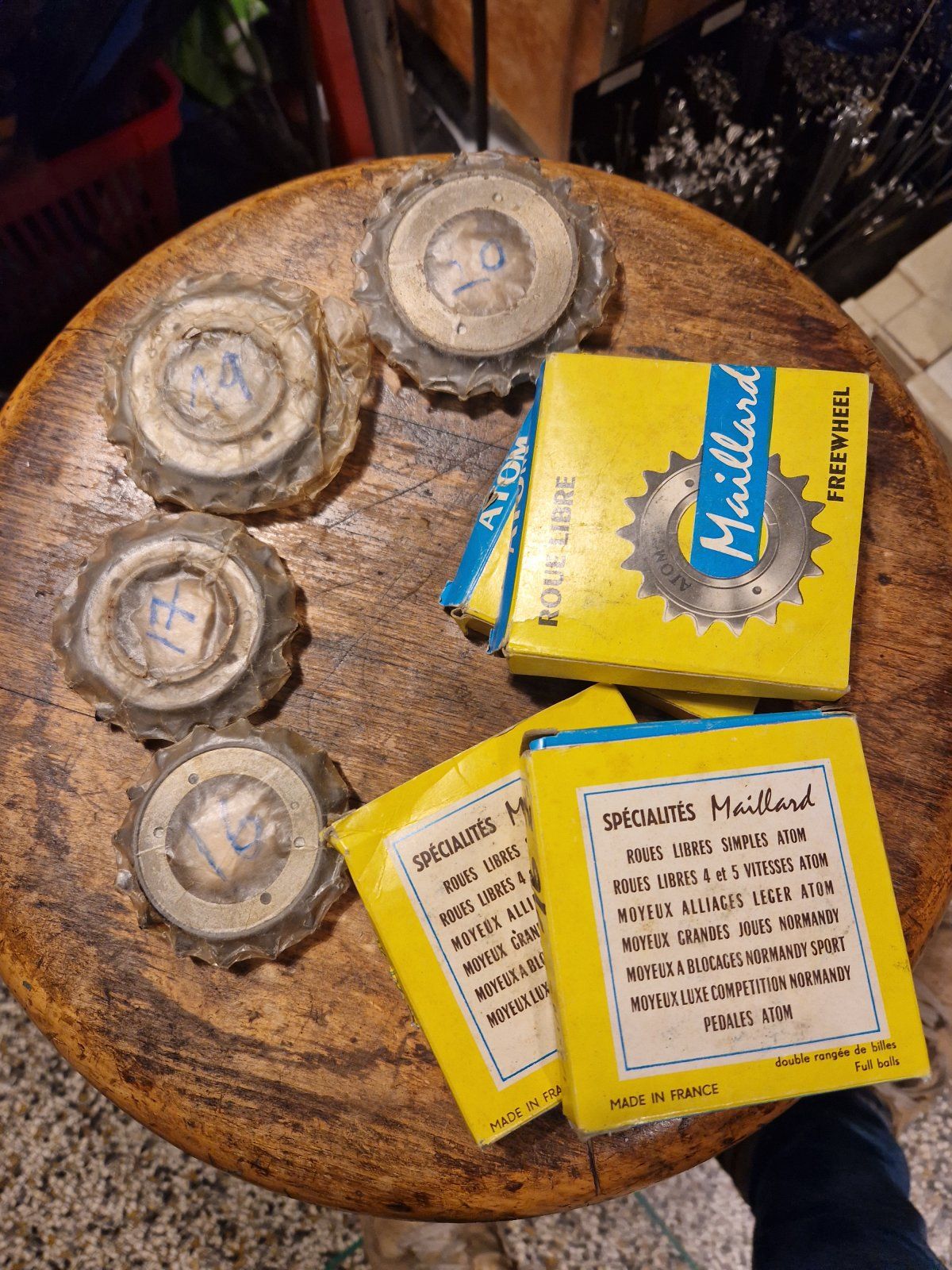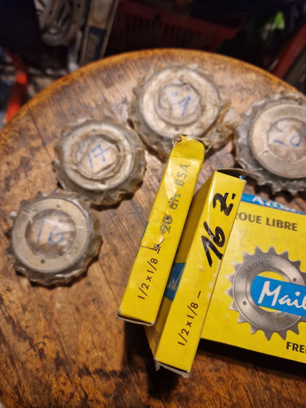 1 davon auf der Nabe + 3 in der Trikottasche+Abzieher — das wird ne Klassikerausfahrt in die Berge...4x NOS singlespeed Freiläufe maillard für halb zoll Kette bsa 16 17 19 20