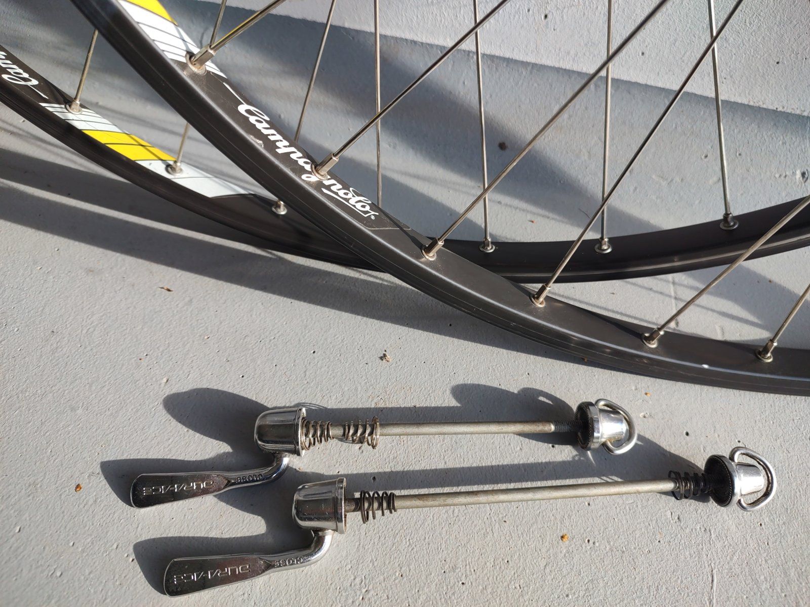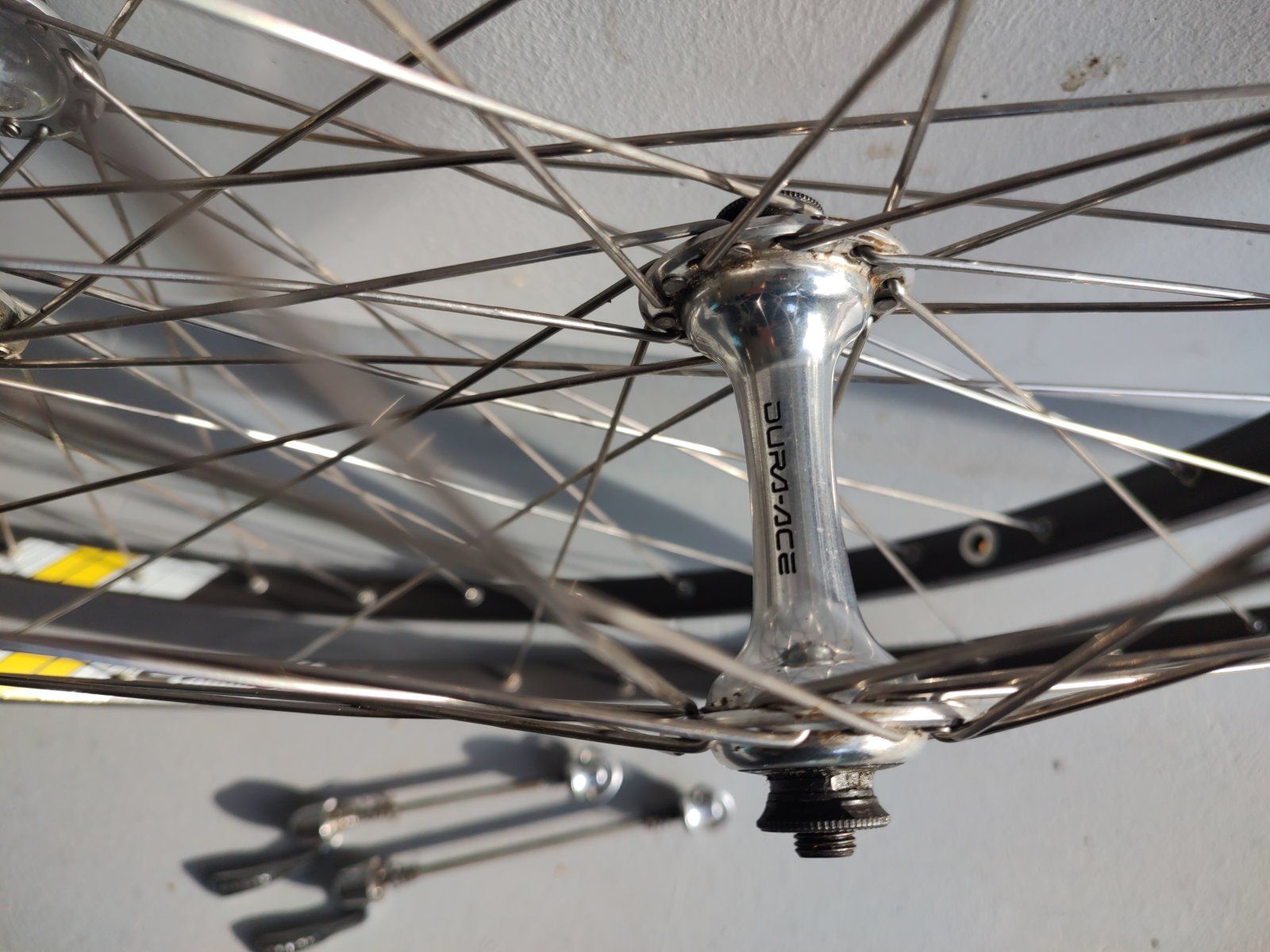 Es müssten alles, außer Reifen, Originalteile aus der Zeit sein. Es fehlen die Bremshebelhoods und ein Lenkerstopfen. Pedale sind keine dabei, waren Shimano RR-Klicks späterer Bauart drauf, vielleicht finde ich noch die Originalen im Keller meiner Eltern. Neues Lenkerband könnte es auch brauchen. Ansonsten komplett fahrbereit.