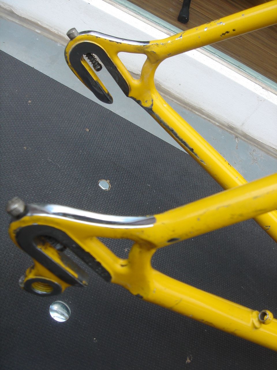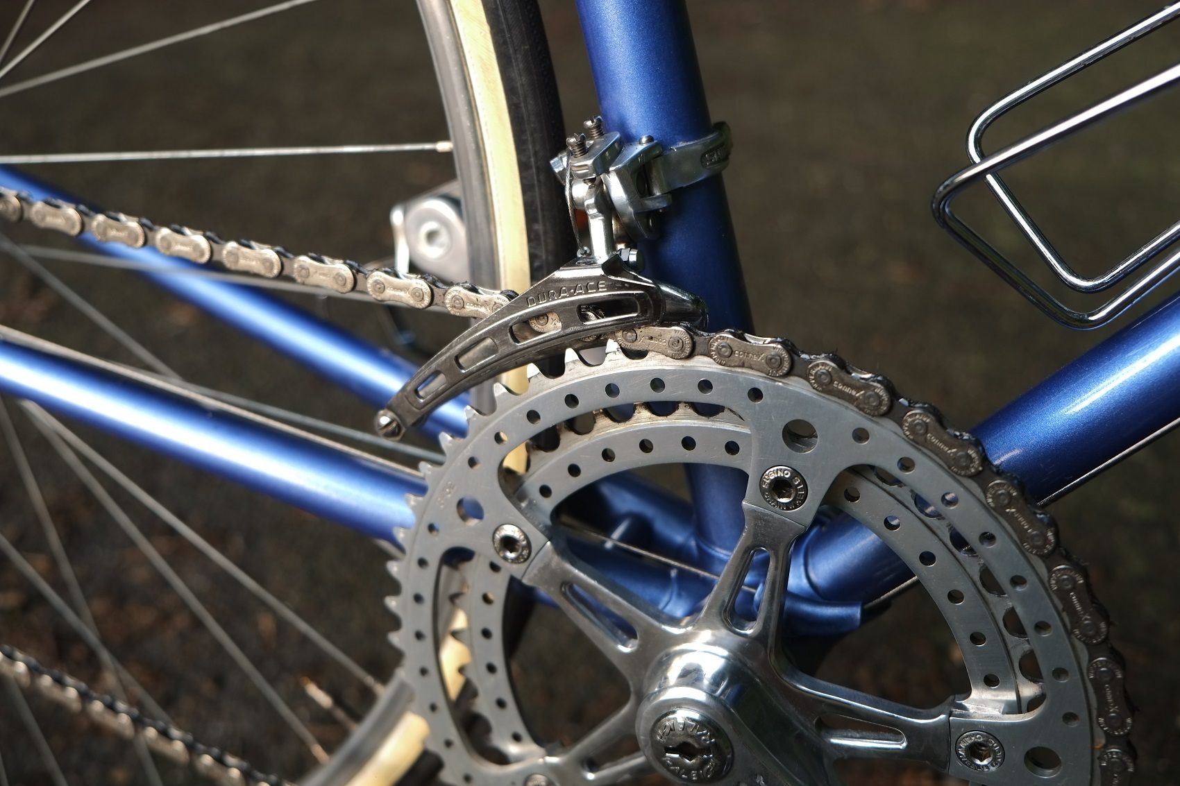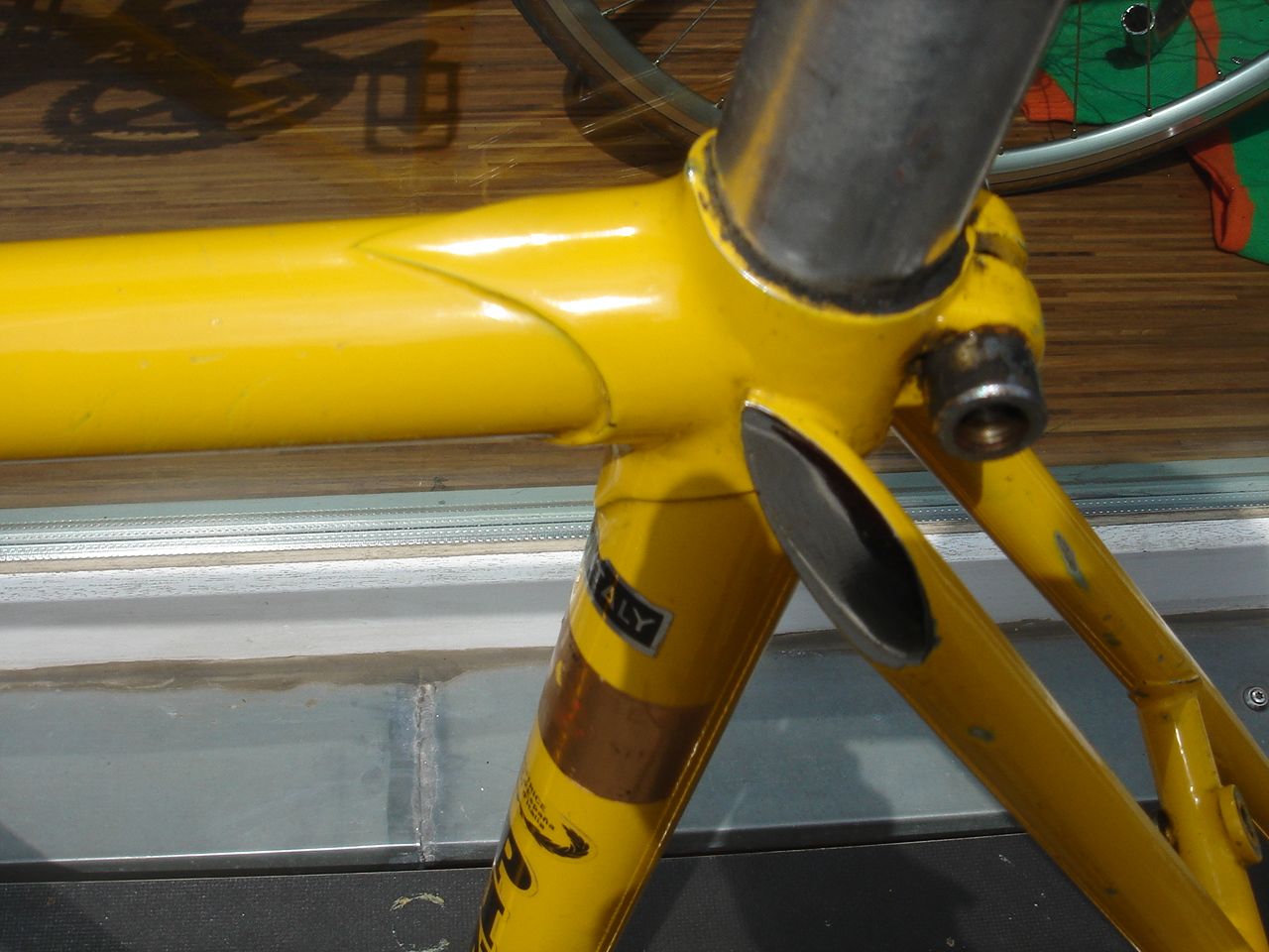 Der Rahmen hat Zeus Ausfallenden, Columbus SL Rohre (an den Kettenstreben schimmert die Taube durch den Lack), Nervex Tretlagermuffe und möglicherweise (98,9%ig) Cinelli Muffen.