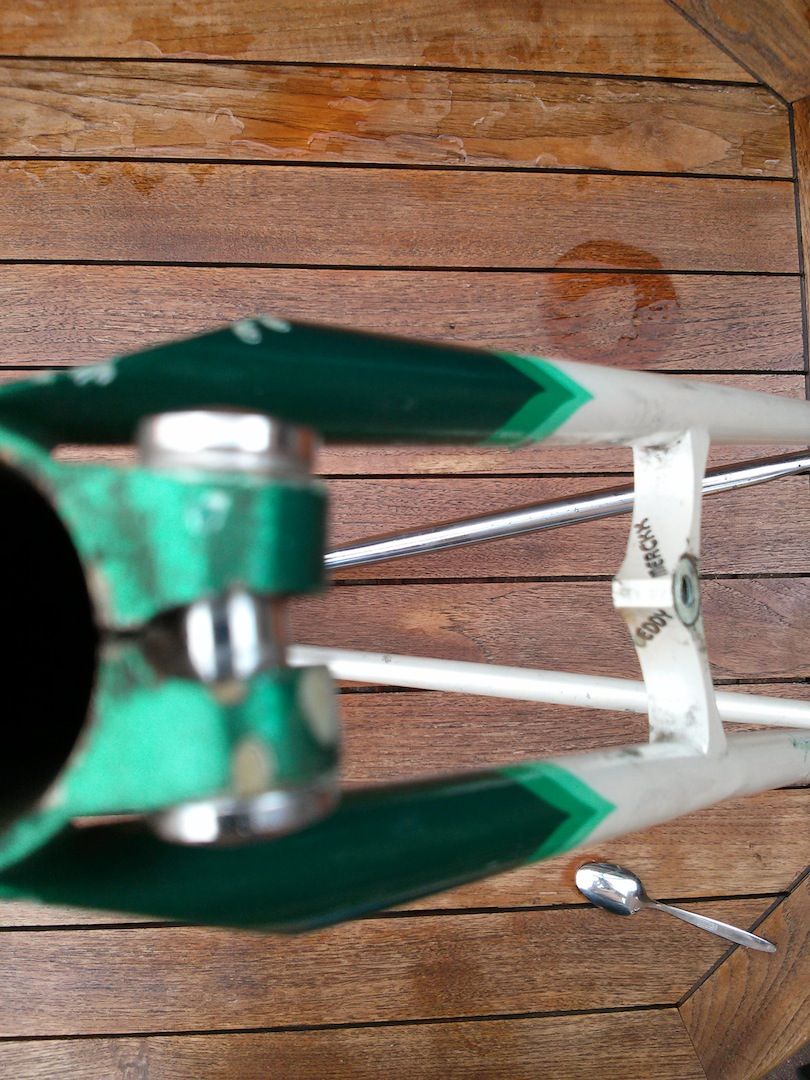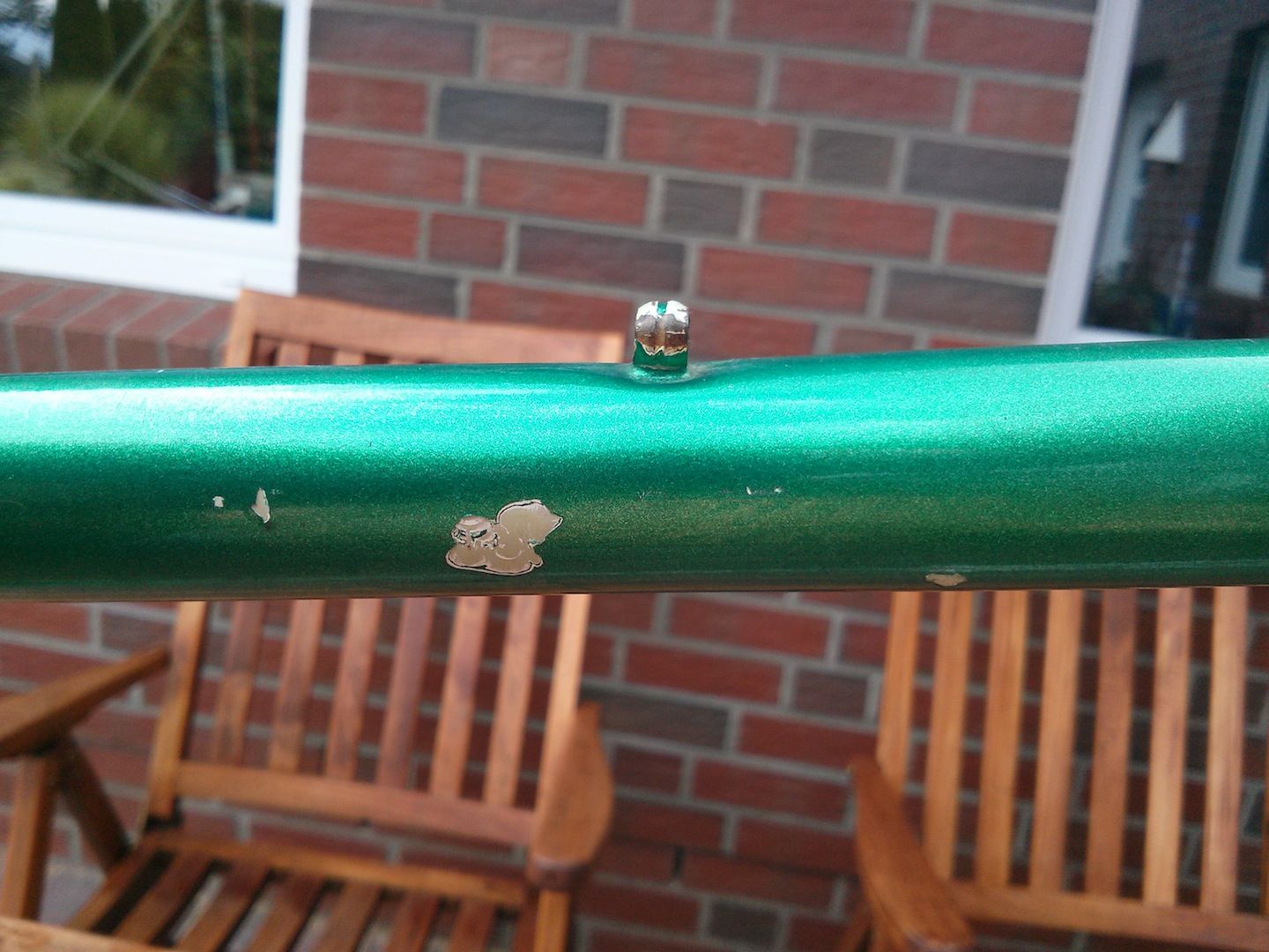 Der Zustand der Lacks ist grandios, es hat fast NOS Qualität, und Macken zu finden ist recht schwer, hier und da ein minimalstes (ca. 1mm) Fleckchen die man auf Grund der Größe nicht abfotografieren kann. Unten an der Tretlagermuffe, sind Abdrücke und Spuren von den Schaltzügen zu sehen. An den Hinterbaustreben, kleine Abweichungen im Lack, aber aufs Foto bekomme ich das wirklich nicht.