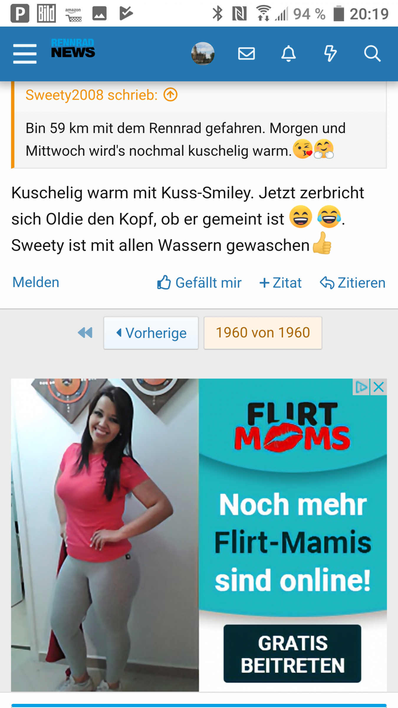 Kuschelig warm mit Kuss-Smiley. Jetzt zerbricht sich Oldie den Kopf, ob er gemeint ist ? ?. Sweety ist mit allen Wassern gewaschen?Bin 59 km mit dem Rennrad gefahren. Morgen und Mittwoch wird's nochmal kuschelig warm.??